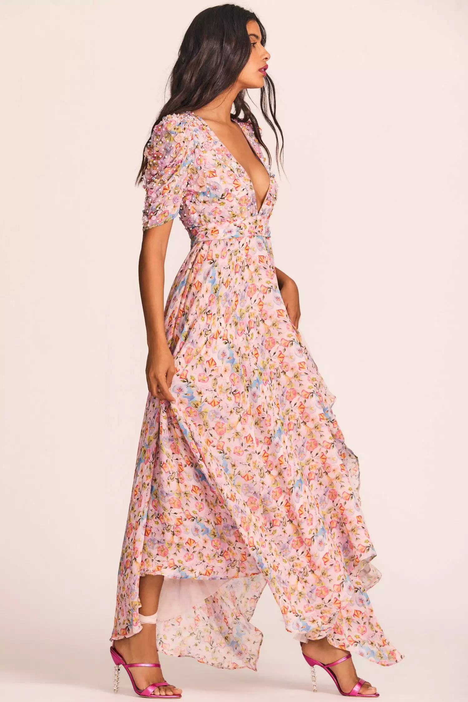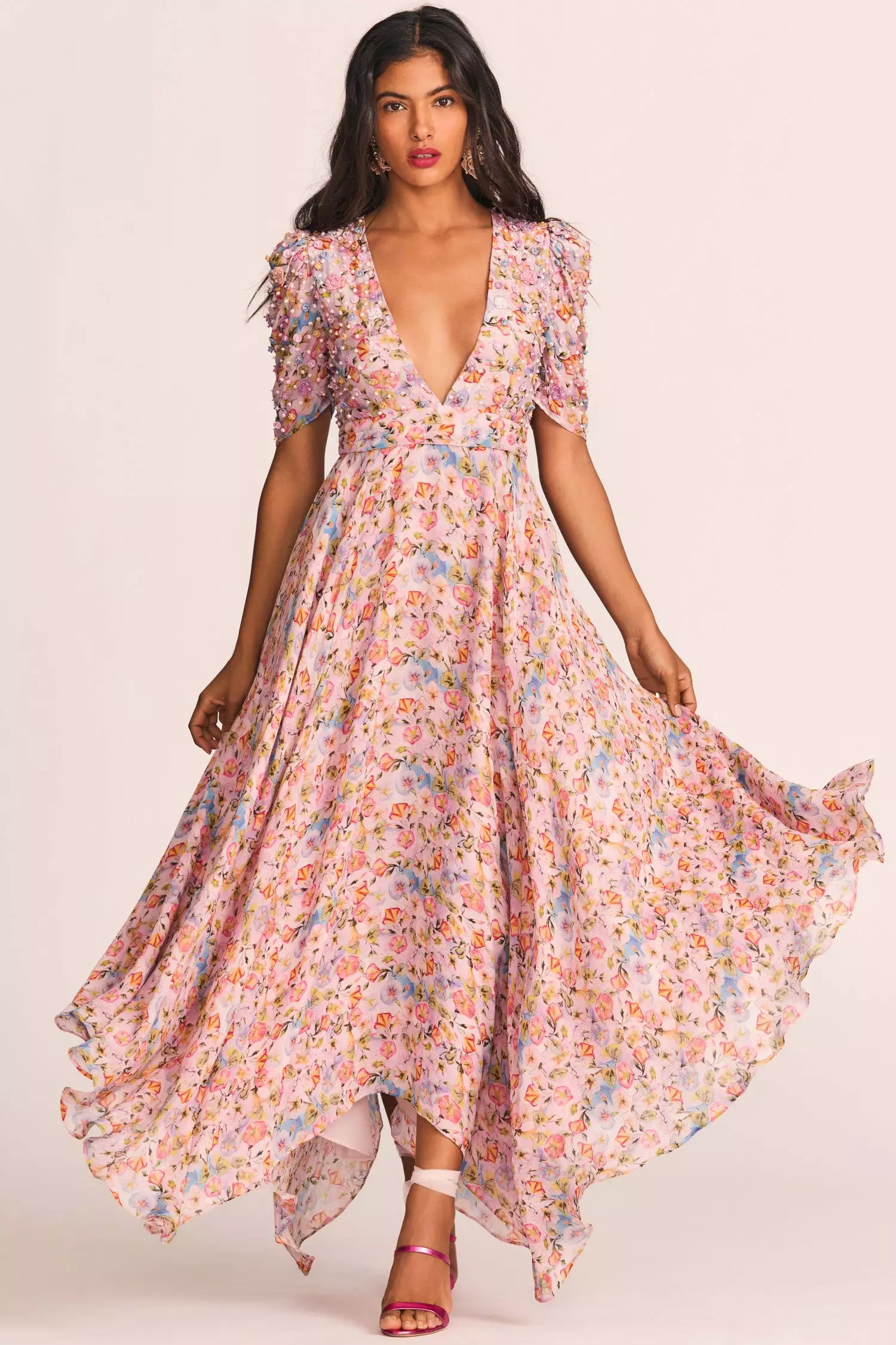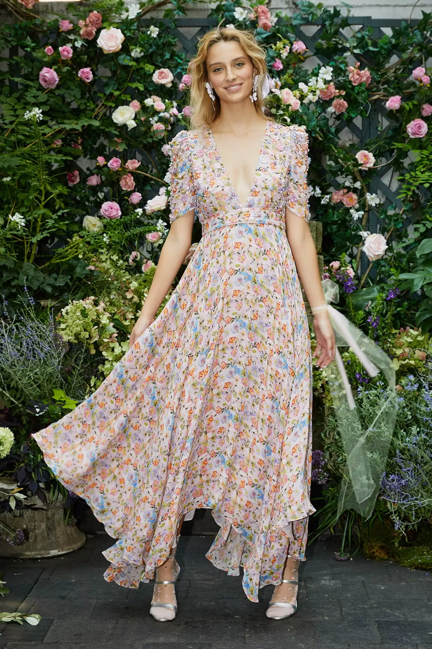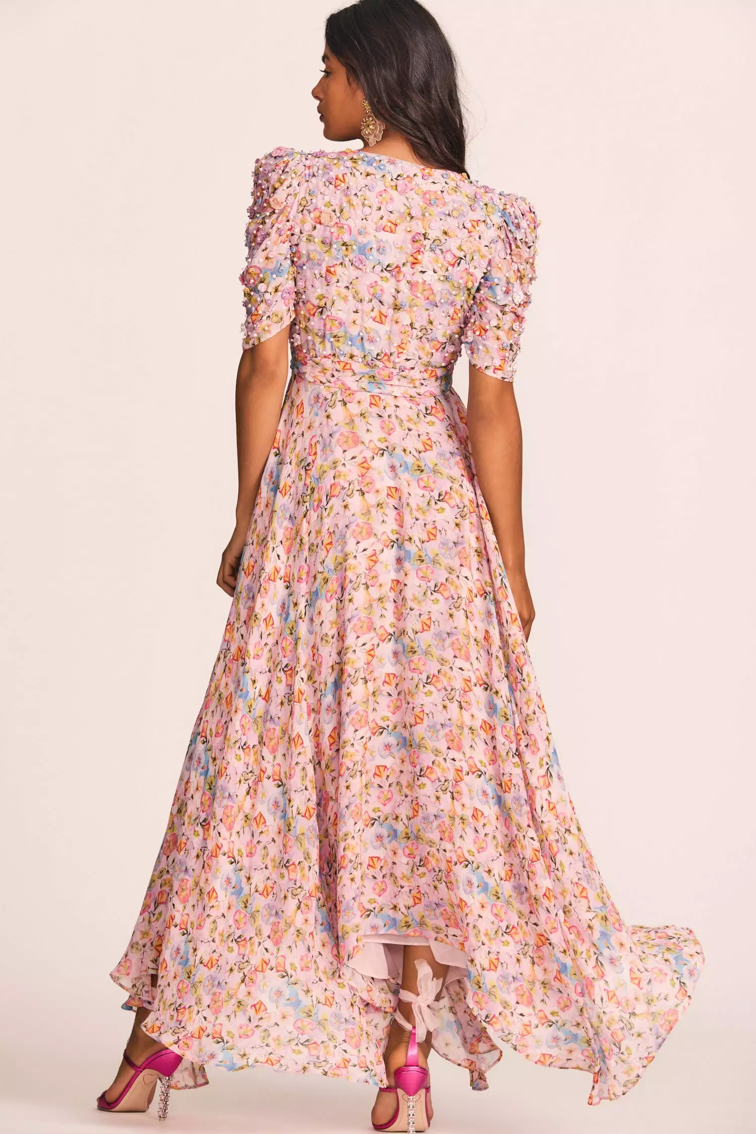 Our new Akira Dress blooms in textured chiffon with a hand-painted watercolor floral print, handmade flower appliqués and beading. This maxi-length dress has a plunging v neckline, shirred puffed sleeves that rise at the inner arm, shirring at the empire waist and a full sweep skirt with a handkerchief hem. Shown here in Pastel Confetti.