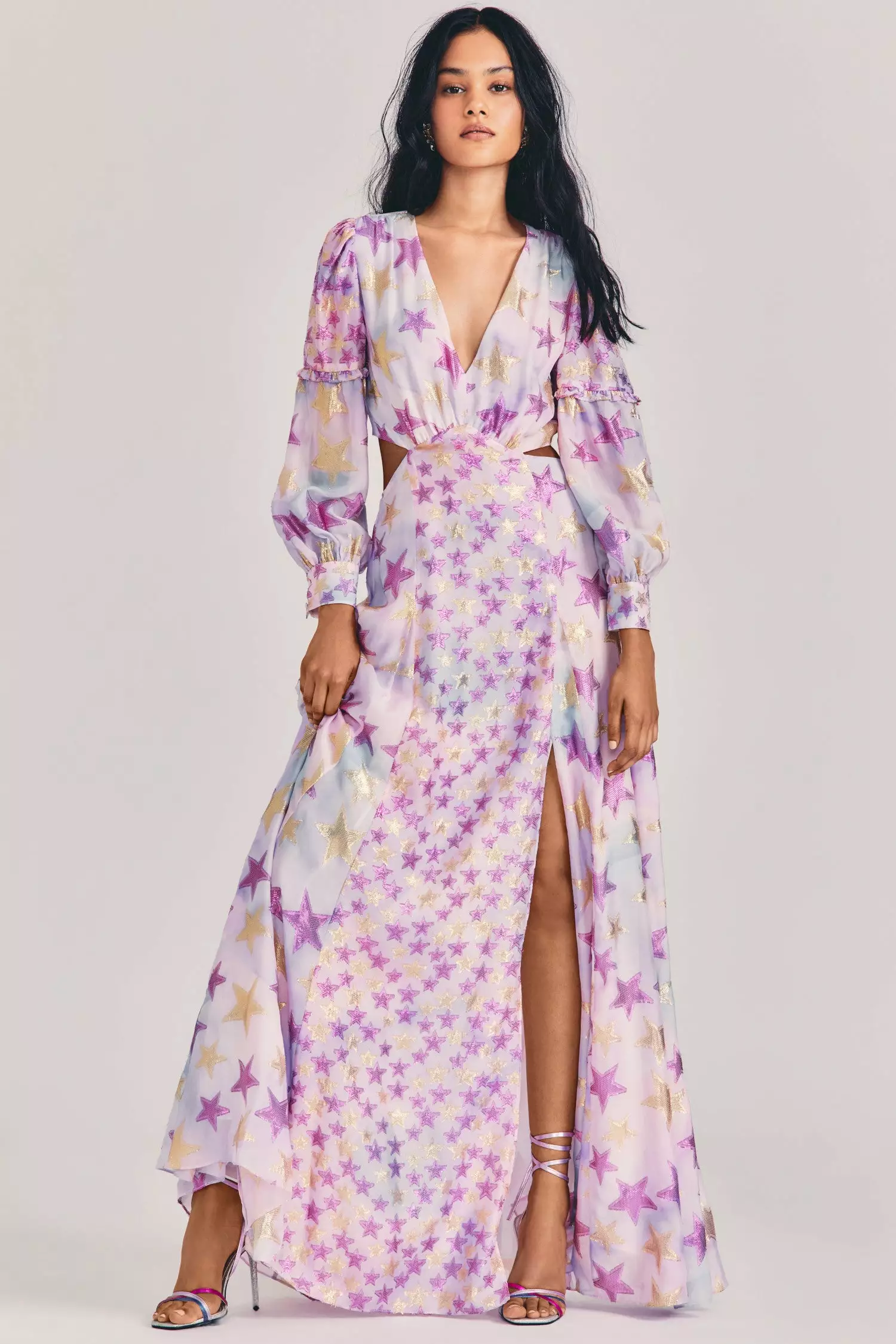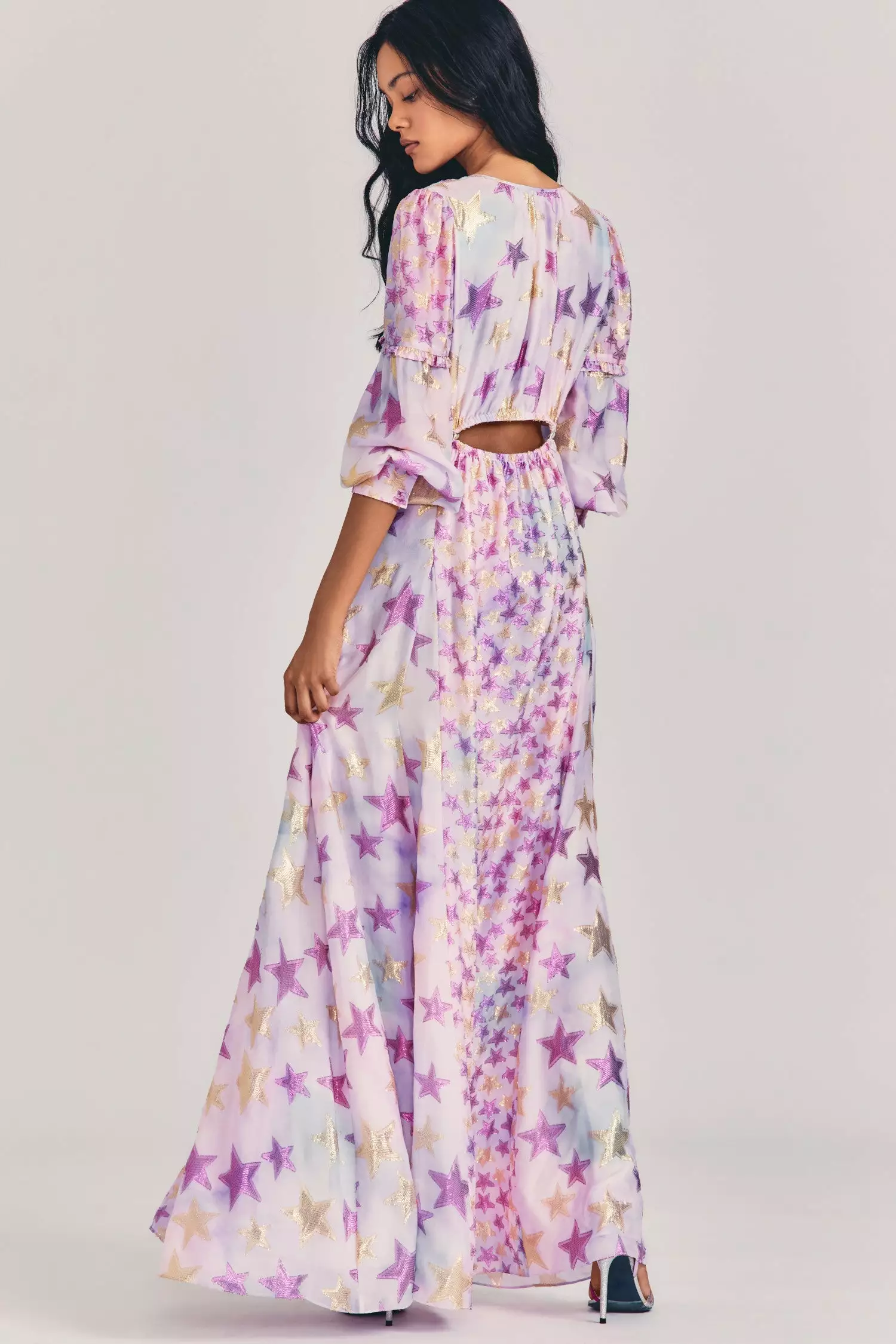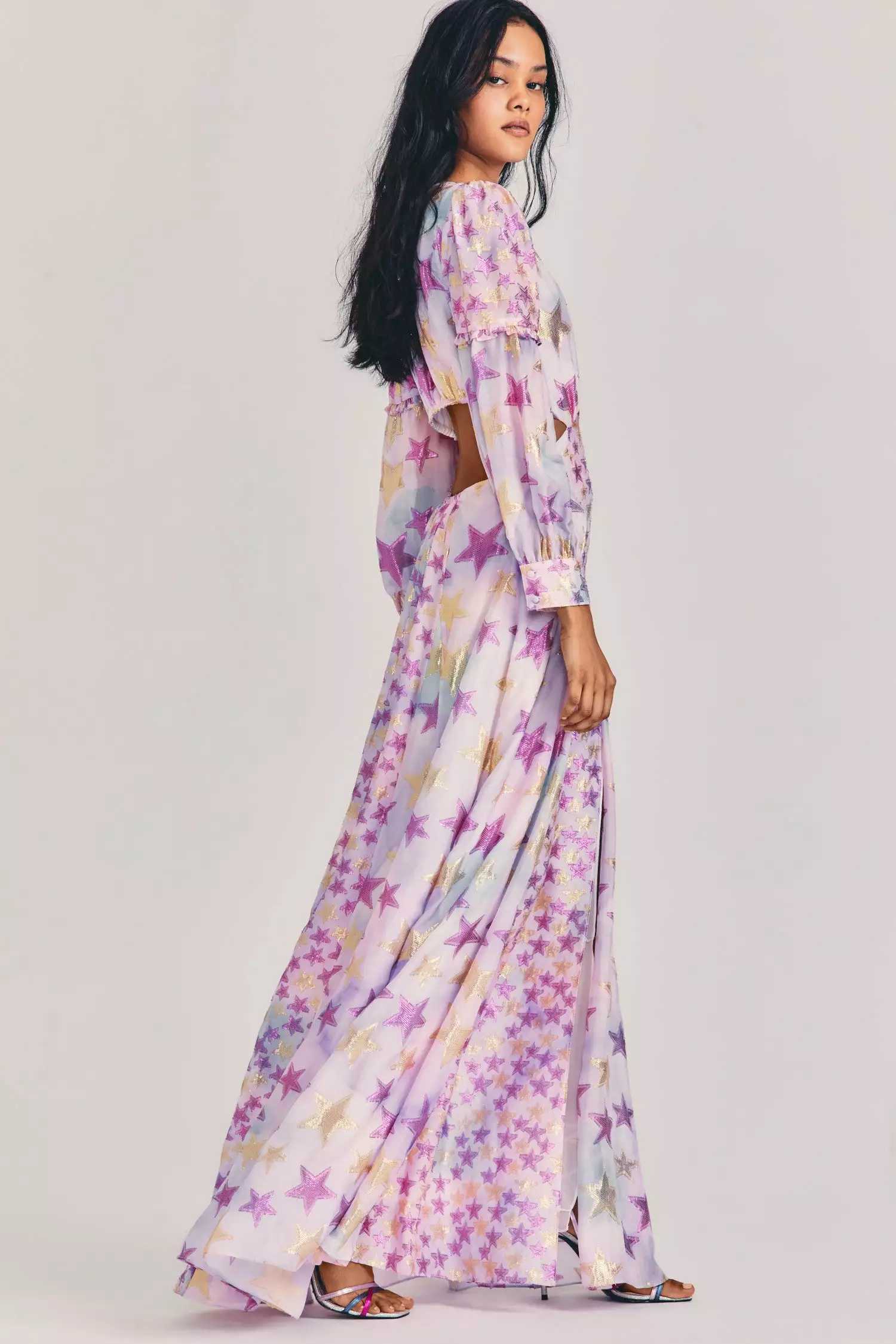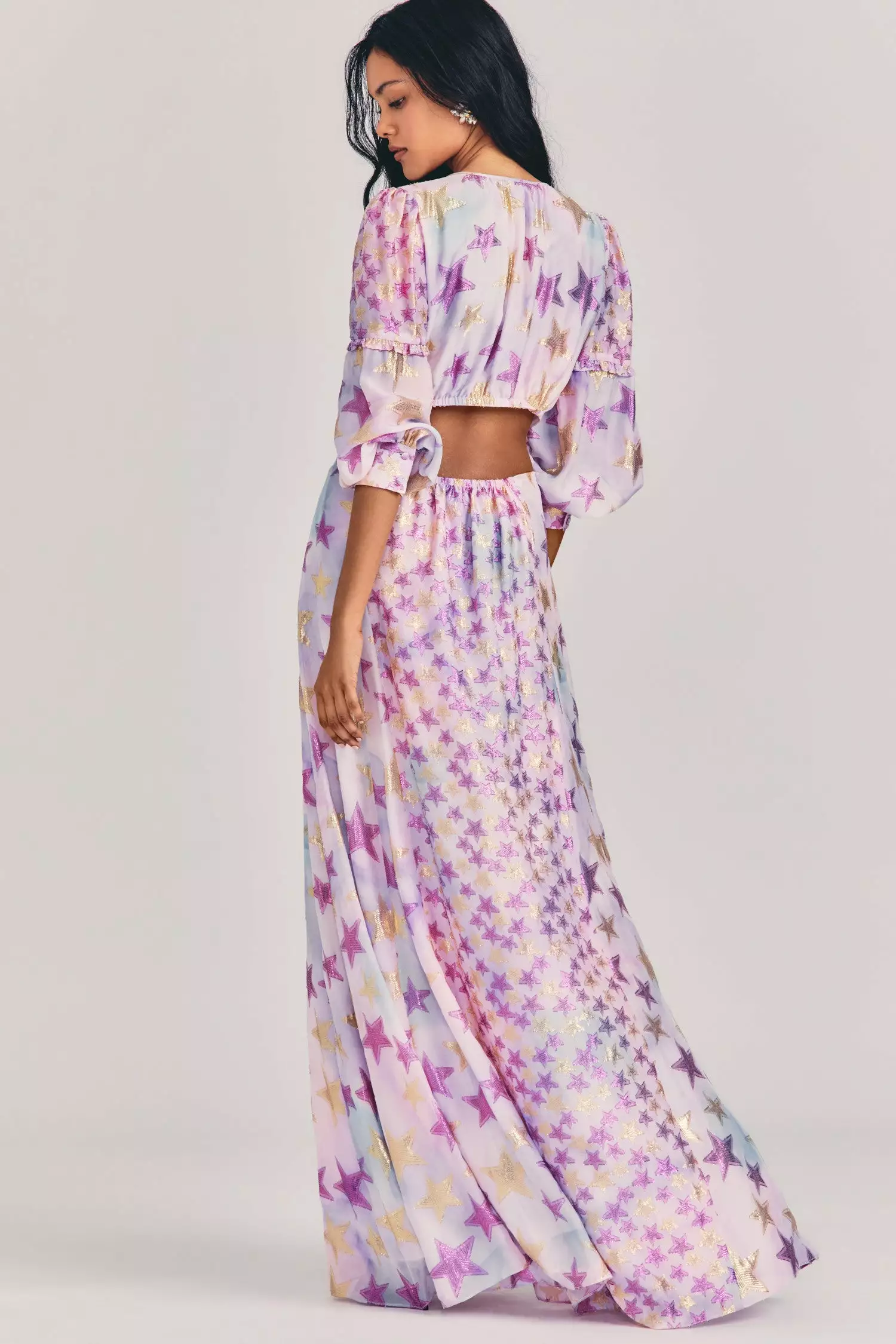 Our Aneesha Dress keeps the night young in a custom multi-sized lurex star print. This showstopper has a deep v-neck, sleeves that drop to ruffles above sheer panels with buttoned cuffs at opening. Cutouts at the side-waist bisect the bodice, forming an elastic-trimmed reveal at low back. The skirt has a mile-high slit at wearers left thigh and drapes to the floor. Shown here in Sweet Ocean Blue.