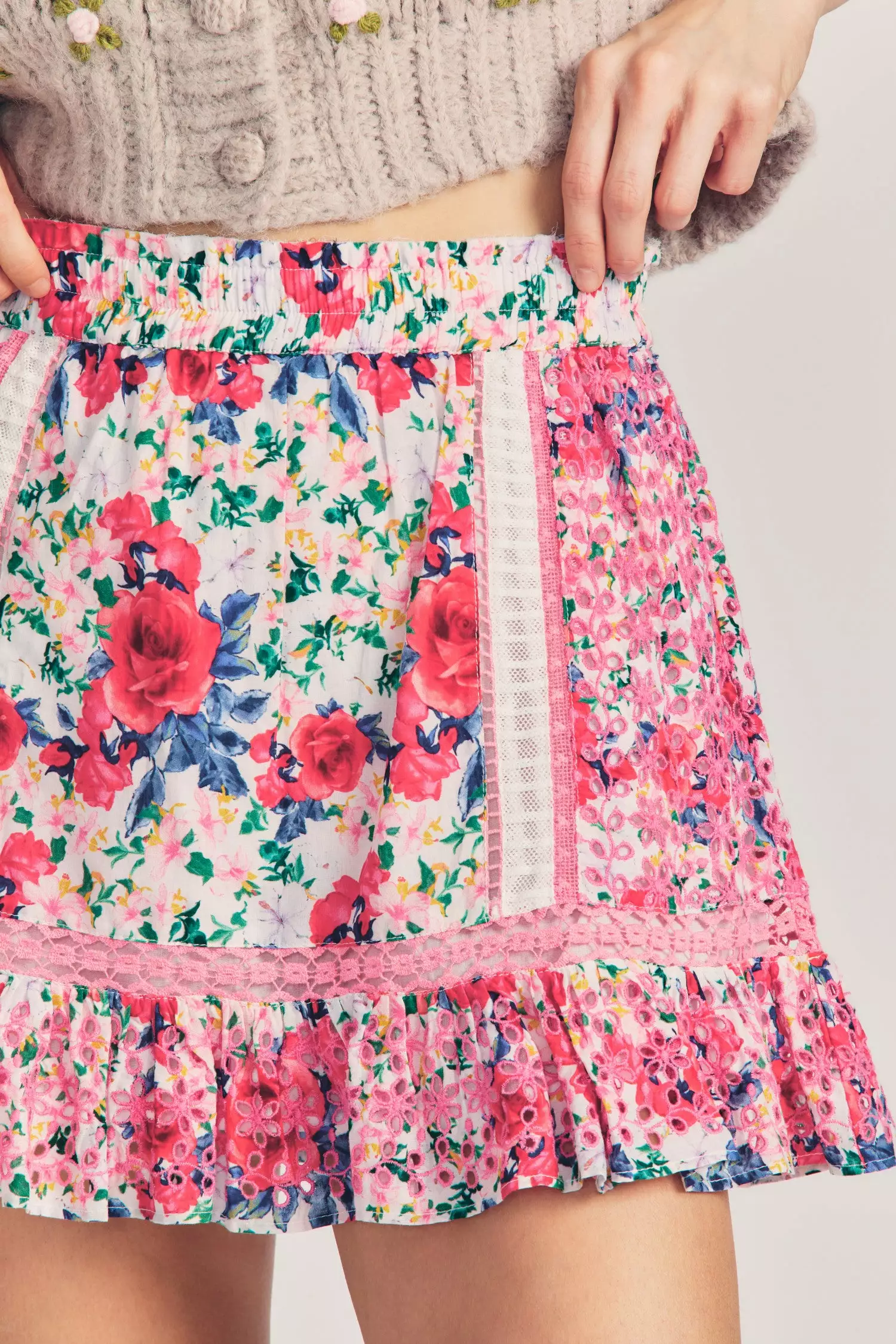 Our Victorian-inspired Baydar Skirt debuts in 100% cotton with contrast schiffli embroidery, inset lace panels and a hand-painted custom rose print. This intricate miniskirt has a shirred elastic waistband, inset embroidery lining the princess seams and a horizontal lace panel above a shirred flounce at bottom. Style it with our Emilie Wool Cardigan. Shown here in Rush of Red.