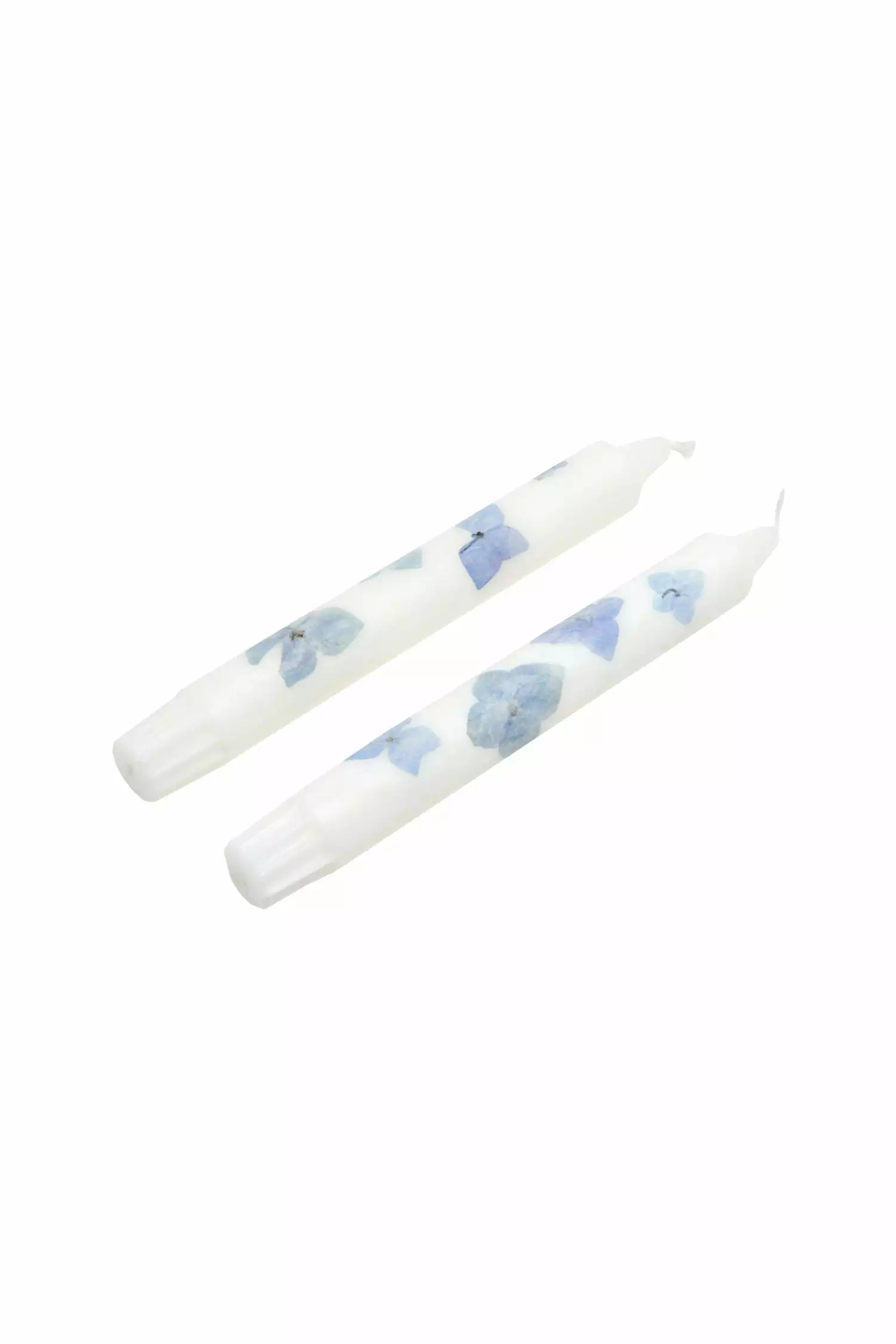 Set the mood with this pair of blue hydrangea candlestick by Croak and Bloom. Each candle is hand-picked and sustainably harvested in Washington. These hand-pressed candles are adorned with real seasonal pressed flowers. Each is unscented and made using stearin wax, which creates the lowest CO2 emissions of all wax. Shown here in Blue.
