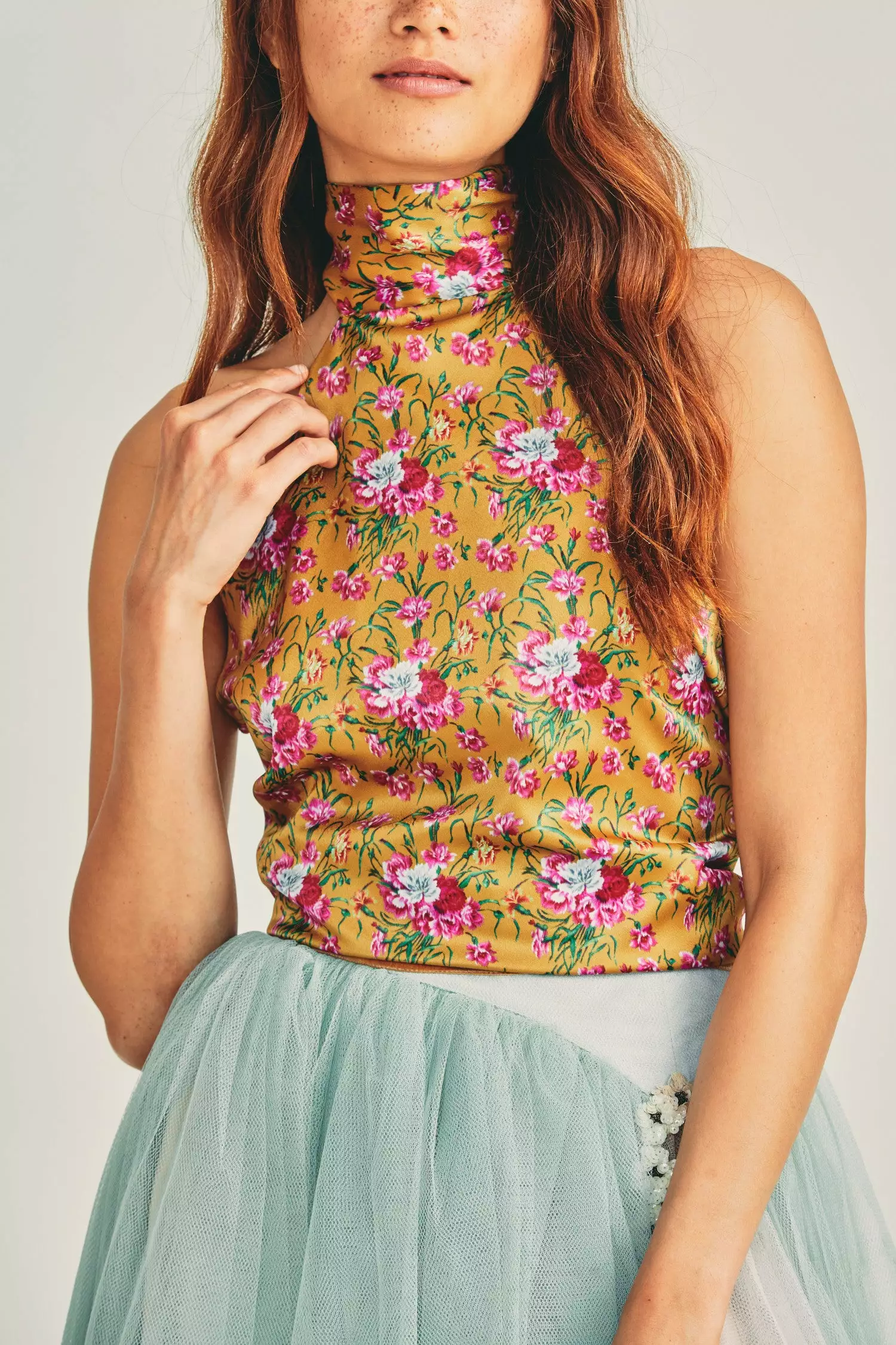 Our Boca Handkerchief Top is brand new this season in a French textile-inspired ribbon-tied bouquet print. This true open-backed handkerchief top has a turtleneck that ties behind the neck and a second tie at the waistline. Shown here in Ruby Goldmind.