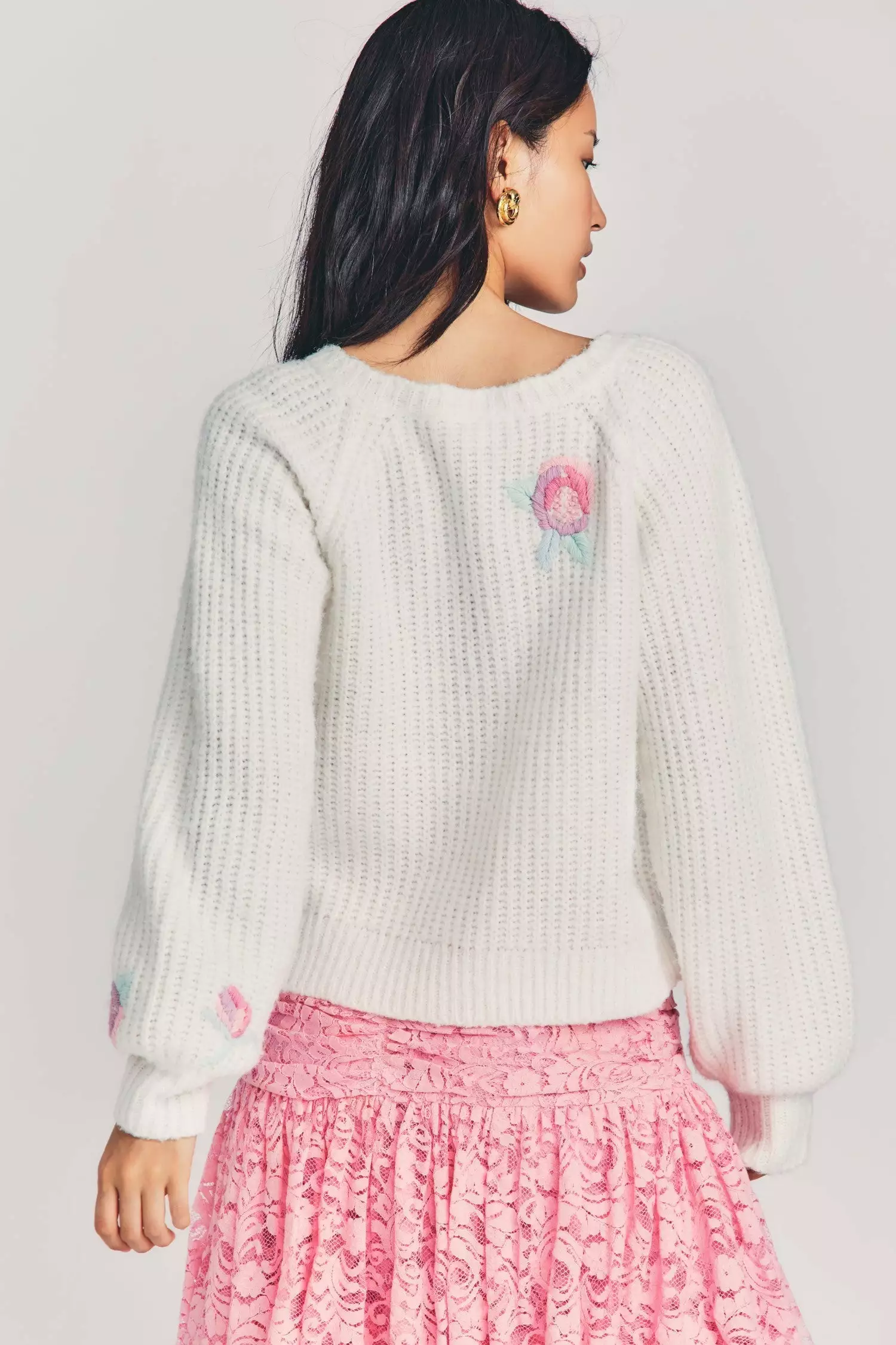 An ideal layering piece, our Brookie Cardigan arrives in a multicolored sustainable wool blend with ribbing, scalloped edges and hand-embroidered flower appliques. This relaxed sweater has a loose circle neck, covered buttons down center front and raglan sleeves with cuffs at opening. Wear it with our Aimee Skirt.
