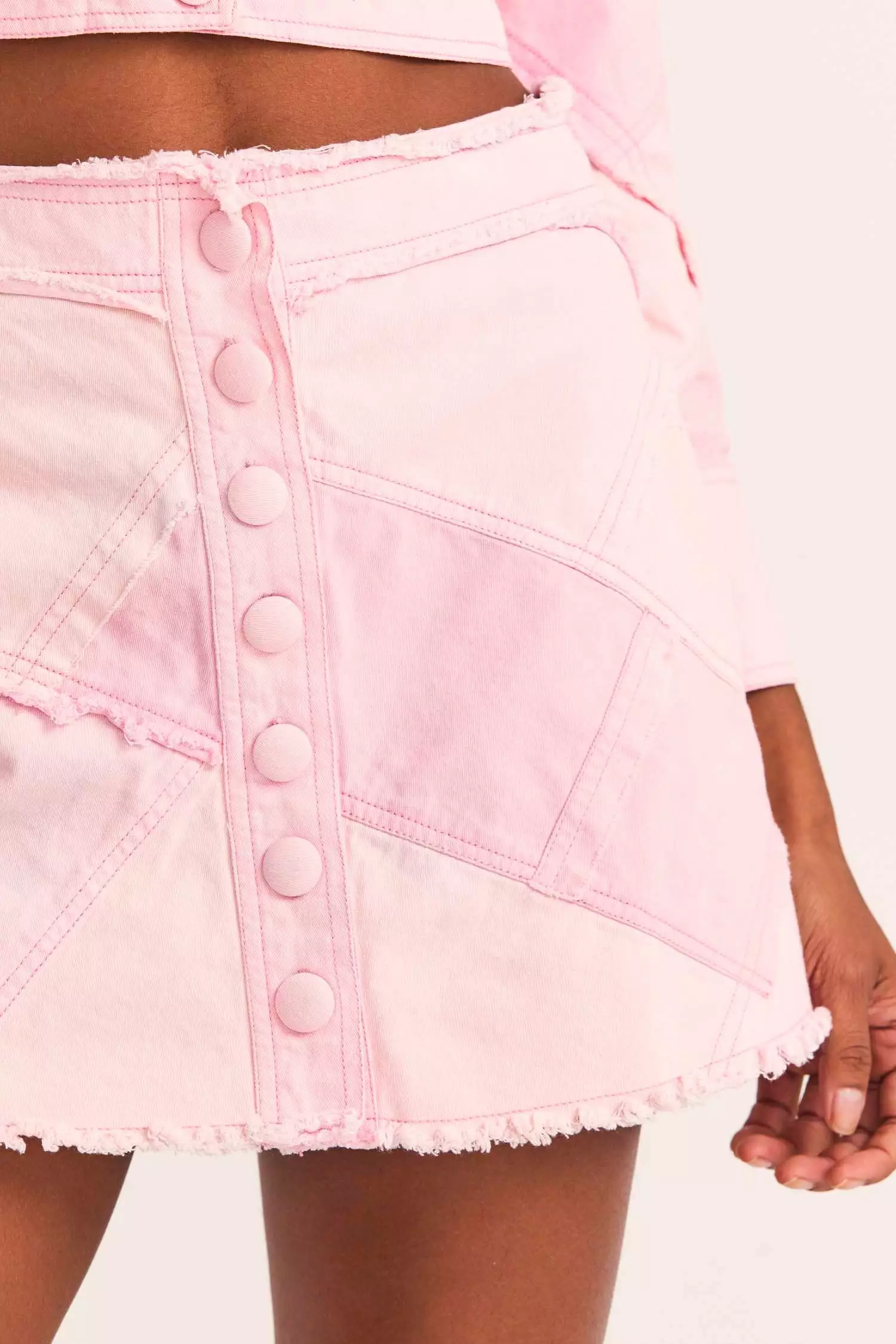 Our new Cayde Skirt is clutch in buttery soft denim patchwork with tonal pink color-blocking and reversed raw seams. This season’s jean skirt is an everyday staple with an a-line cut and functional center front fabric-covered buttons. Wear it as a set with our Eleora Crop Jacket. Shown here in Pastel Pink Colorblock.