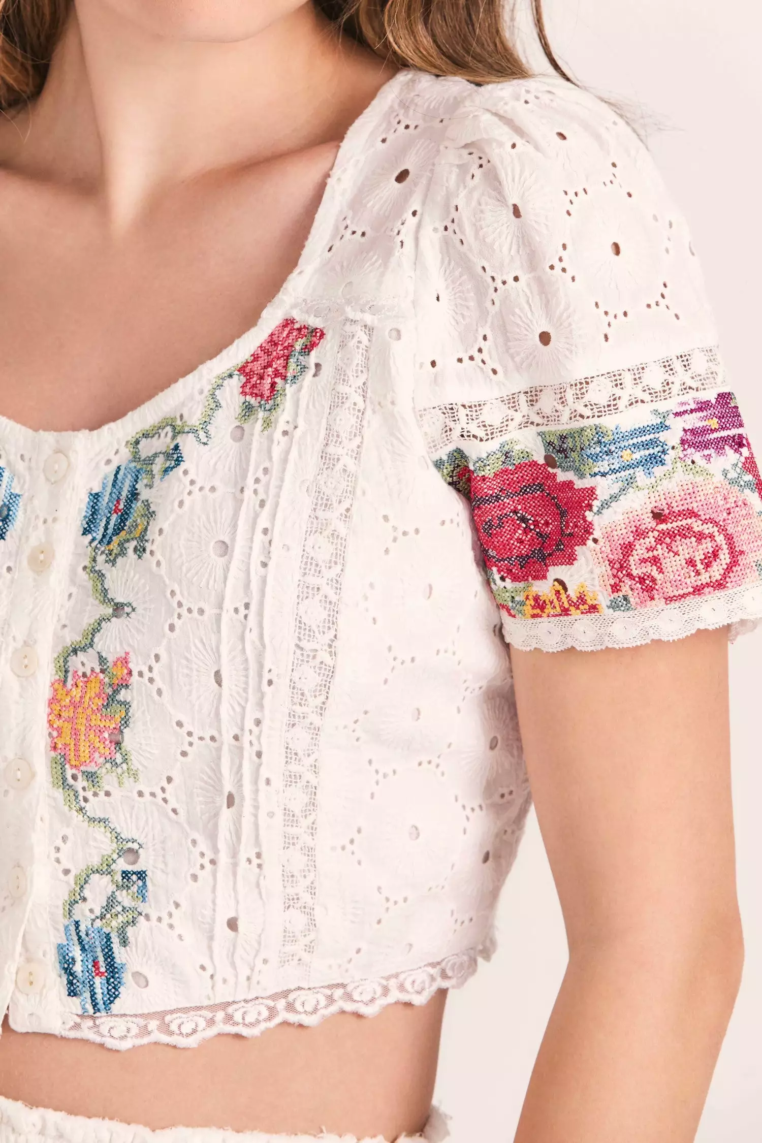 Our Collum Crop Top is something special in 100% cotton eyelet with needlepoint cross-stitch details, custom inset lace and pintucking. This elaborate top has a scoop neck, mother-of-pearl buttons down center front, short puffed sleeves with lace trim and a shaped lace cropped hem. Wear it as a set with our Shawna Mini Skirt.