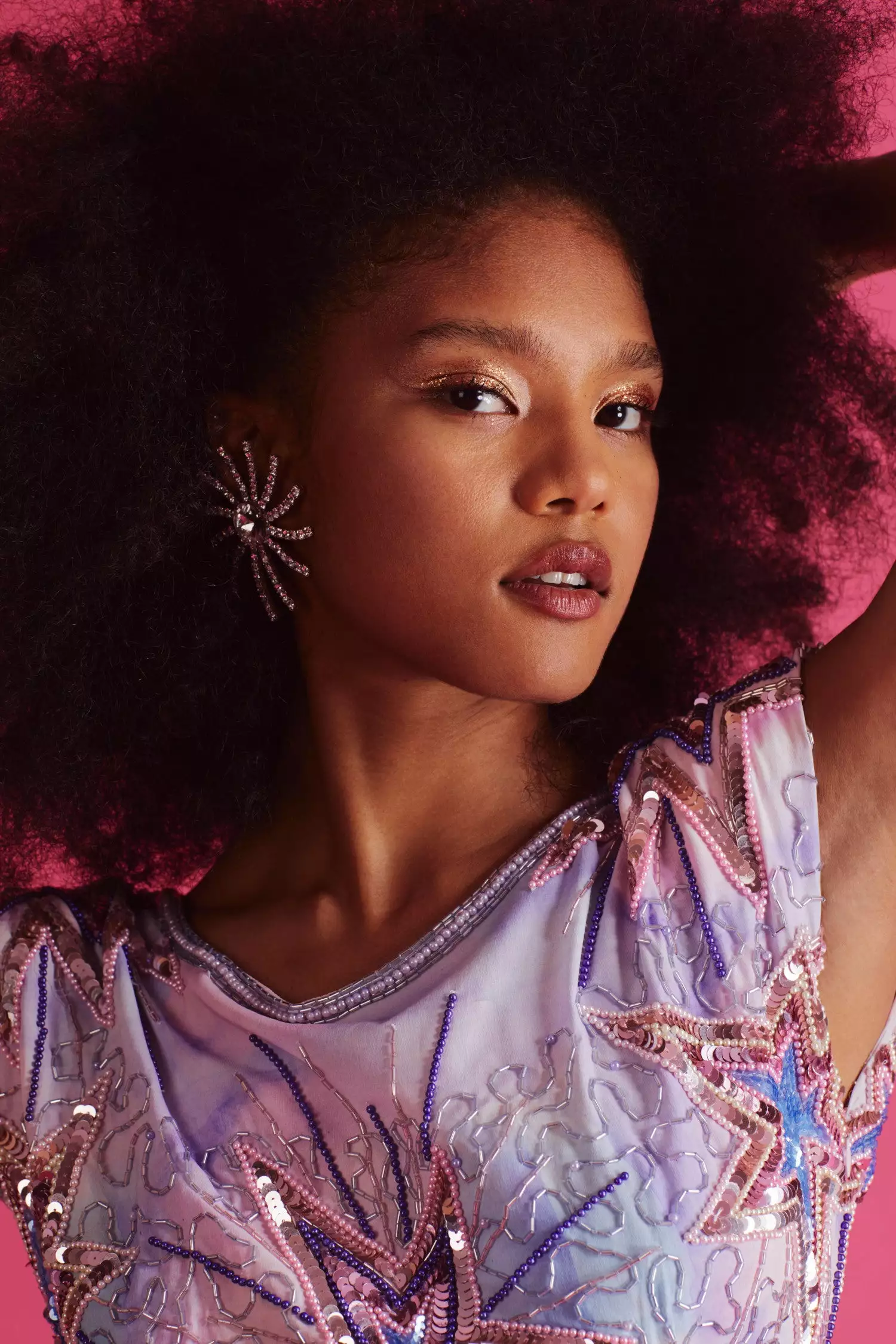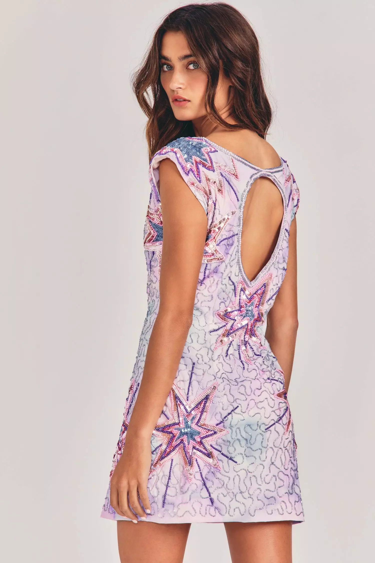 Our Colville Dress is out of this world with a show-stopping starburst and squiggle motif, hand-embellished with sequins and beads. This statement minidress is the life of the party with a subtle scoop neck, cap sleeves with shoulder pads for shape, a slim sheath silhouetteΓ₯Γand a large teardrop cutout. Shown here in Sweet Ocean Blue.