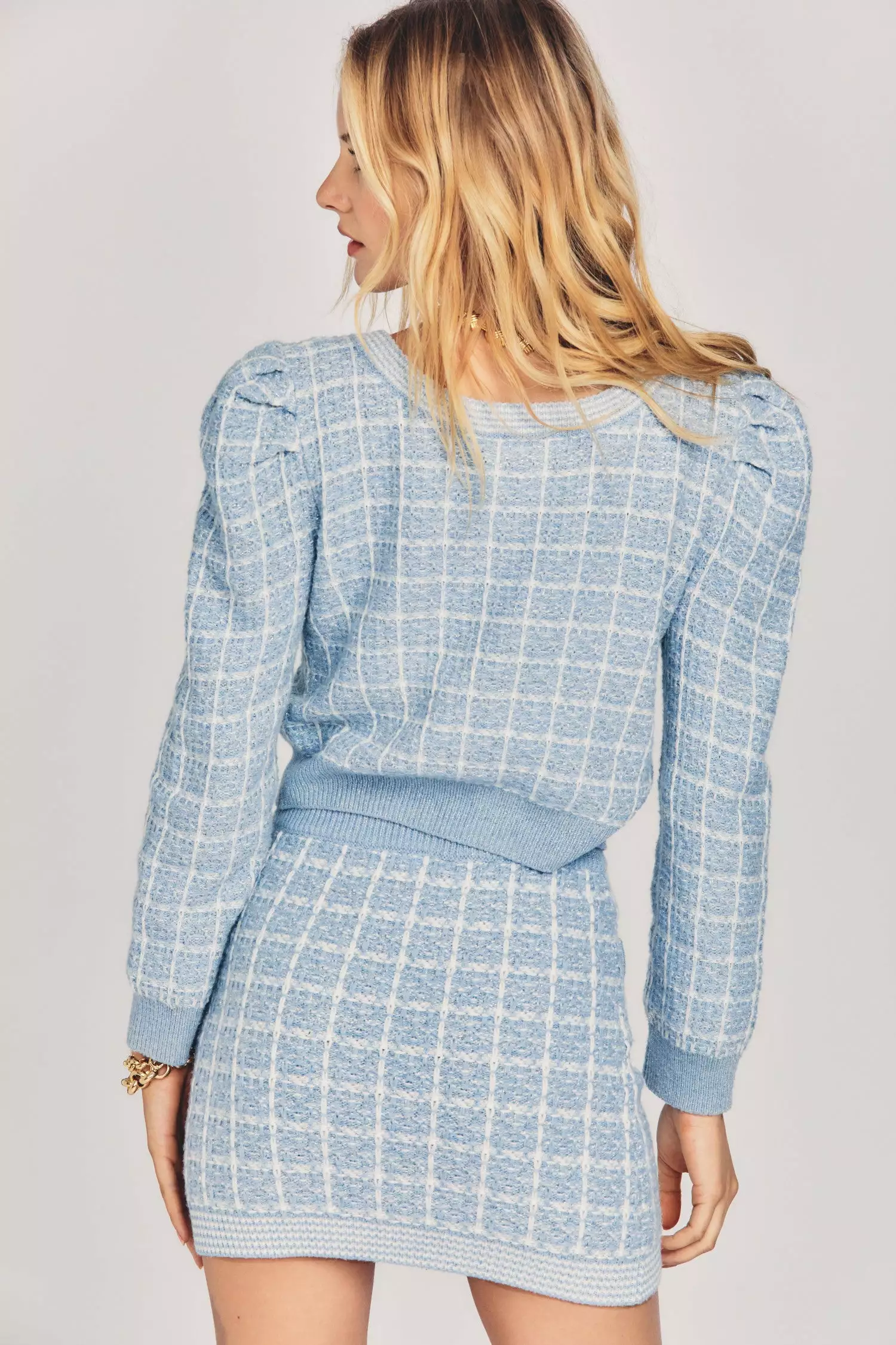 Channel Jackie O. in our Daughter Cropped Cardigan, extra special in our new gold lurex tweed. This flattering sweater has striped ribbing along the borders of the circle neck and center front placket (lined with gold lurex-wrapped buttons). Dramatic puffed sleeves taper to ribbed cuffs at opening, mirrored at the cropped bottom hem. Make it the perfect set with our Callington Skirt. Shown here in Babybell Blue.