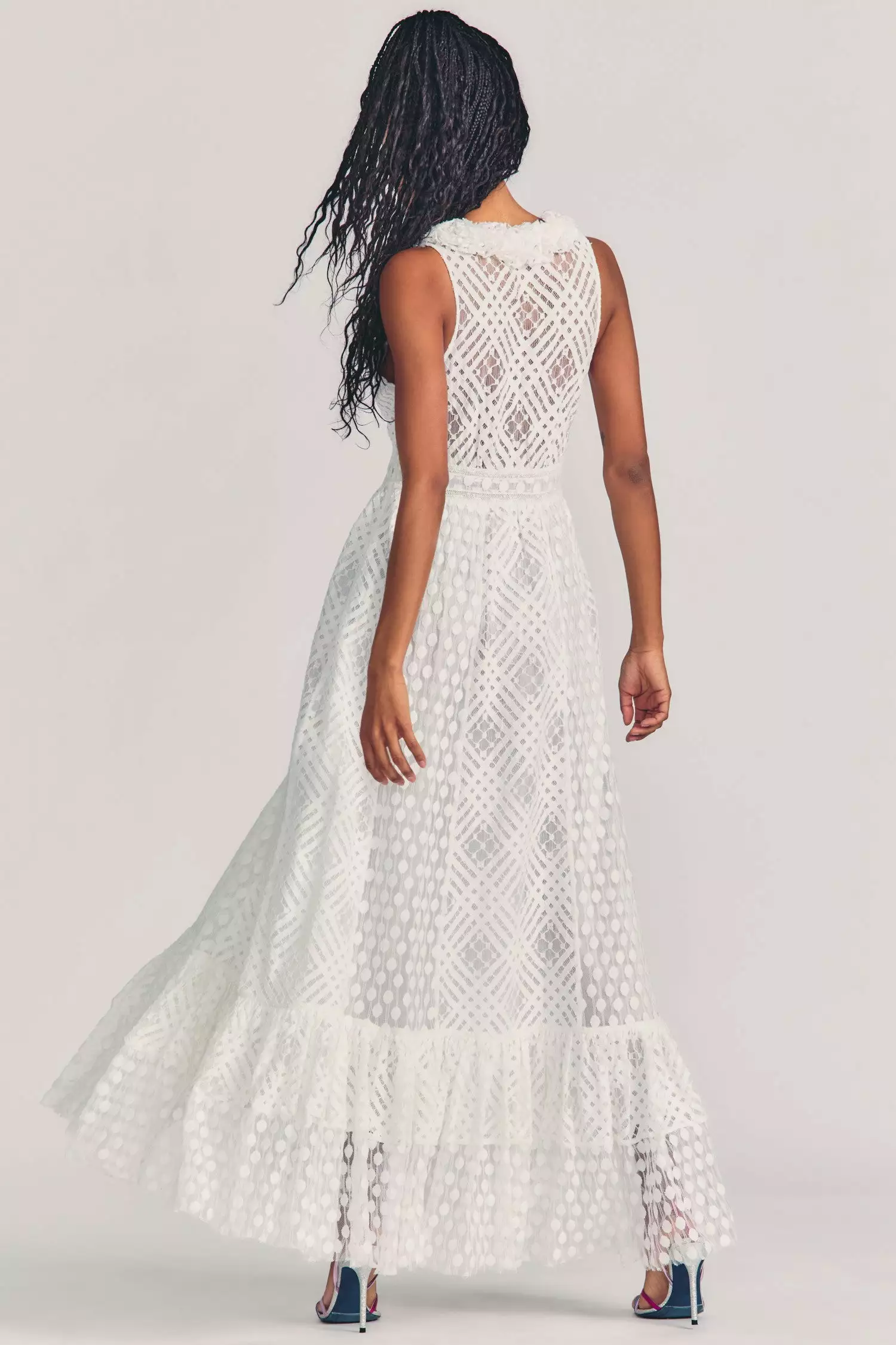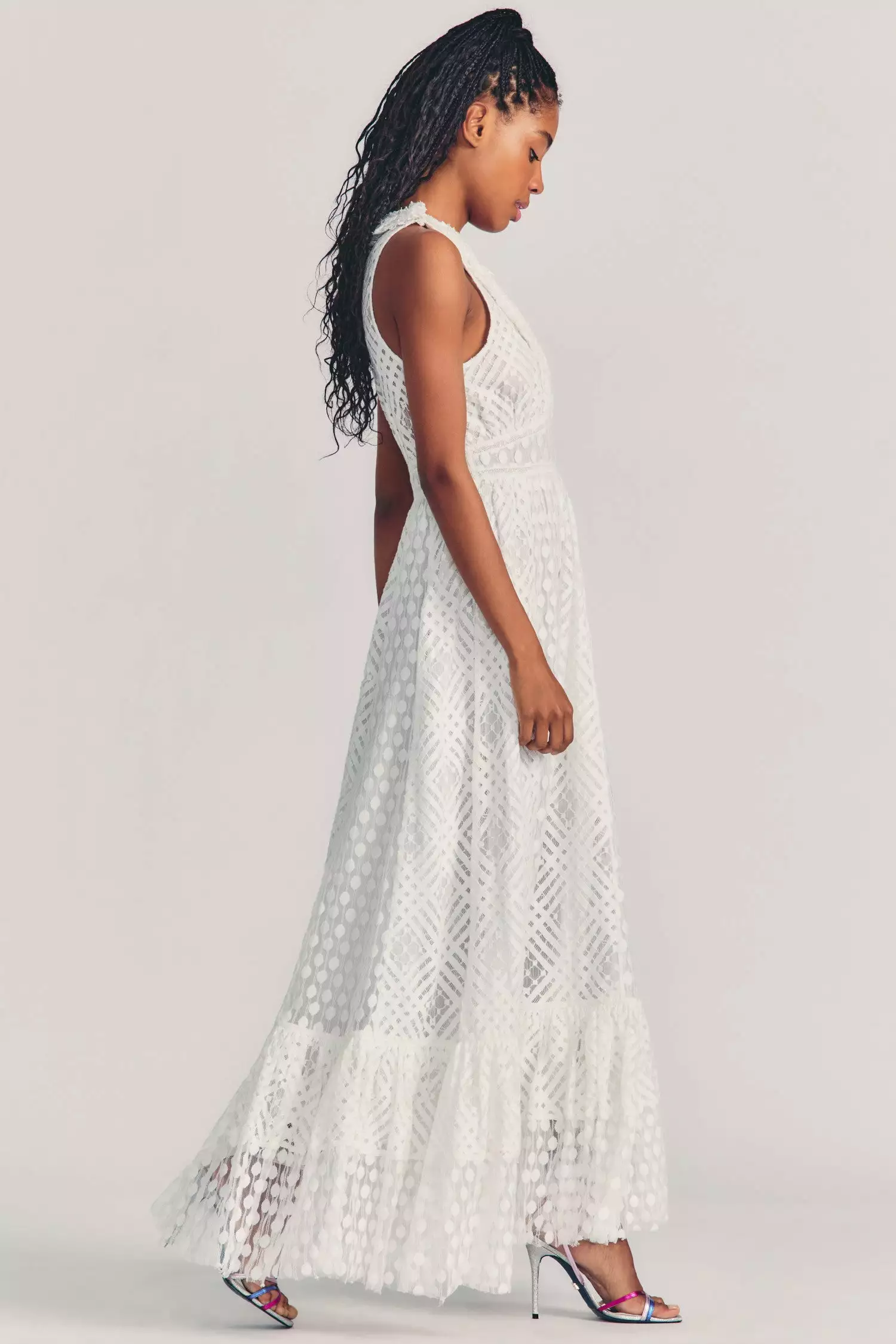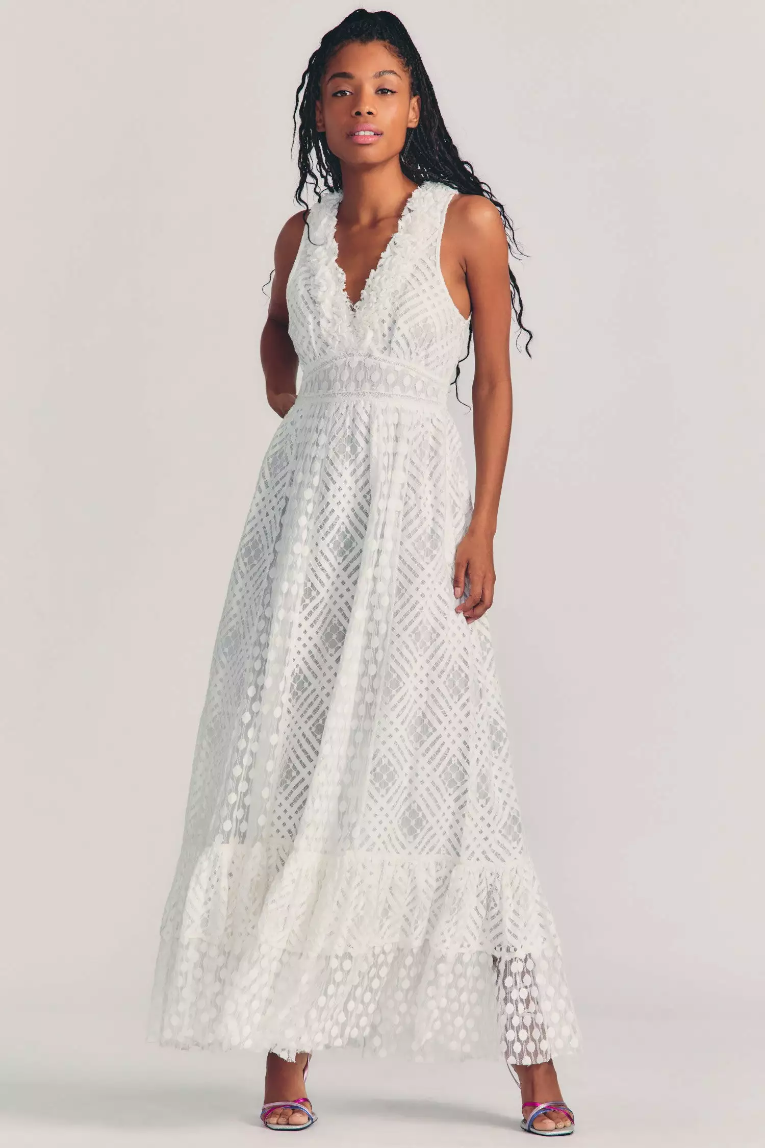 It’s a night to remember in our Bechette Dress with geometric detailing on tulle. This fantasy gown has a gathered, ruffle-lined v-neck above a shirred bust and fixed waist, tied with a sheer sash. The full skirt drapes to a dramatic flounce at bottom. Accessorize it with our LSF x Lele Sadoughi Pearl Headband. Shown here in White.