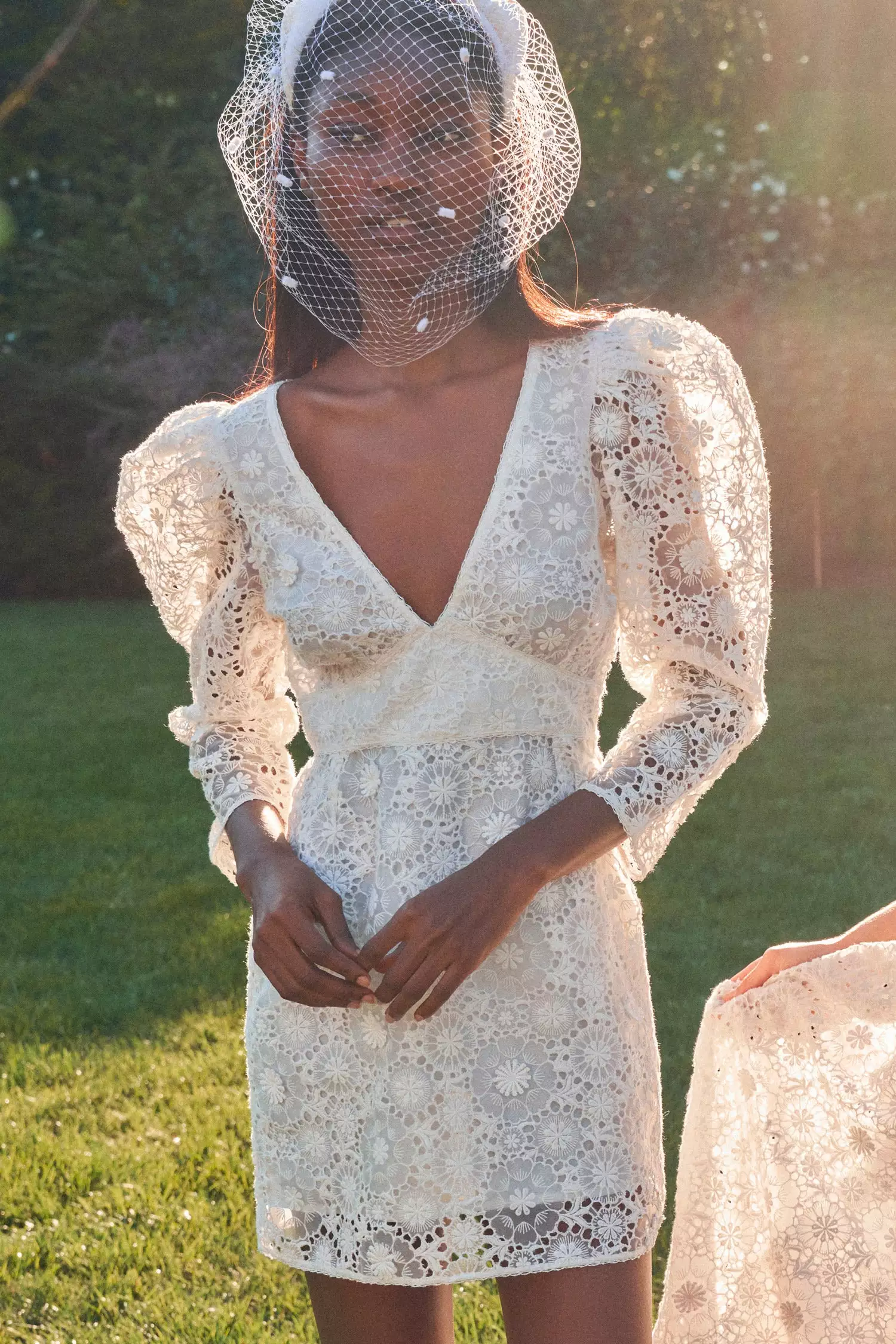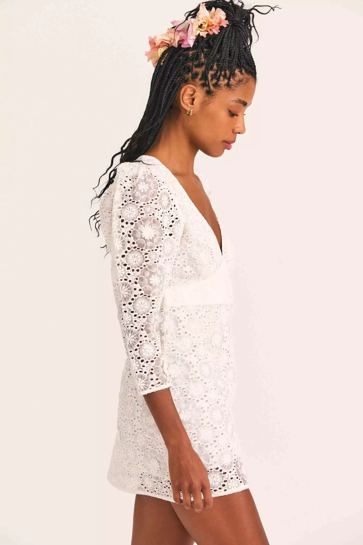 Forever begins in our Faye Dress, a short and sweet piece for your big day. This extra special minidress features a custom lace overlay, picot trims and flower appliqués to create dimension. A deep v-neck is framed by sheer puffed 3/4-length sleeves. Below a fixed waist, the skirt has a trim a-line. Shown here in True White.