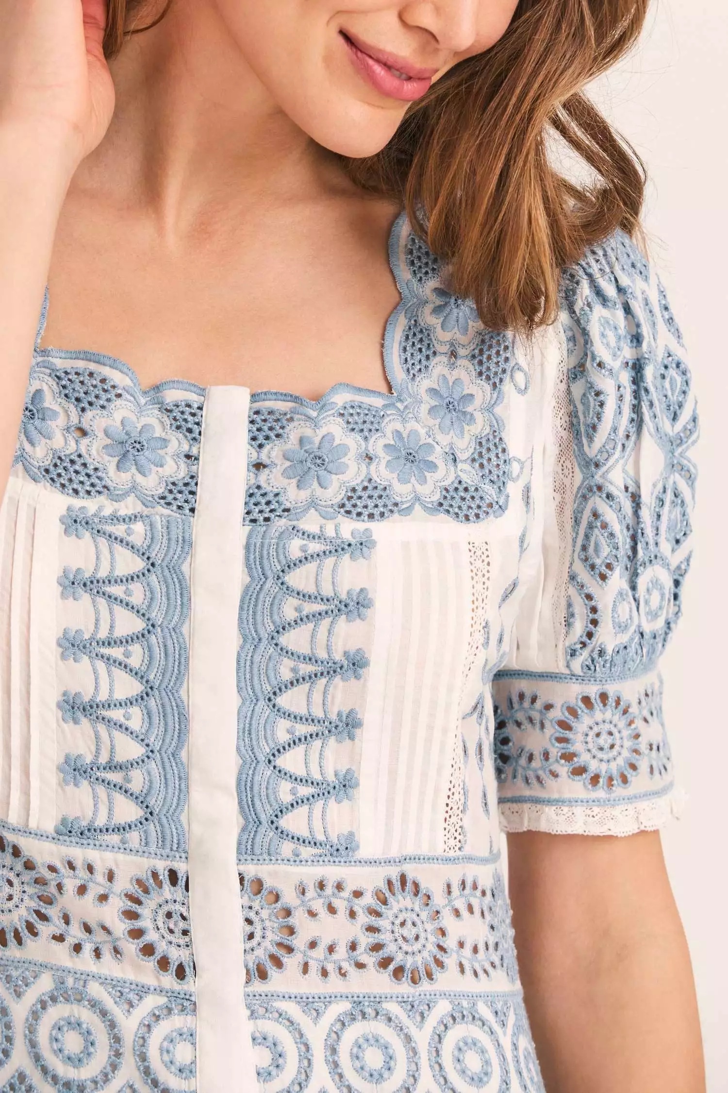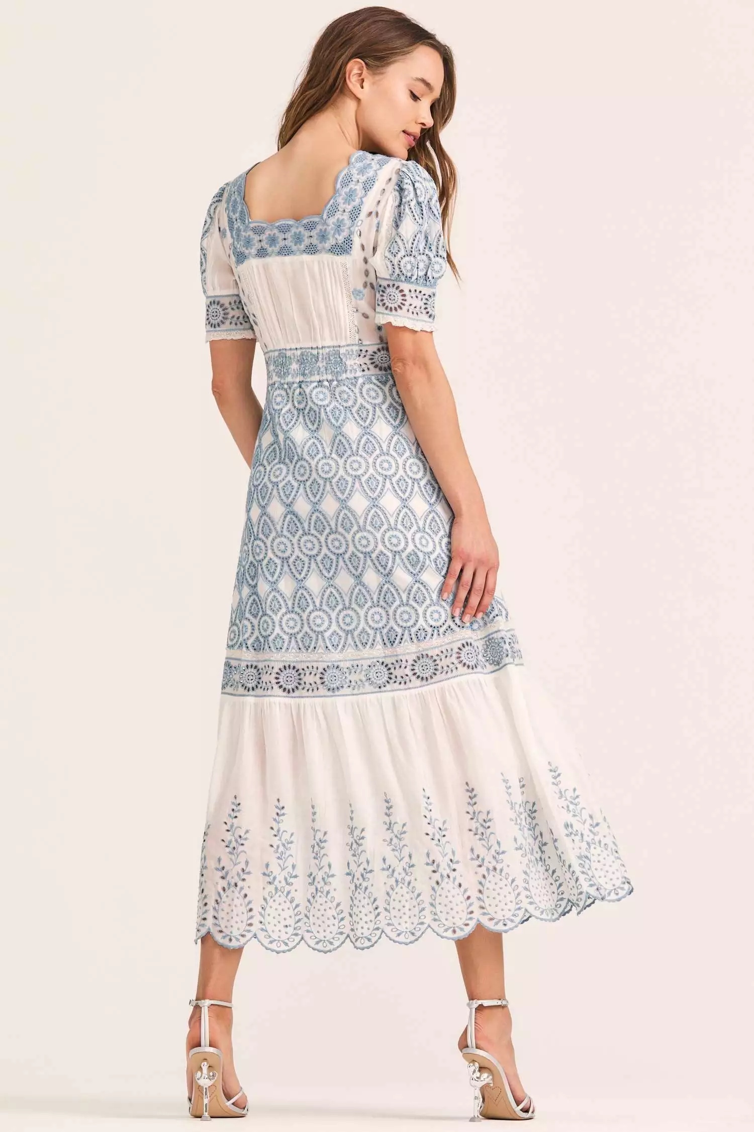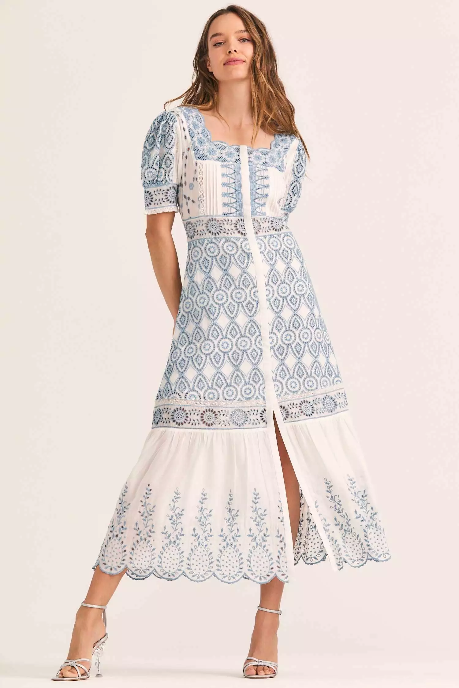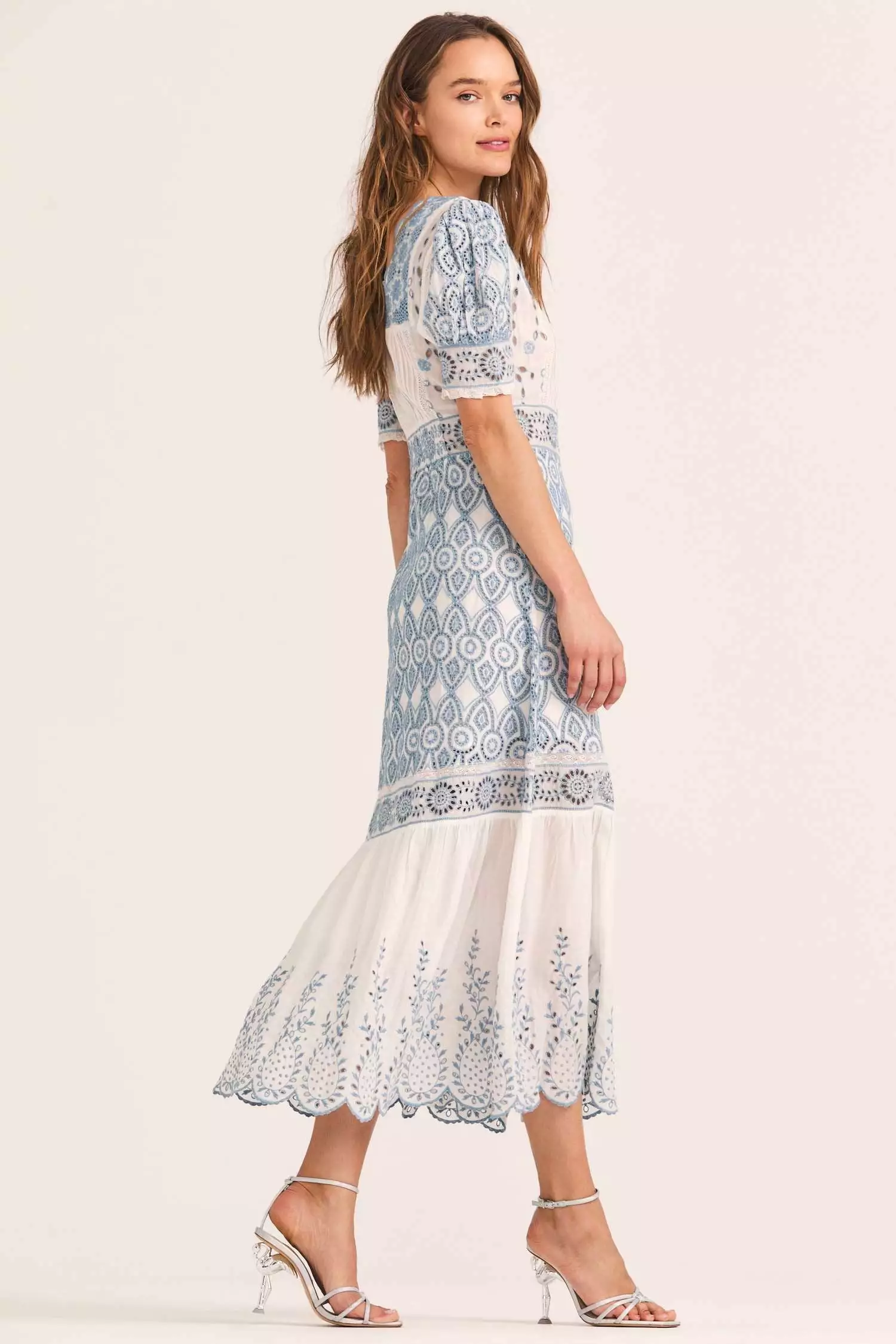 Our new Helena Dress is a work of art in our soft modal with an elaborate mix of all-over contrast eyelet embroidery. This ankle-length frock features a subtly scalloped neckline, a hidden button placket down center front, puffed short sleeves with ruffle trim, elastic at center back waistband and a scalloped bottom hem. Pair it with our Keoni Cardigan Sweater. Shown here Ivory Shores.