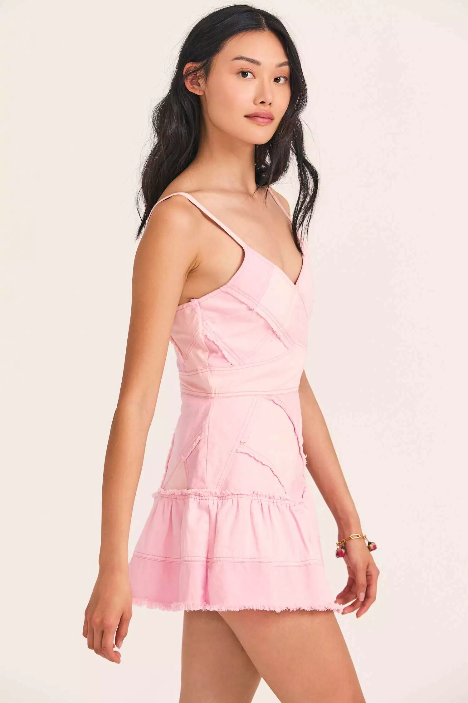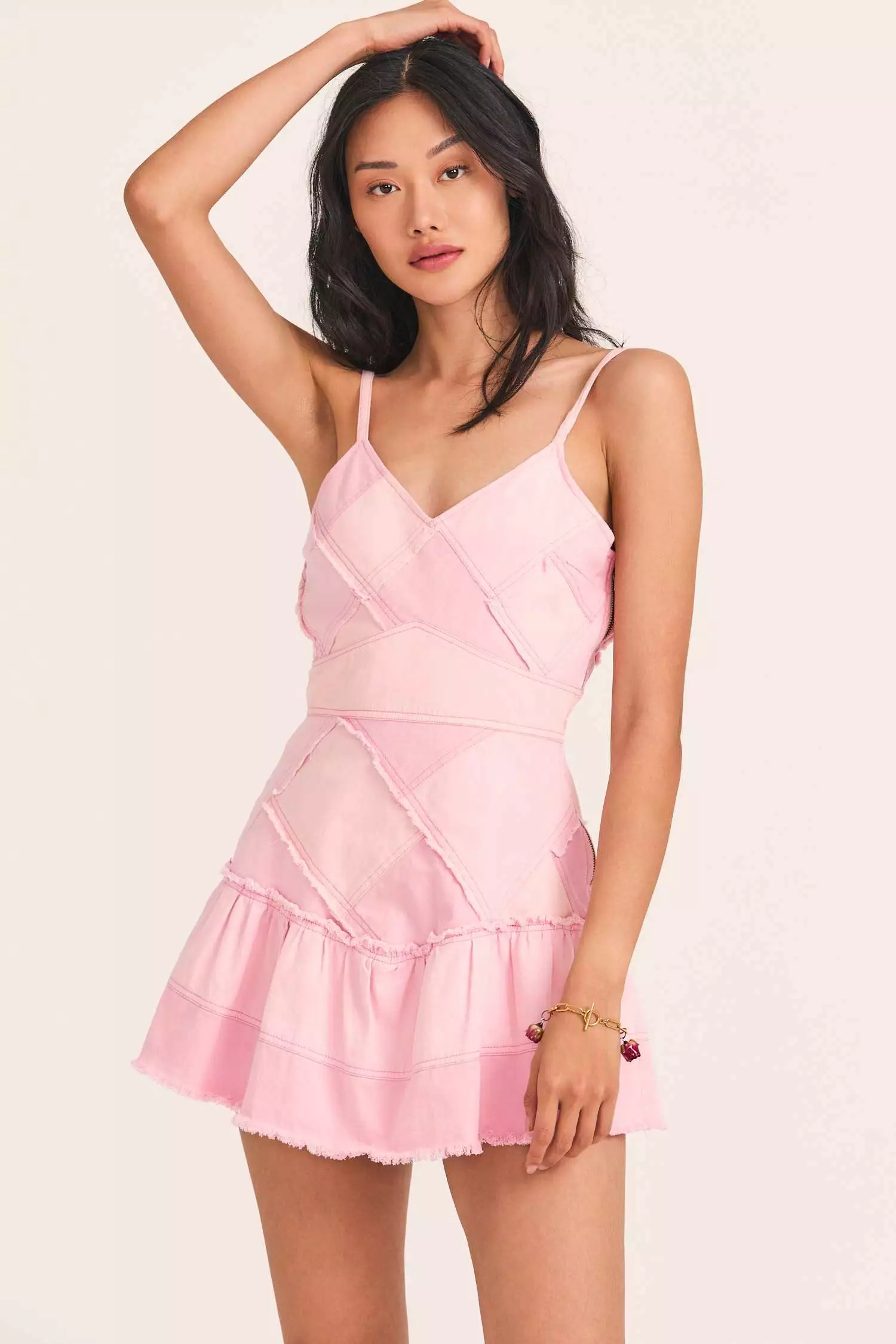 Our new Pera Dress is perfect in buttery soft denim patchwork with tonal pink color-blocking and reversed raw seams. This minidress has adjustable spaghetti straps, a v-neck, a shaped waistband and a fit-and-flare skirt with a raw-edged hem. Pair it with our Leonel Cardigan. Shown here in Pastel Pink Colorblock.