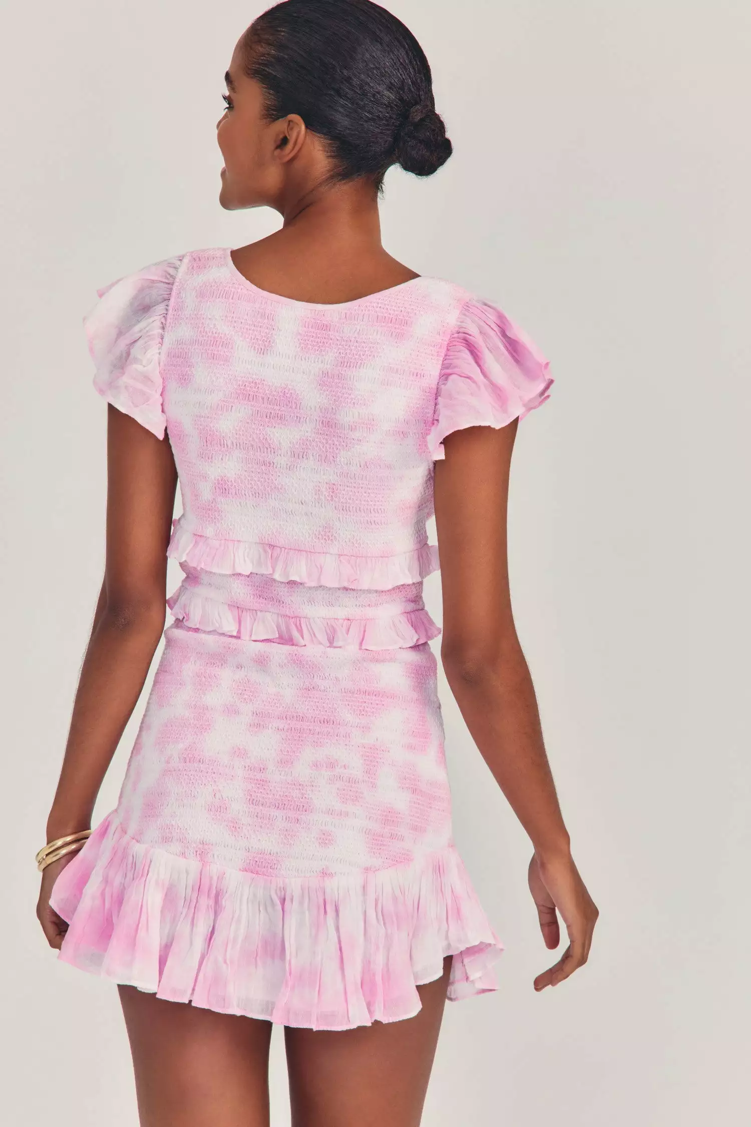 Our fan-favorite Sonora Dress returns in 100% hand tie-dyed cotton with our ever-popular smocking. This fitted mini-frock has a deep v-neck, a shirred bust, flutter sleeves, ruffle details at the empire and waist seams and a final shirred flounce at bottom. Accessorize it with our Tellaro Victorian Scrunchies.