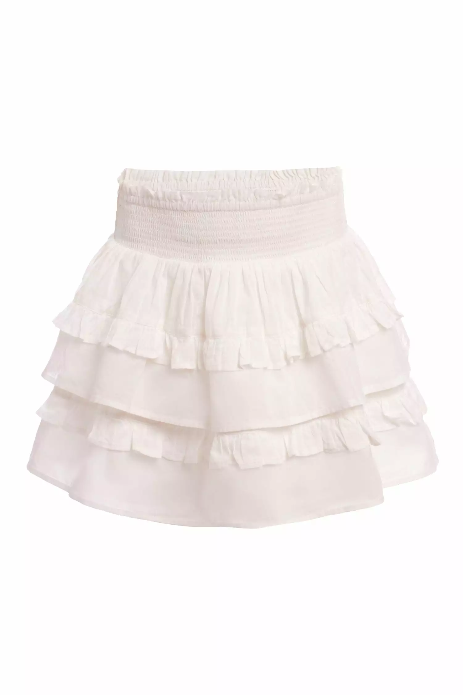 Our Billie Skirt is reimagined in 100% cotton voile. Below a wide smocked waistband, the skirt falls to two shirred tiers with ruffle details. Wear it with our matching Kairi Top. Shown here in True White.