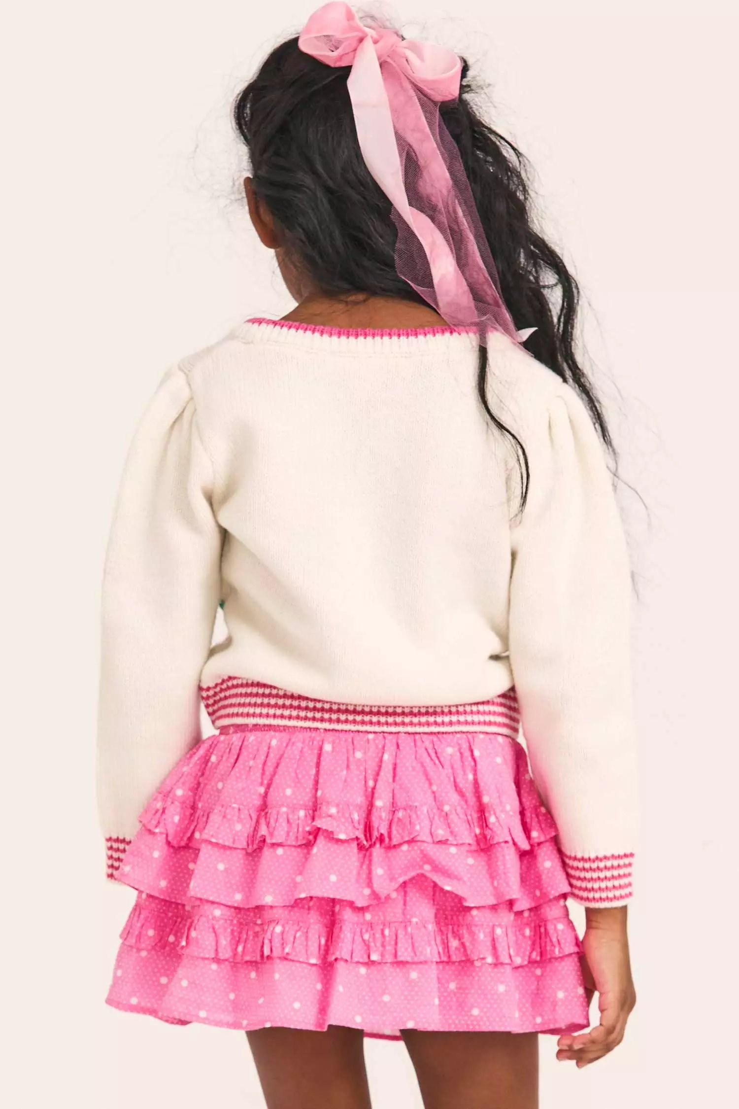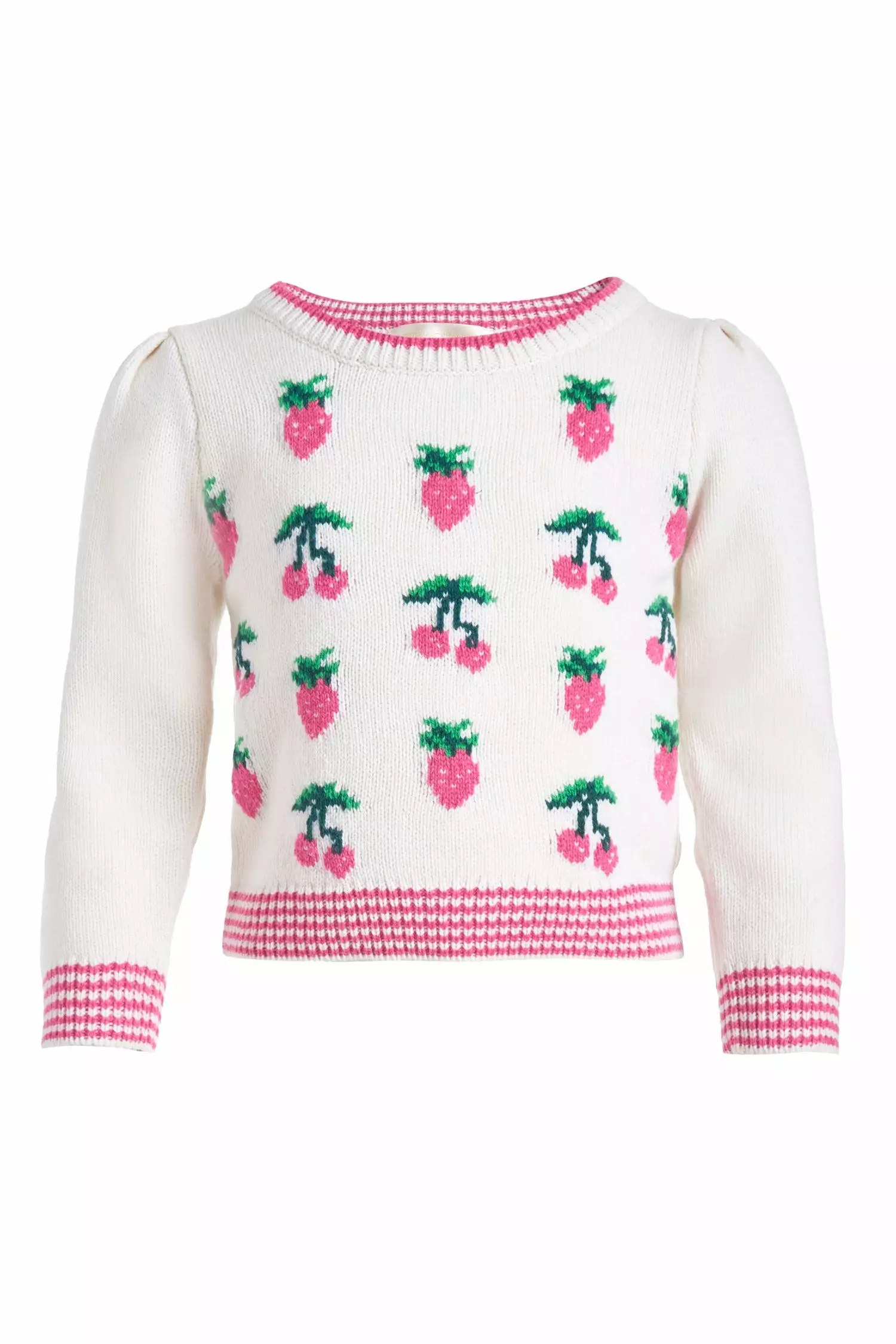 Our new Daughtry Pullover arrives in a cotton-wool blend with a cherry and strawberry intarsia motif. This sweet sweater has ribbing at the circle neck, puffed sleeve openings and bottom hem. Wear it with our Girls Billie Skirt. Shown here in Fruit Punch Pink.
