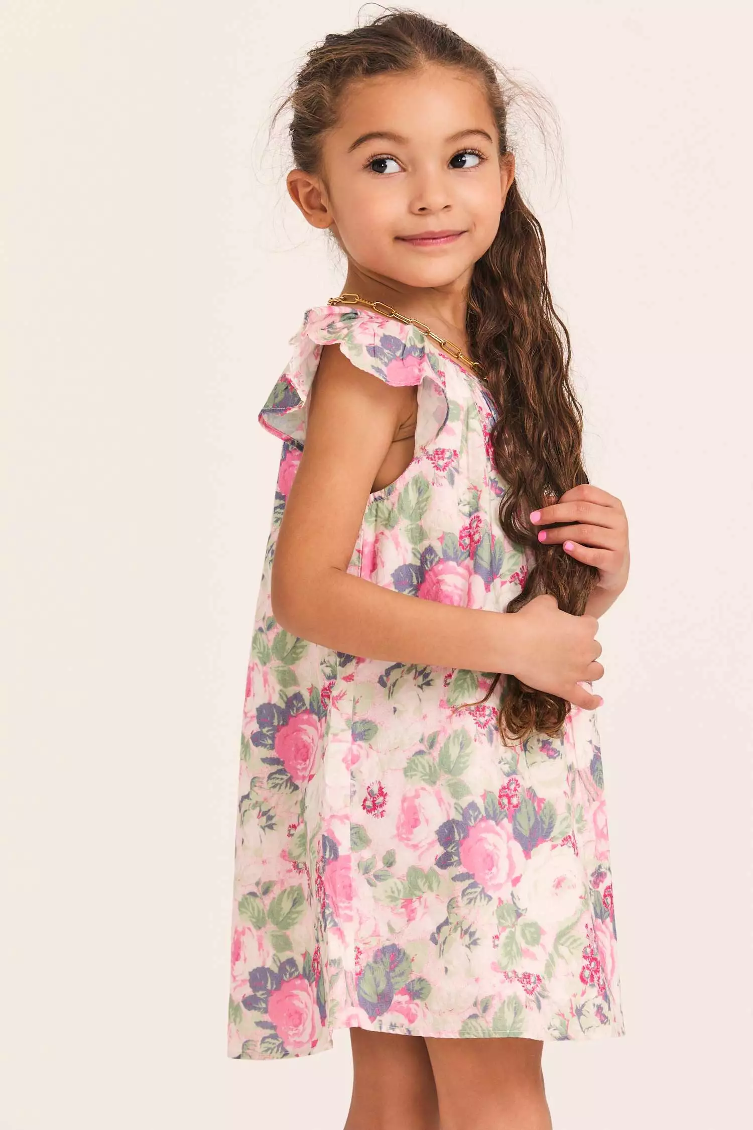 Skip along in our signature Lou Dress, reimagined in 100% cotton with this seasonβ°Ϋͺs hero rose print. A simple shirred circle neck is framed by flutter sleeves. This sheath dress, which features buttons down center back, stops just above the knee. Shown here in Veiled Kiss.