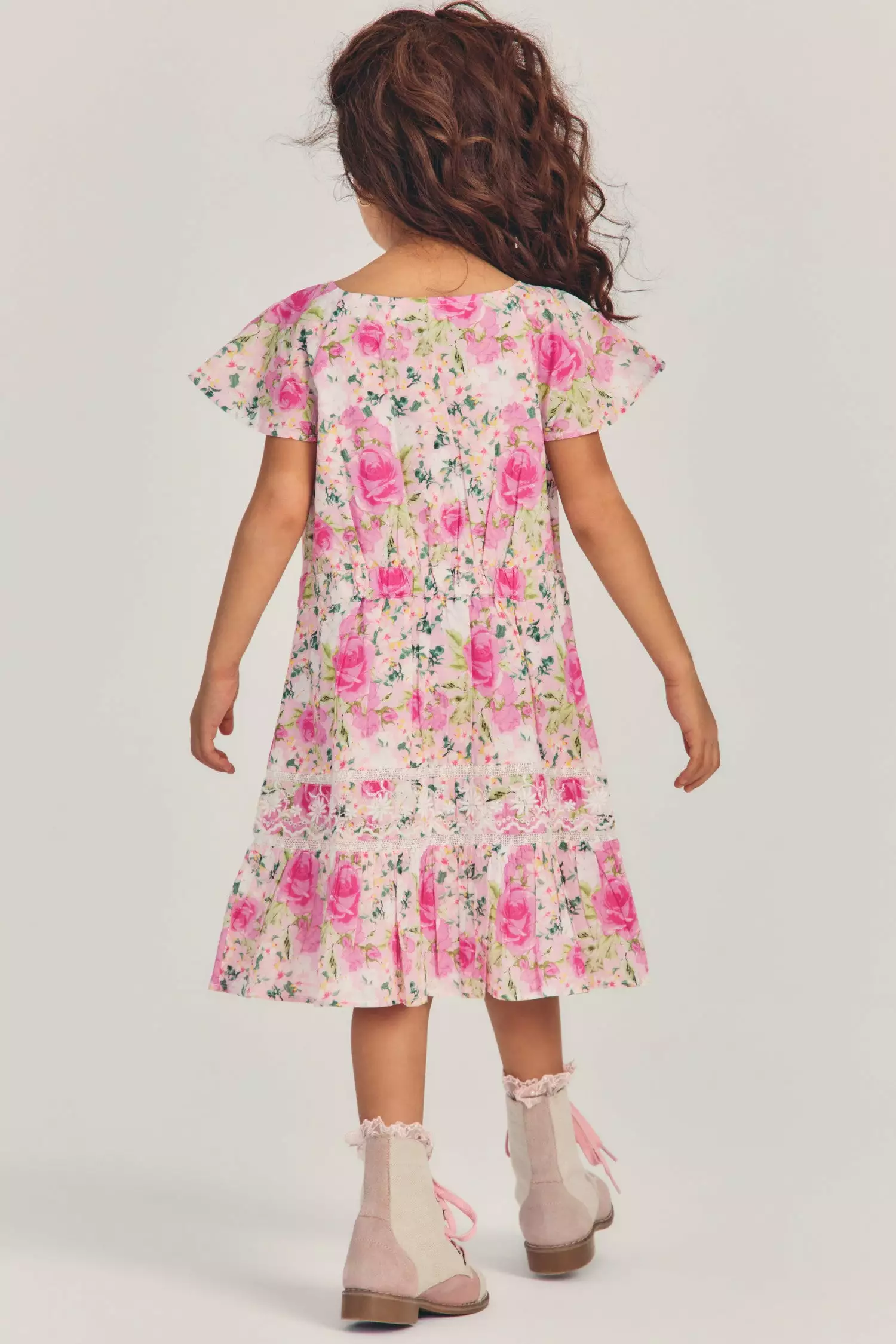 Our Mini Victorian Maxi arrives in 100% cotton with contrast schiffli embroidery, varied lace panels, pintucks and a hand-painted custom rose print. This dreamy girls dress features cap sleeves, buttons down center front and a flounce at bottom. Shown here in Magenta Flower Fields.