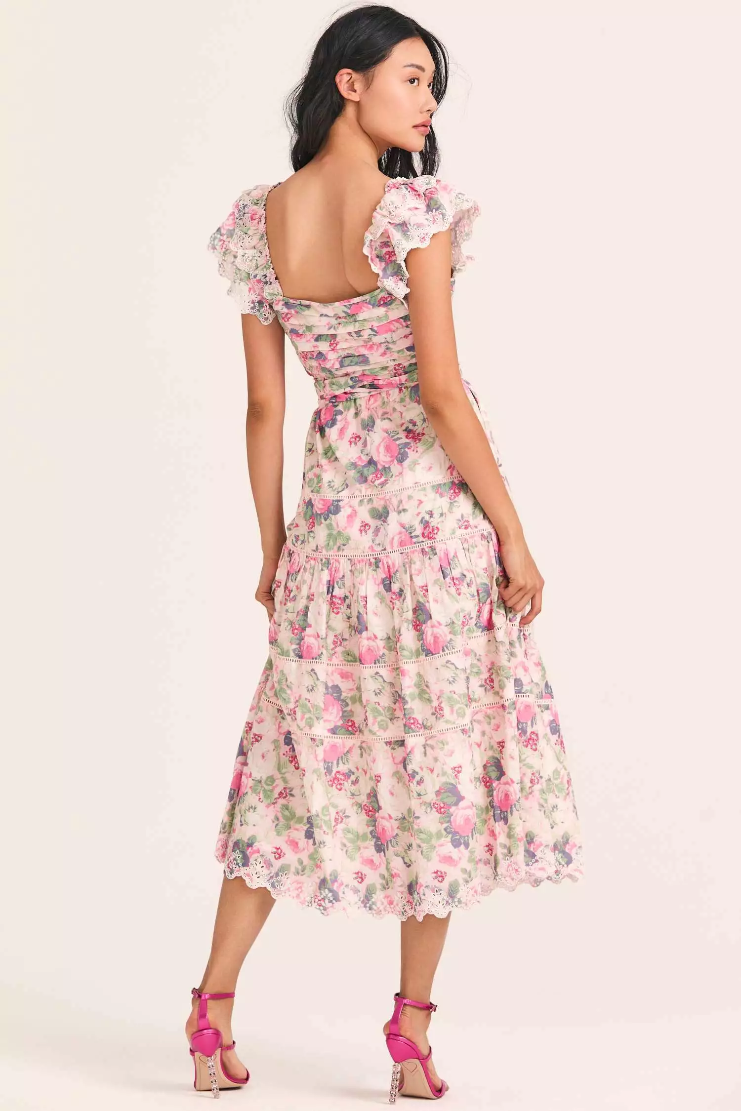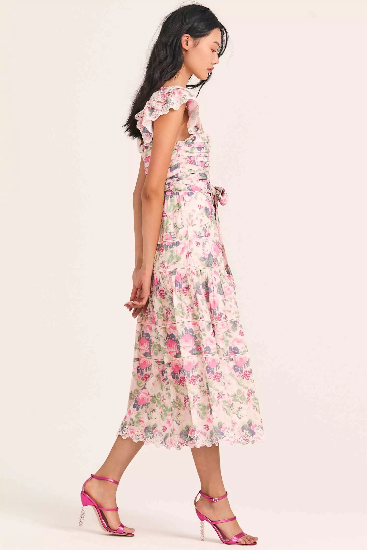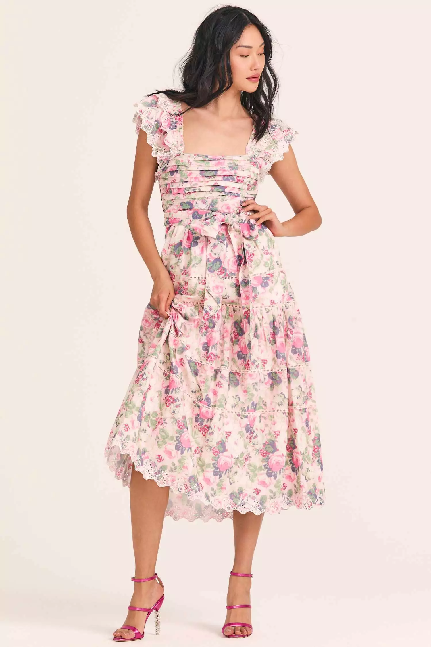 Our Harlyn Dress is timeless in 100% cotton with our hero hand-painted rose print of the season, eyelet embroidery and inset embroidered panels. This sweet empire frock has a square neckline with raw ruffle trim, a pleated bodice and double flutter sleeves with scalloped edges. The shirred skirt falls to midi-length with a scalloped hem.Β