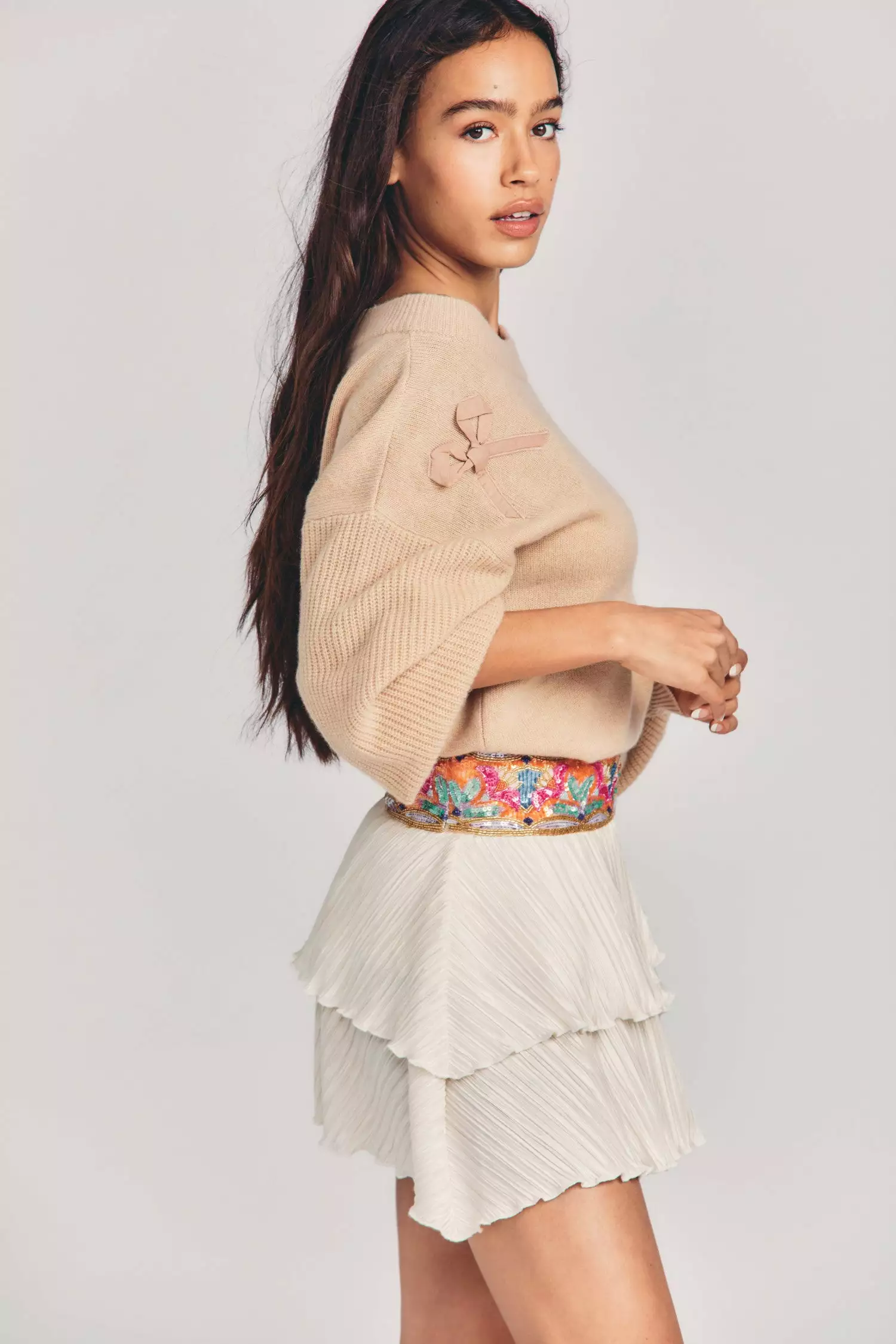 Our Henny Skirt gets the party started in a brand new pleated fabric with waved edges. This decorative mini’s intricate waistband is hand-embroidered and hand-beaded in India. Below, the skirt falls to asymmetrical overlapping tiers. Wear it with our Rosie Pullover Sweater. Shown here in Cream.Γ₯Γ