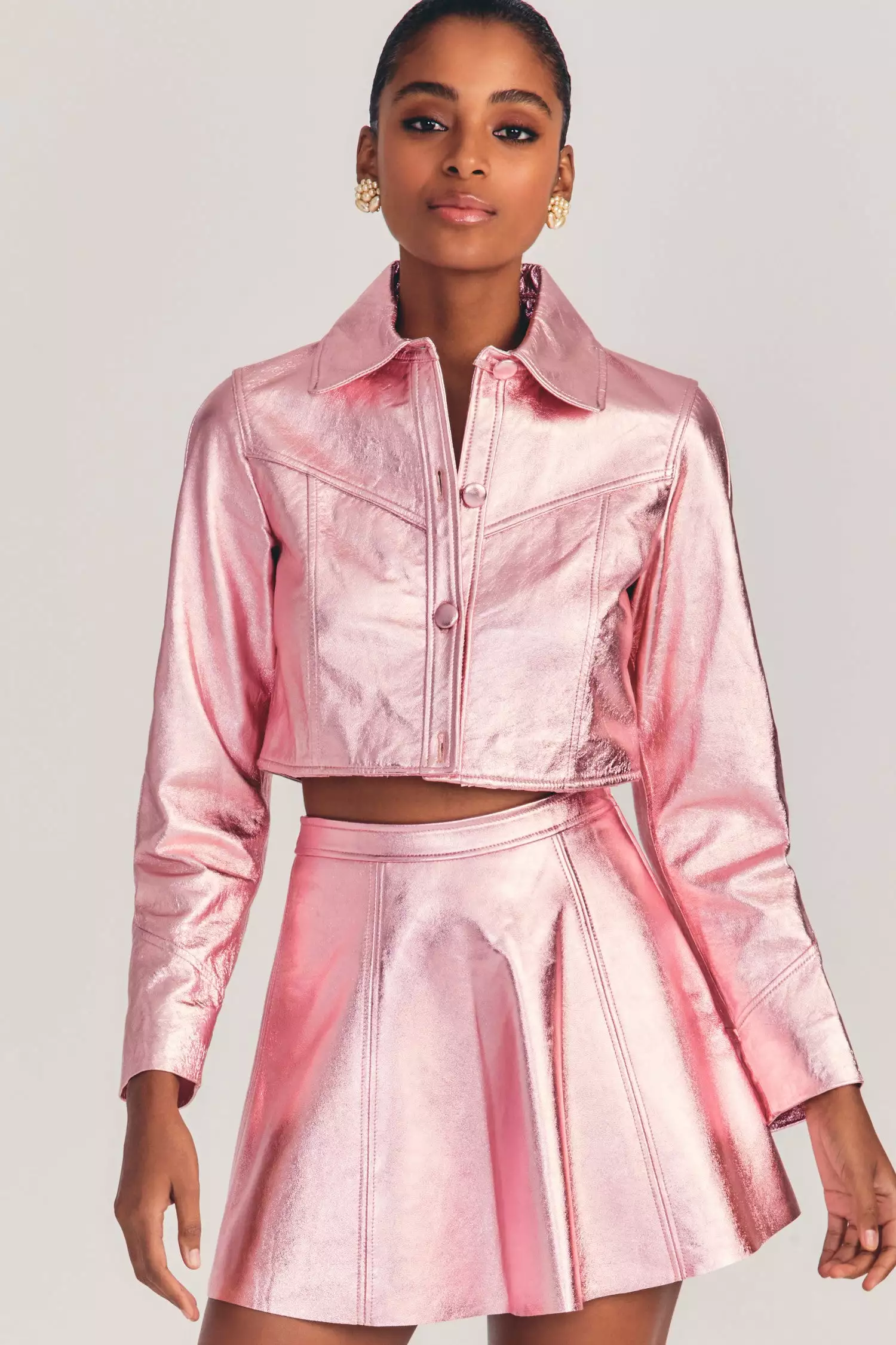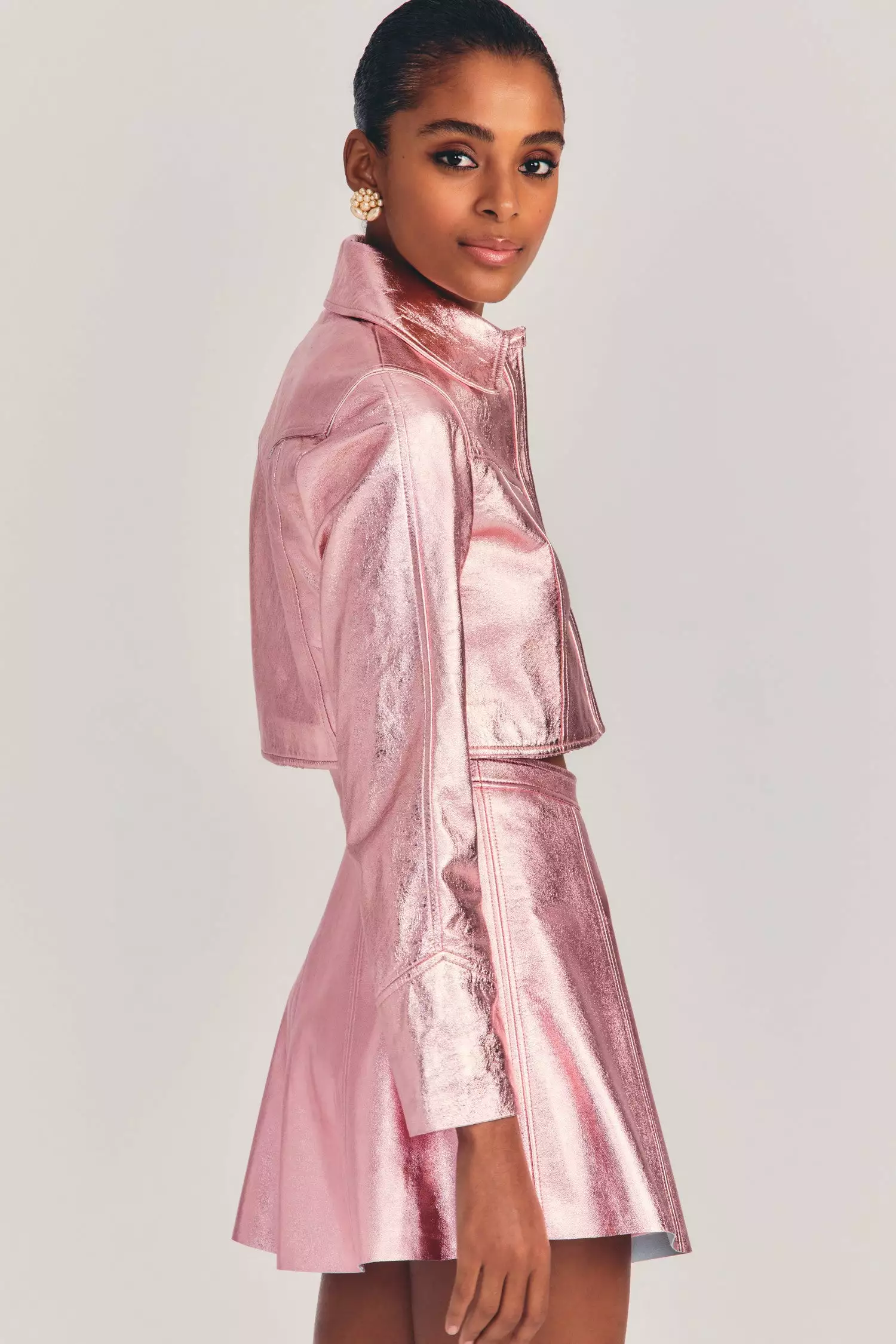 Our India Cropped Jacket is way too cool for school in metallic pink leather with angular seams. This shrunken jacket, a perfect transitional layering piece, has a classic collar, buttons down center front and a shine that just won’t quit. Wear it as a set with our Dornie Mini Skirt. Shown here in Metallic Pink.