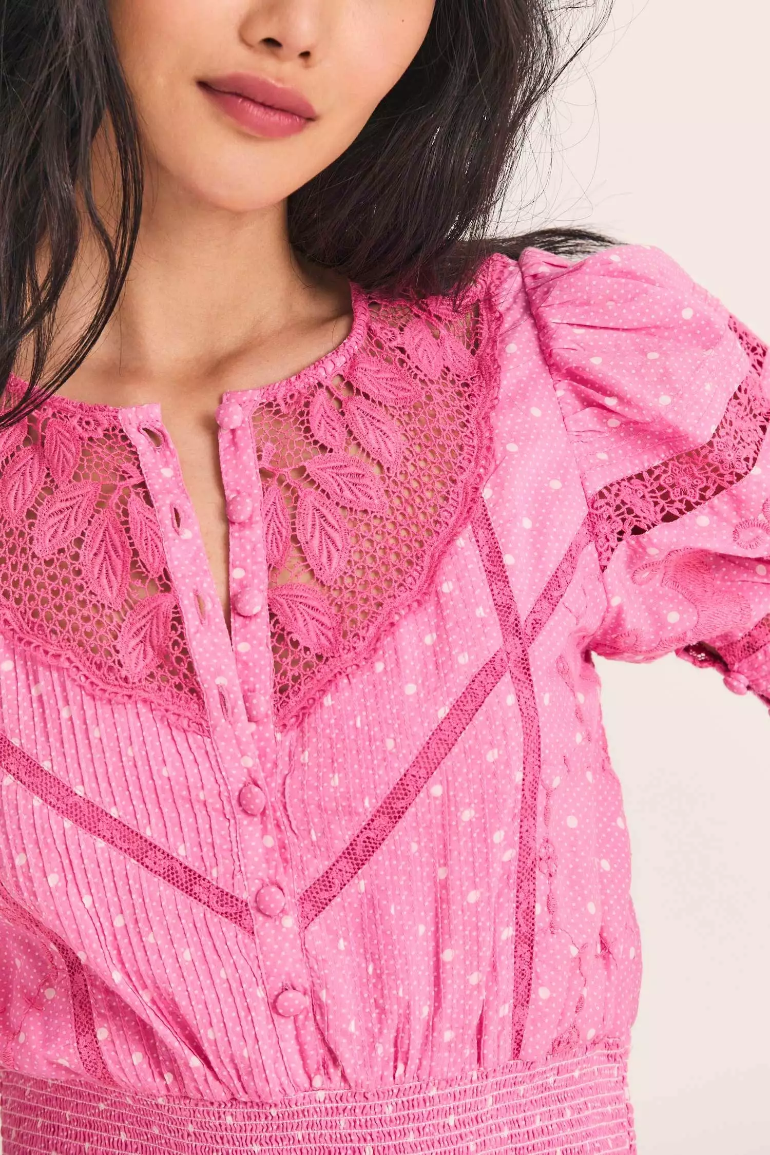 Our Jaislyn Dress is an instant favorite in cotton voile with scaled polkadots, schiffli embroidery, pintucking and custom embroidered and crocheted laces. This extra special minidress has an intricate botanical yoke at the neck, center front buttons and puffed sleeves with cuffs at opening. Below a smocked waistband, the skirt falls to a shirred flounce at bottom. Accessorize it with our Lorna Barrette.