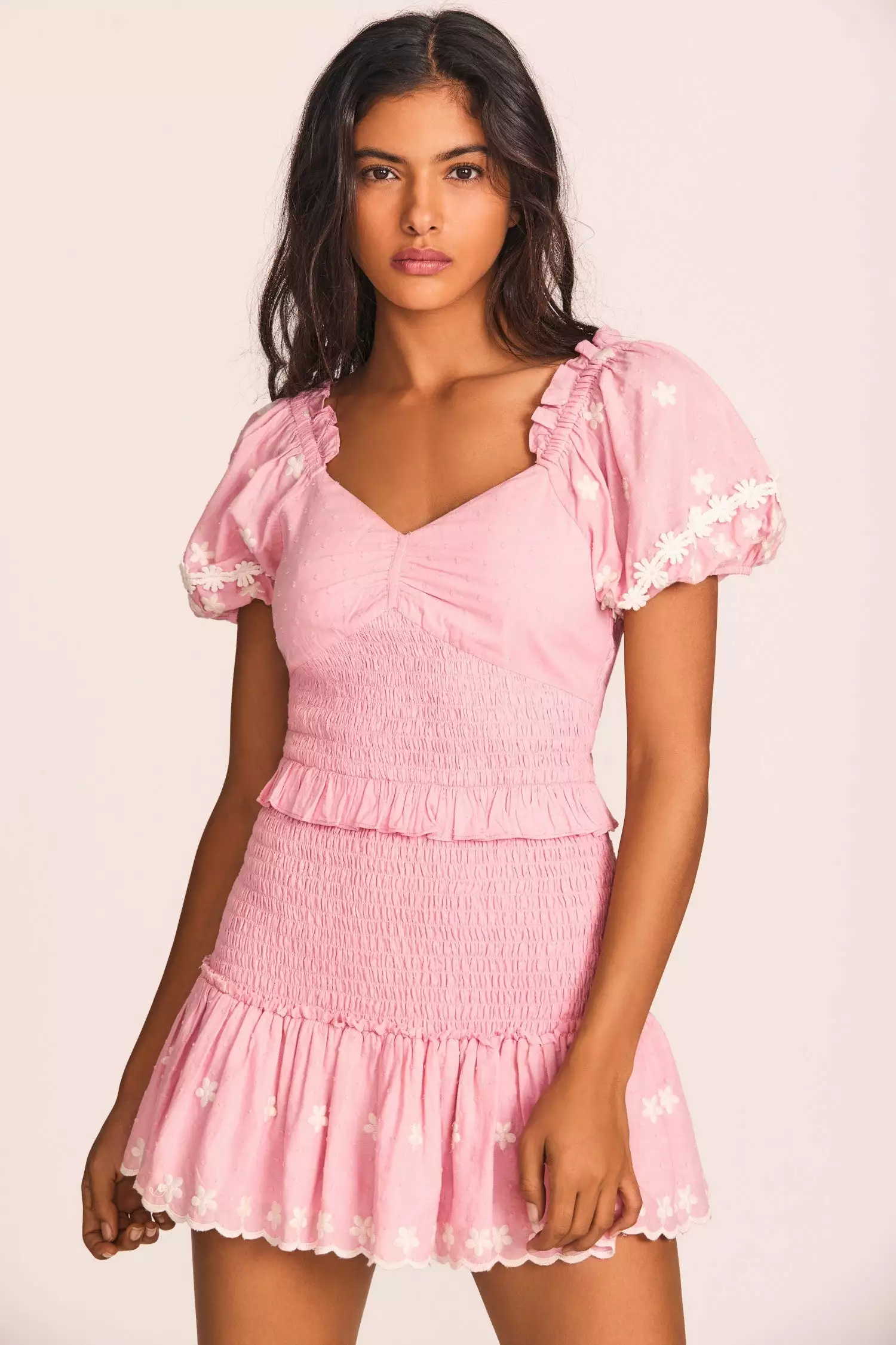 Our Jarrah Dress is upbeat in 100% cotton with polkadot and floral embroidery and flower appliquΓ©s. This minidress features a sweetheart neckline with ruffles and elastic at the shoulders, buoyant puffed sleeves and a bust thatβs gathered at center. The bodice is smocked with a peplum ruffle at the waist and continued smocking below, to a final scalloped flounce at bottom. Accessorize it with our LSF x Lele Sadoughi Pearl Headband.