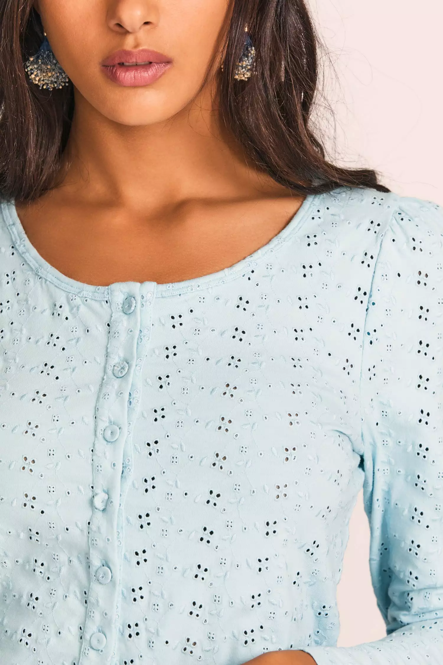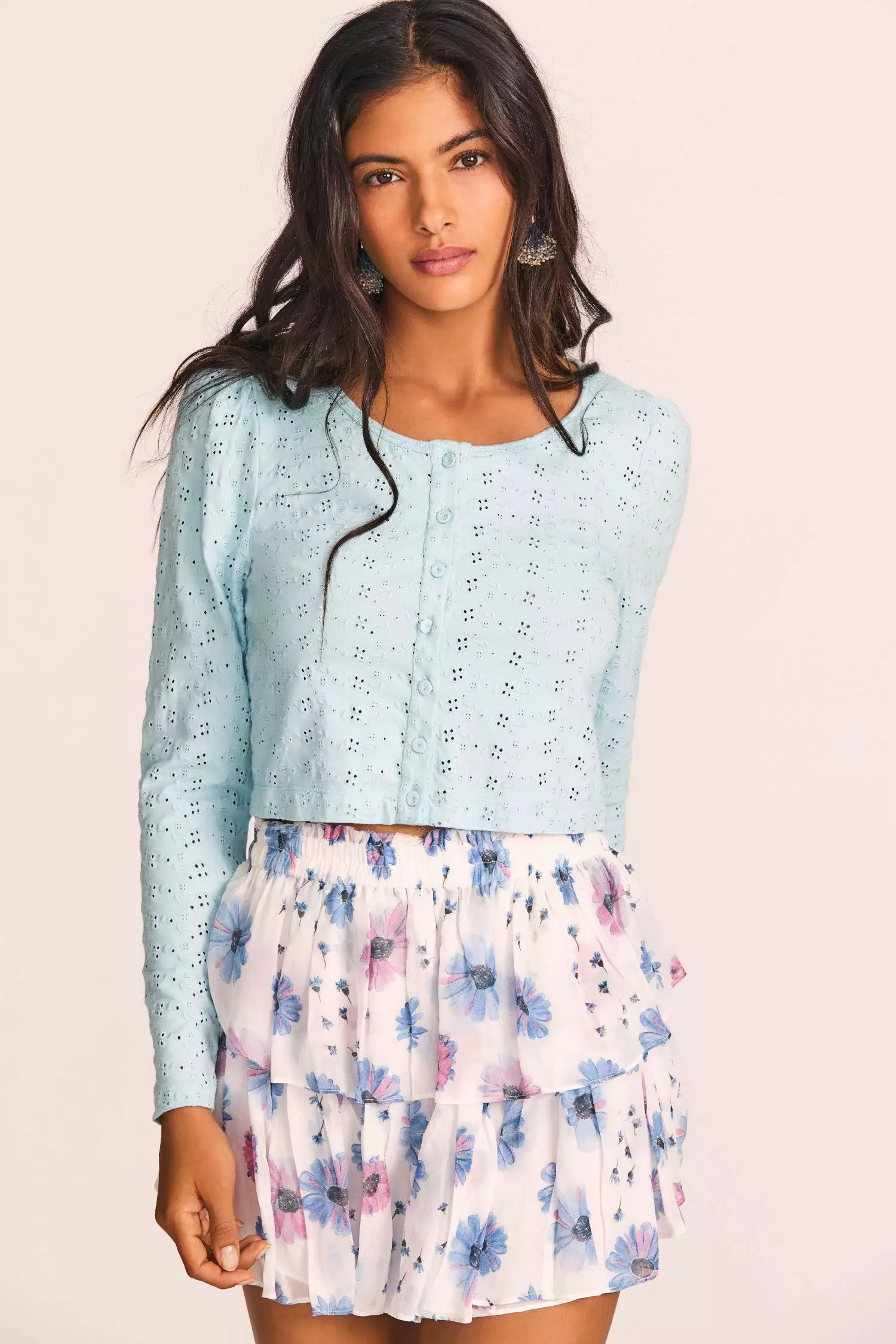 A seasonal staple, our Jonah Cropped Cardigan is reimagined in a cotton floral eyelet. This short and sweet layering piece, perfect for everyday, has a circle neck, fabric-covered buttons down center front and puffed bracelet sleeves.Â