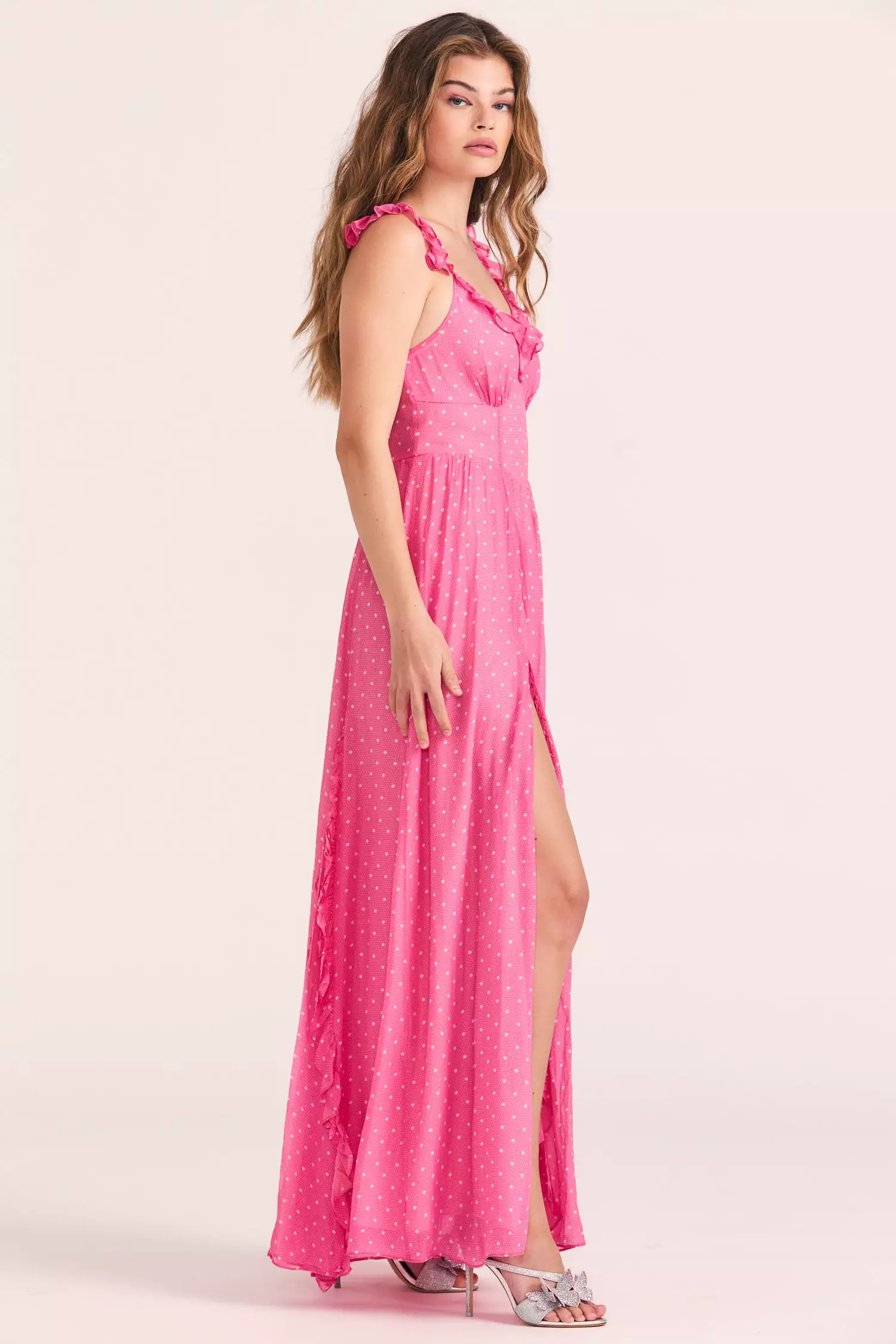 Spring has sprung in our Junia Dress, a delight in silky viscose with a scaled polkadot print. This cheerful frock has a ruffle-trimmed straps mirrored by a flounce along the v-neck. The bust has shirred cups above a princess-seamed, v-shaped bodice. The shirred skirt drapes to a dramatic ruffle-trimmed slit at wearer’s left thigh. Shown here in Hot Pink Cherry.