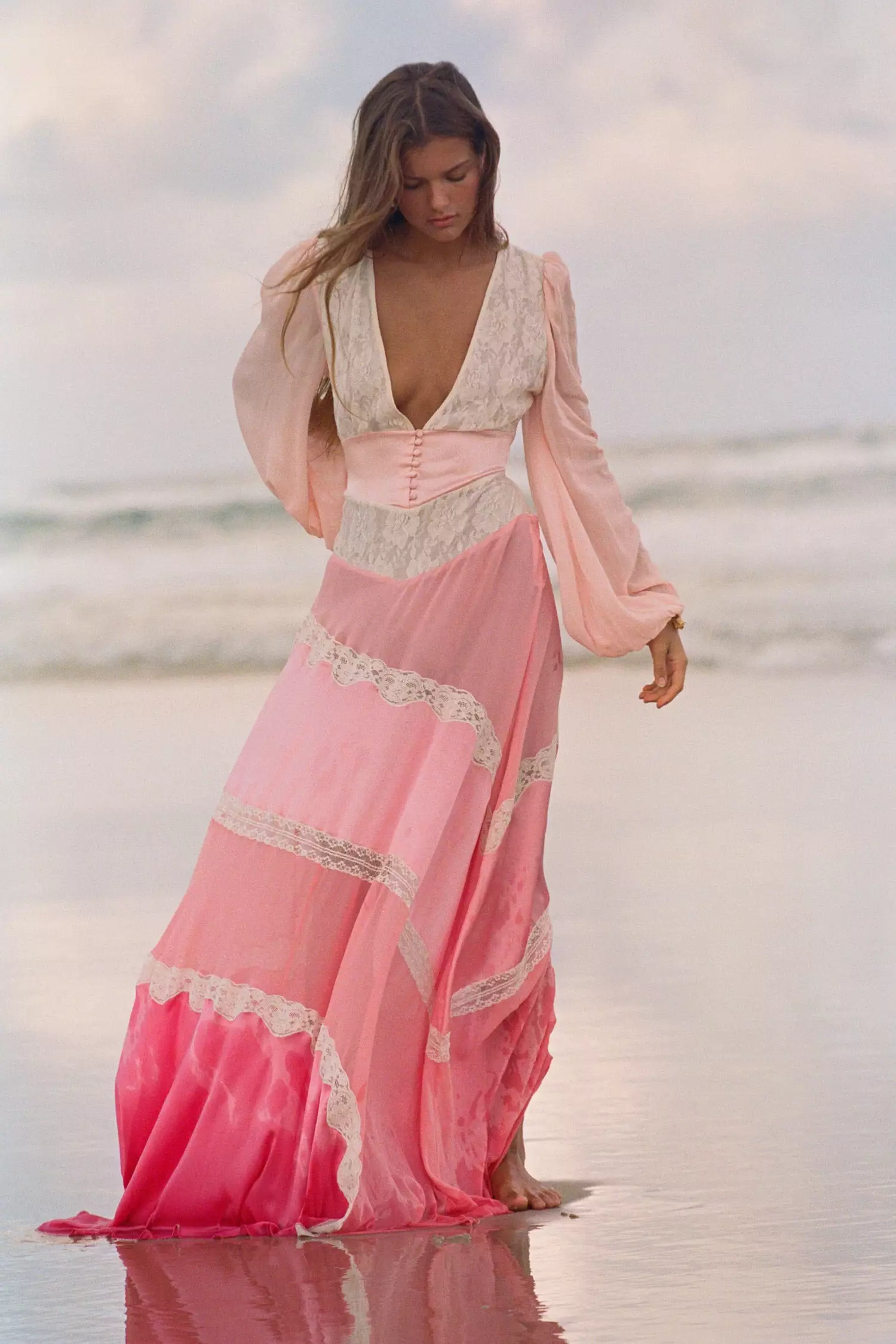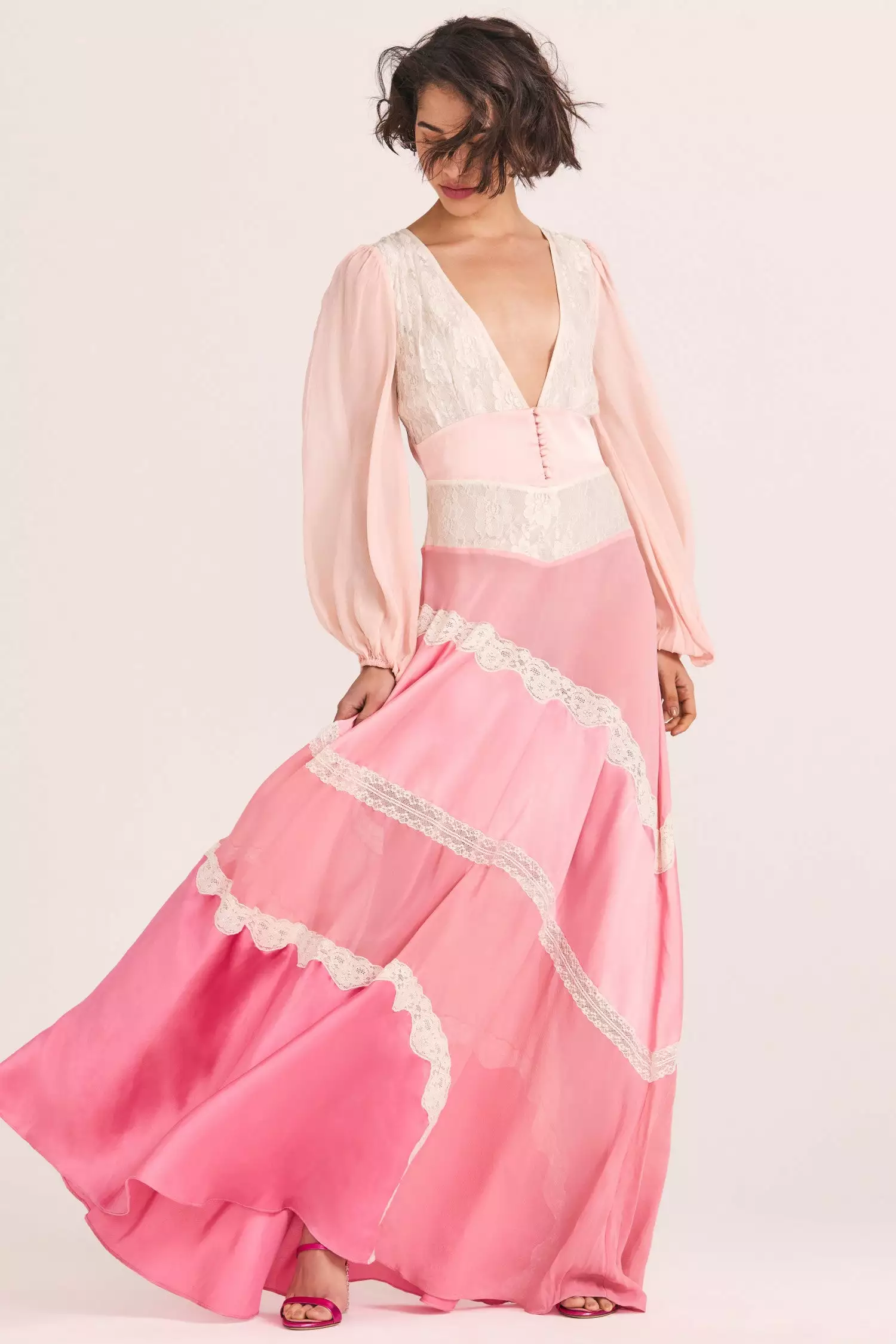 Our new Kinsler Dress is a showstopper in color-blocked shades of pink with mixed custom lace details. This romantic gown’s v-neck plunges to functional buttons at the corseted waistband. Generous long puffed sleeves are shirred with encased elastic at opening. Below a v-shaped seam, the full sweep skirt features alternating diagonal lace panels. Shown here in Pastel Pink Colorblock.