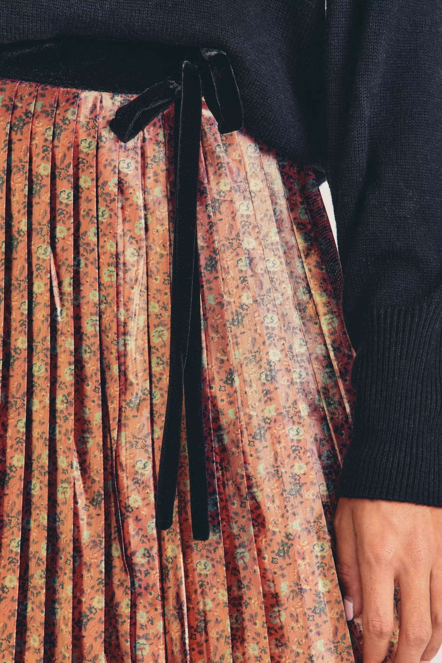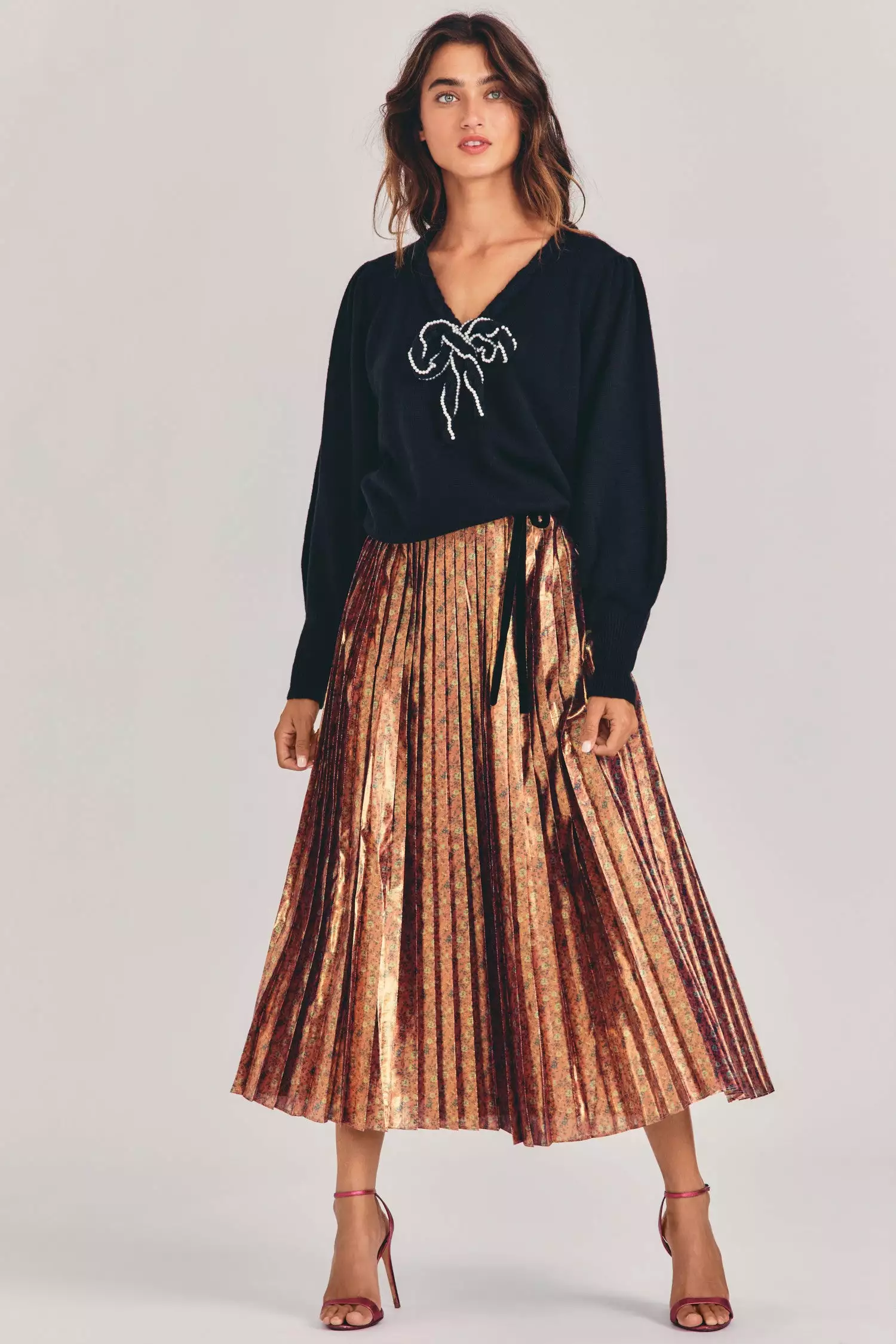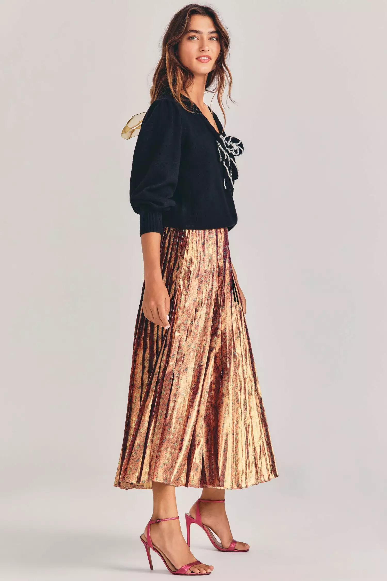Tis the season for our Lotty Skirt in rose gold lamb with a ditsy floral print. This shiny piece blends the classic and modern with a contrast-colored, fixed, velvet waistband, with a bow at wearers left, and a full sweep open pleat skirt. Pair it with our Leonora Pullover. Shown here in Pink Orchid.