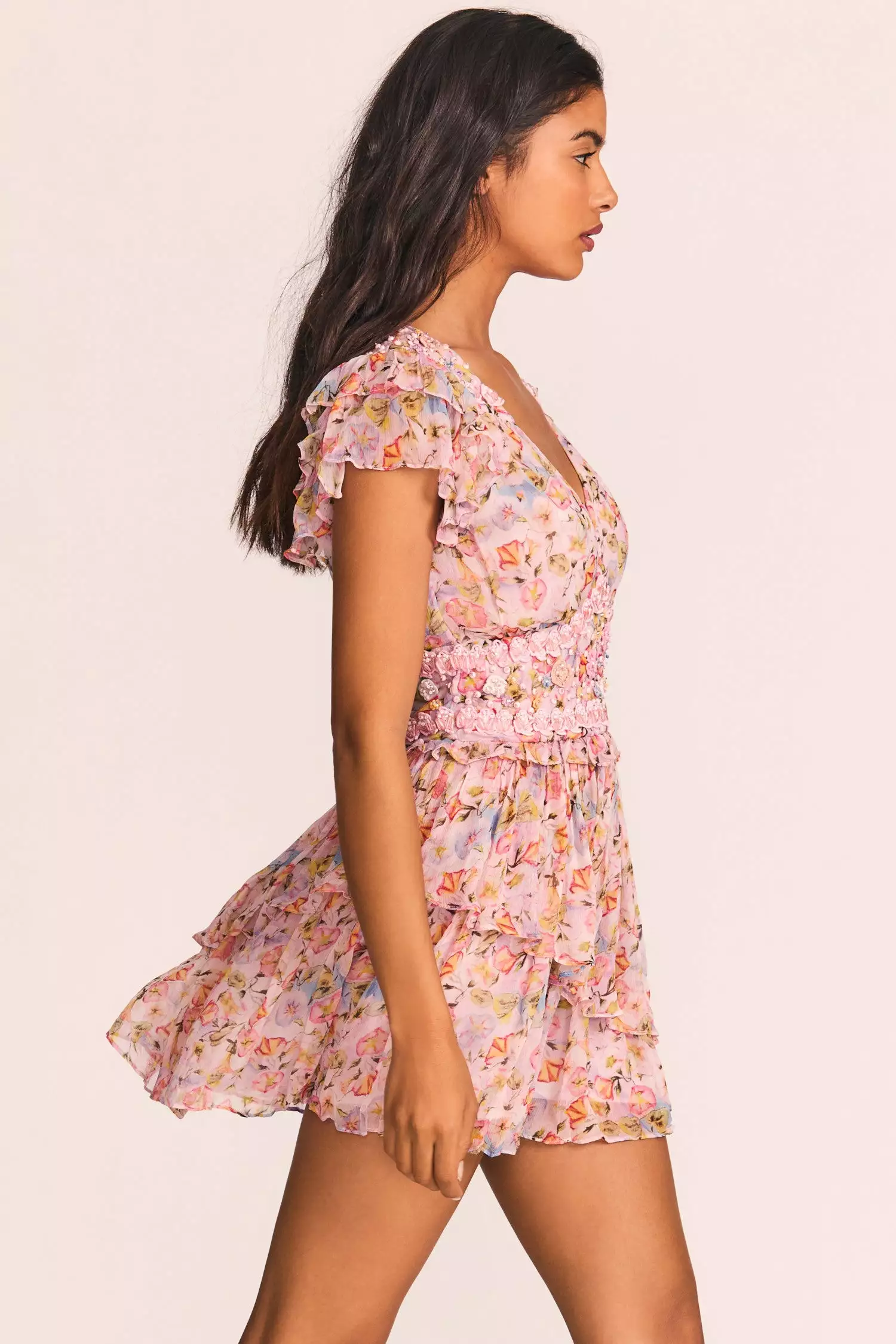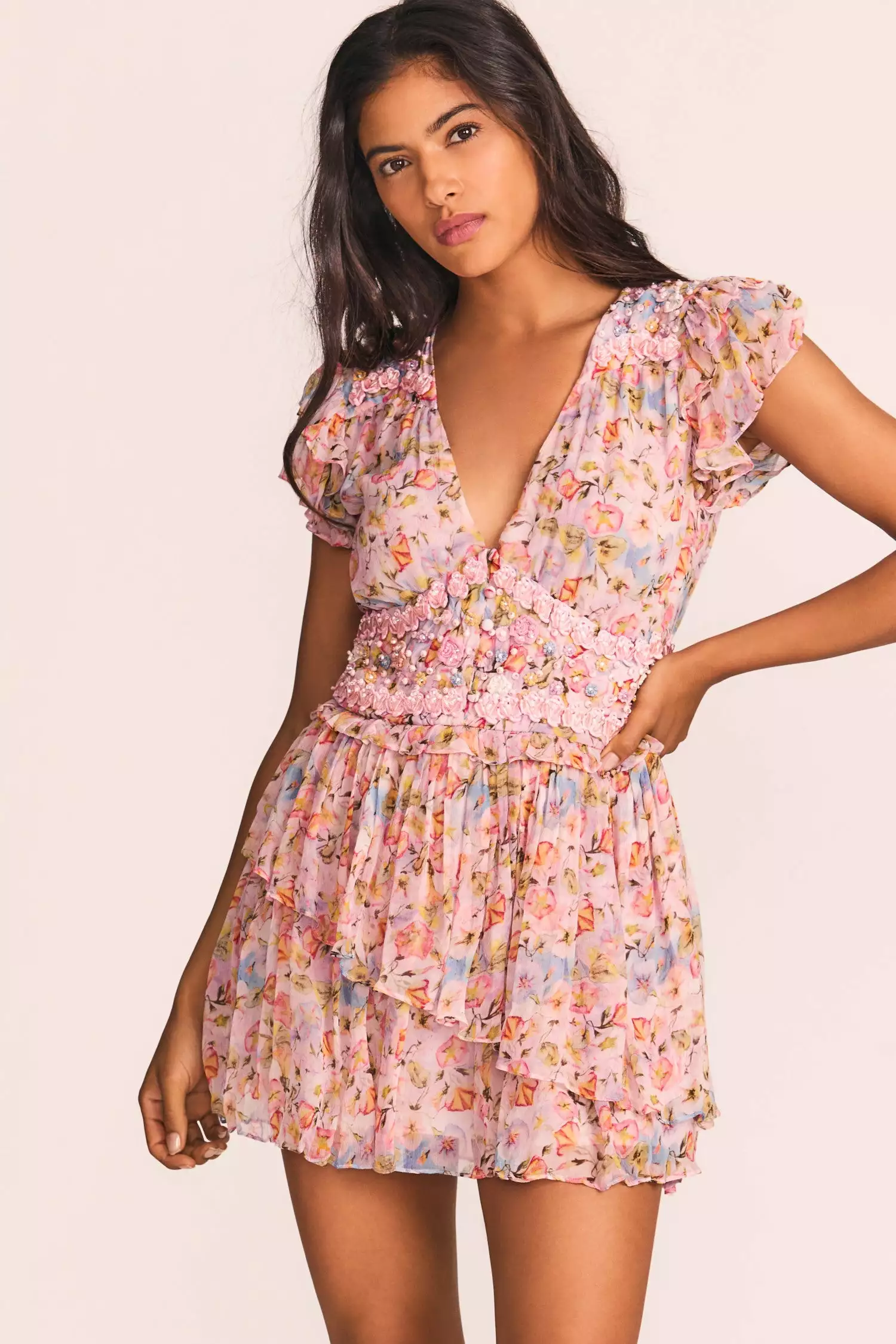 Our Marisela Dress is a walk in the park in textured chiffon with a hand-painted watercolor floral print, handmade rosette appliquΓ©s and beading. This flowery frock has a deep v-neck, double flutter sleeves, buttons down the center of the shaped waistband, a tiny peplum ruffle and one asymmetrical shirred tier above a final flounce at bottom. Wear it with our Branton Cropped Cardigan. Shown here in Pastel Confetti.