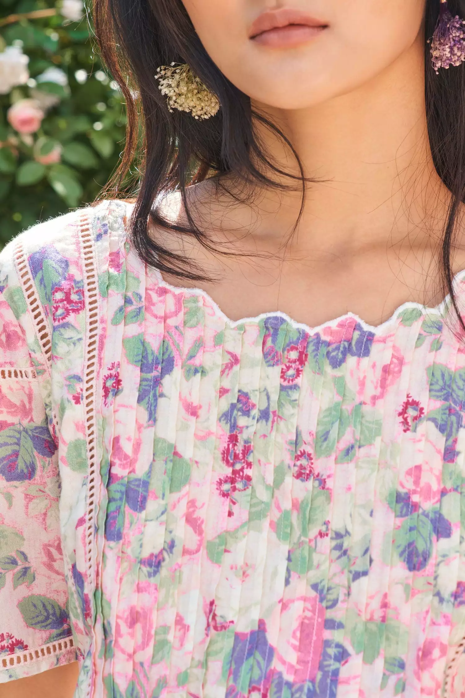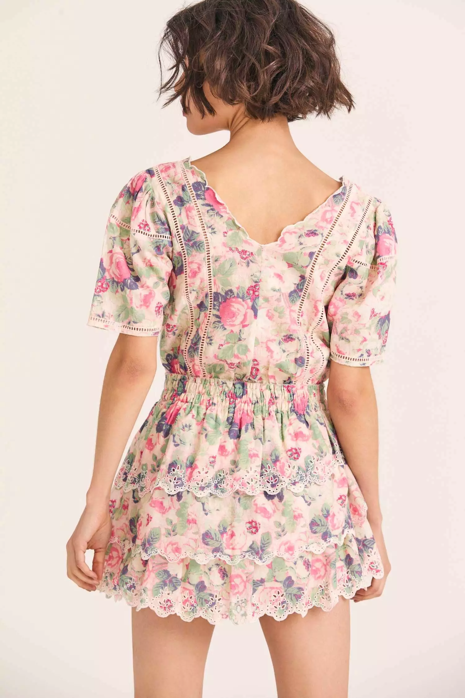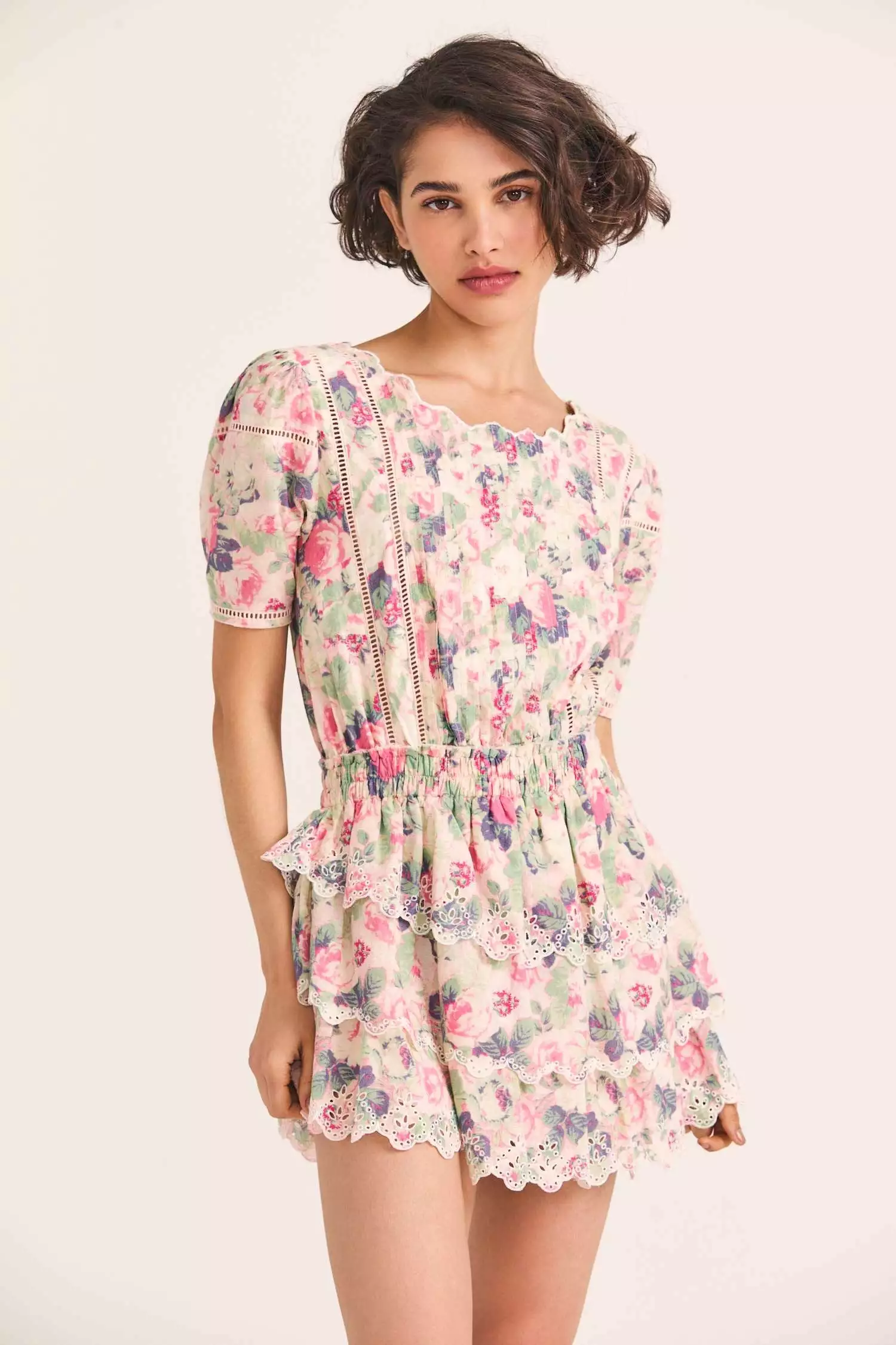 Our Mavis Dress is an instant LoveShackFancy classic in 100% cotton with pintucking, contrast stitching and panels of inset embroidery. This front-to-back minidress features a shaped scoop neck, short sleeves, a shirred elastic waistband and three eyelet-embroidered, asymmetrical skirt tiers with scalloped edges.