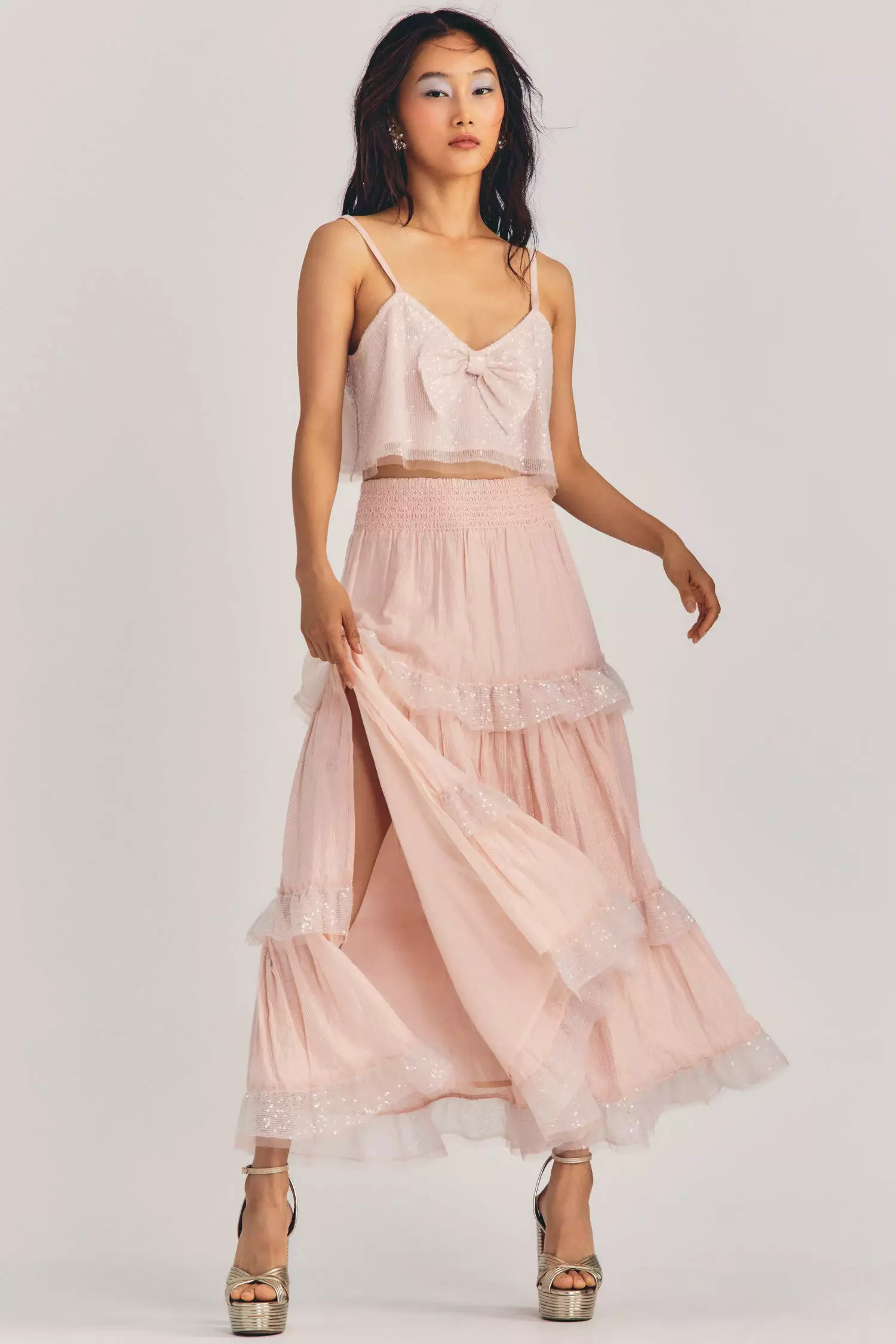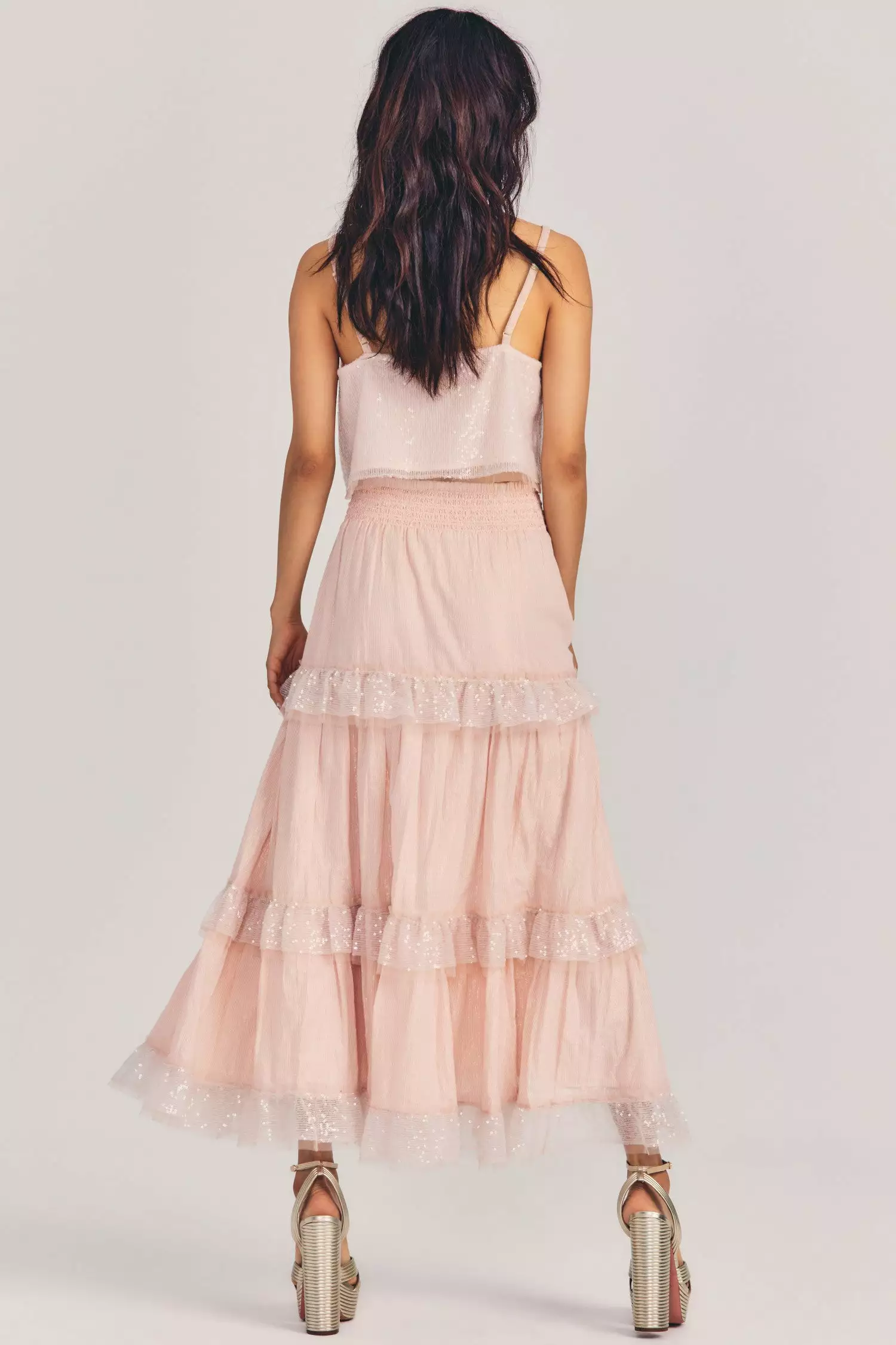 Our Mirella Skirt shimmers from top to bottom. This full sweep skirt features a smocked waistband with decorative stitching, gold lurex threading and three raw-edged tulle flounces with iridescent sequins down its length. Wear it as a set with our Annalisa Cropped Top. Shown here in Seashell Pink.