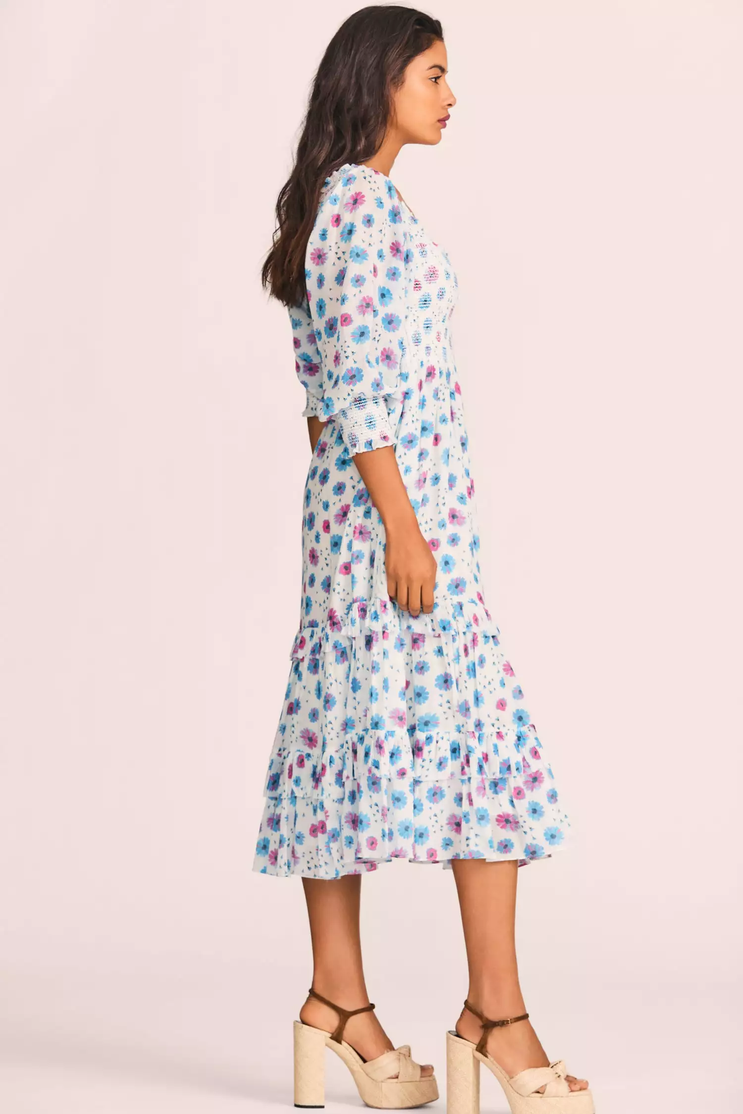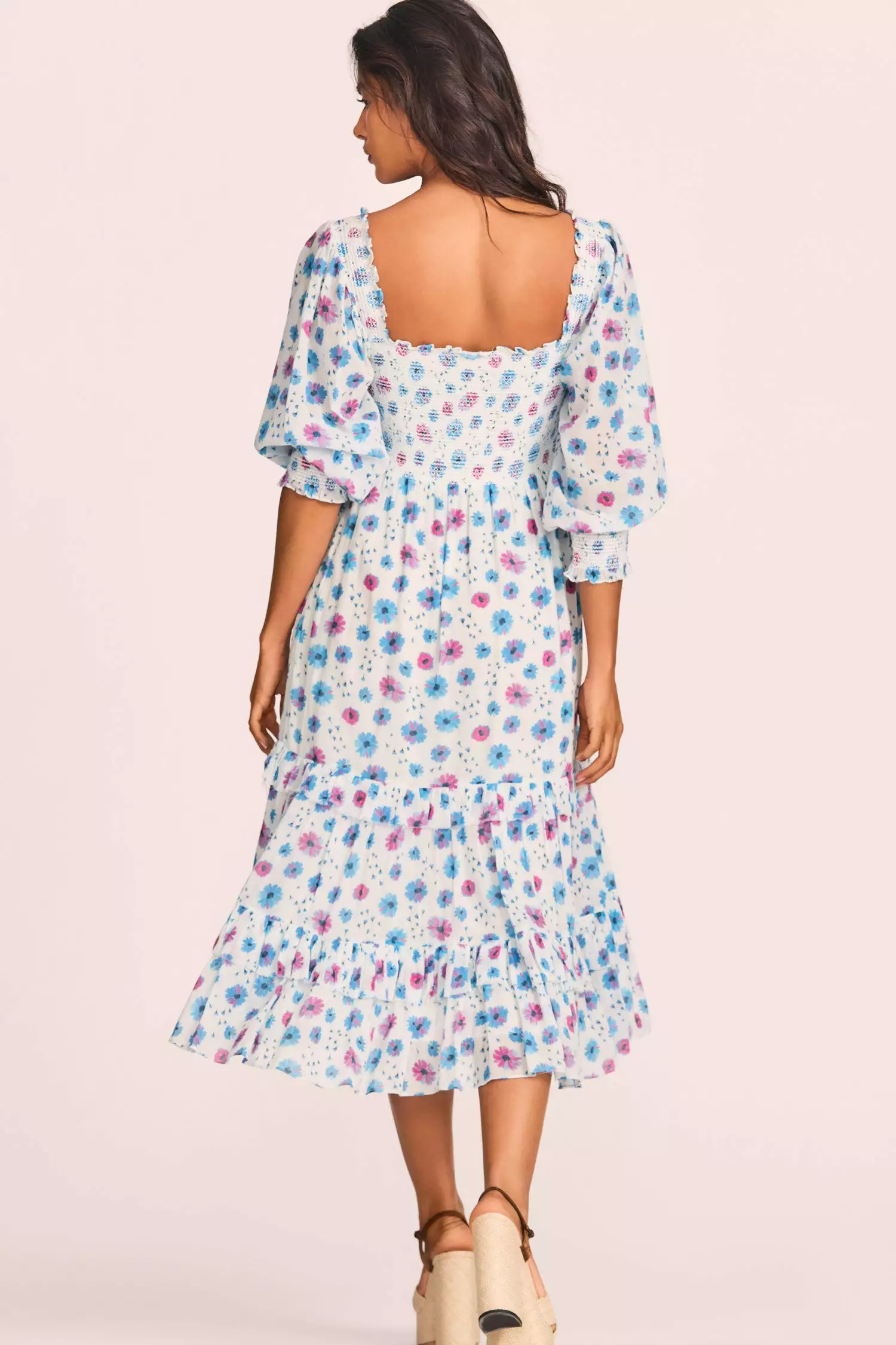 Go with the flow in our Miri Dress in 100% cotton with a hand-painted tossed daisy print. This midi-dress has a ruffle-trimmed square neckline, worn on or off the shoulder. The bodice and bracelet sleeve openings are smocked above a shirred skirt with side-seam pockets, raw ruffle details and a slit at wearerβs right. Shown here in Deep Cotton Candy.