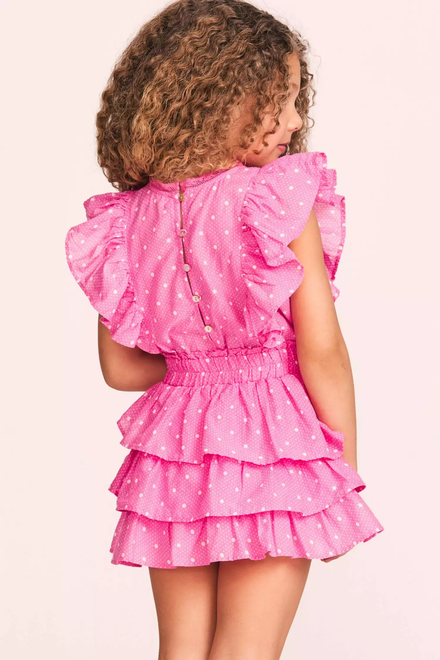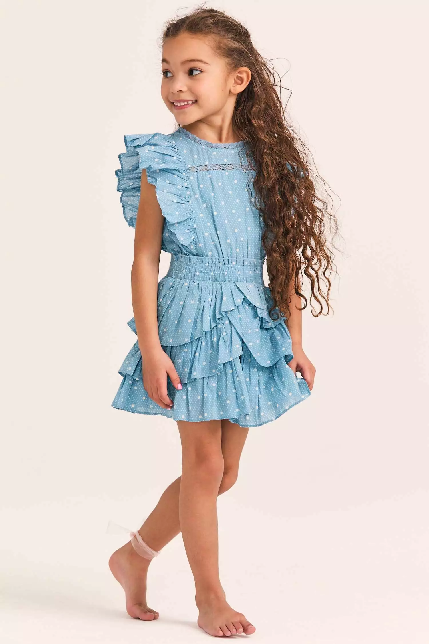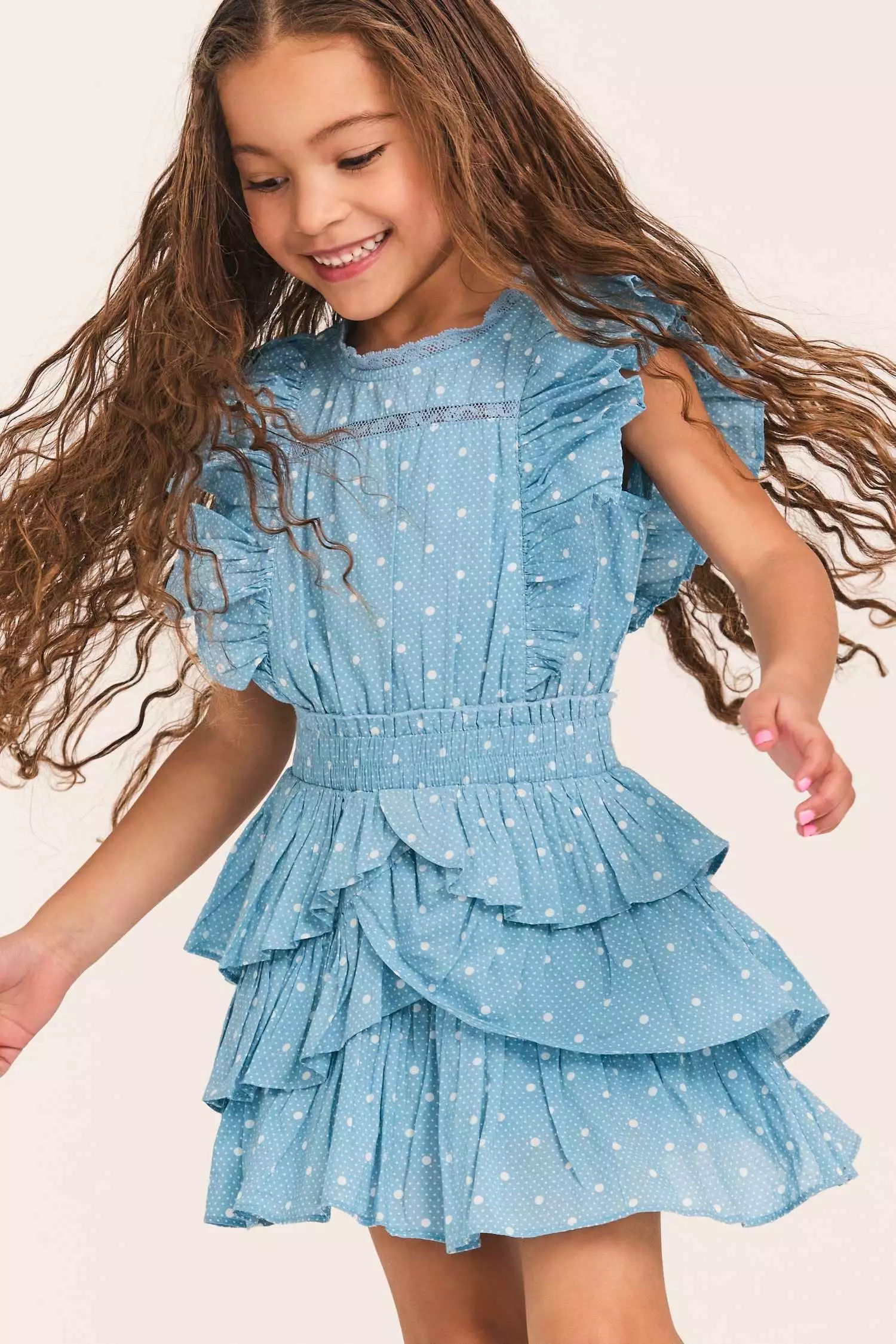 Meet our Decker Dress for girls in 100% cotton with a scaled polkadot print and custom lace. This easy frock has a ruffle-trimmed collar, buttons down center front, flutter sleeves, an elastic waist and overlapping asymmetrical ruffles at the skirt. Layer it with our Girls Daughtry Pullover.