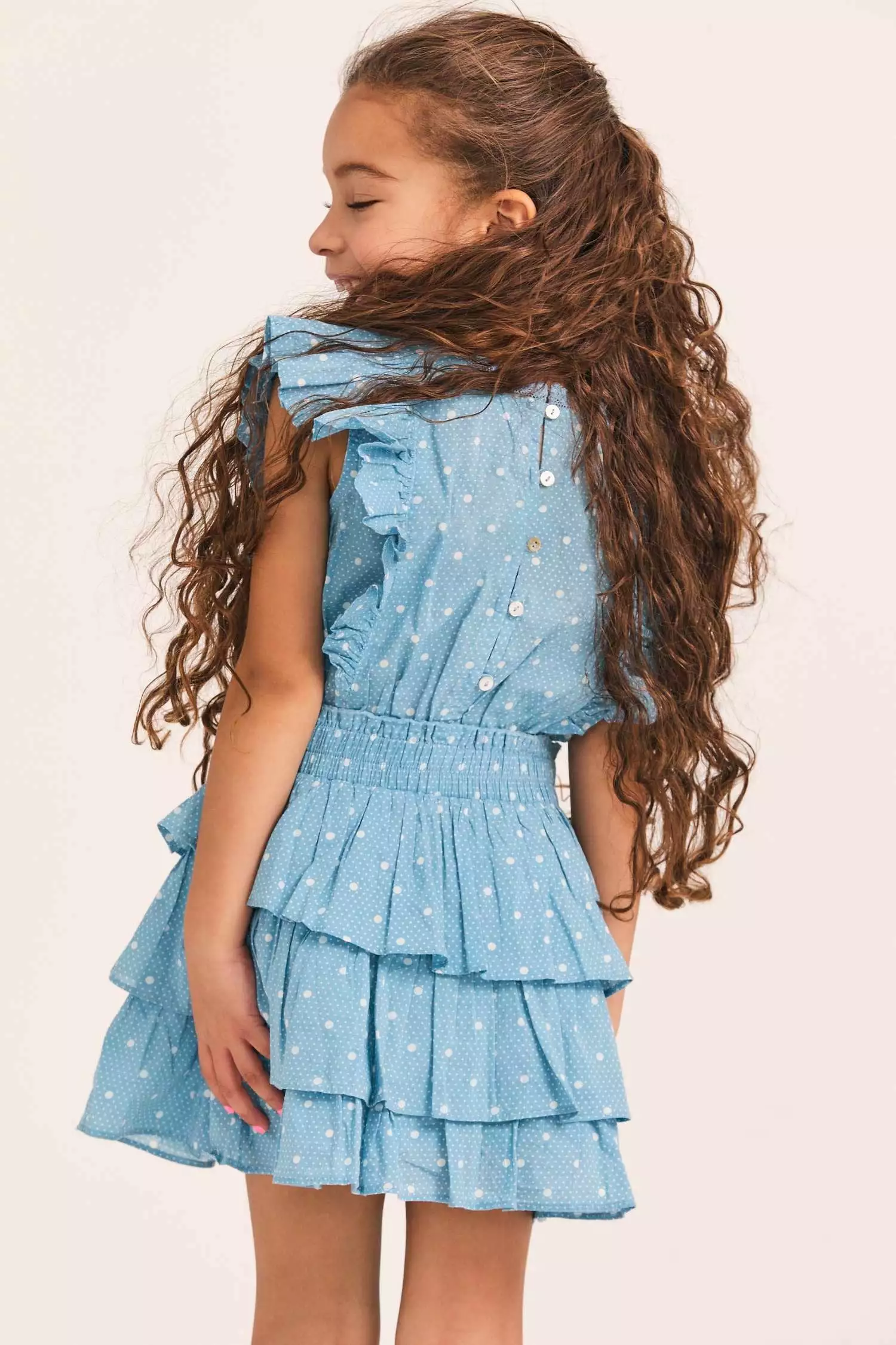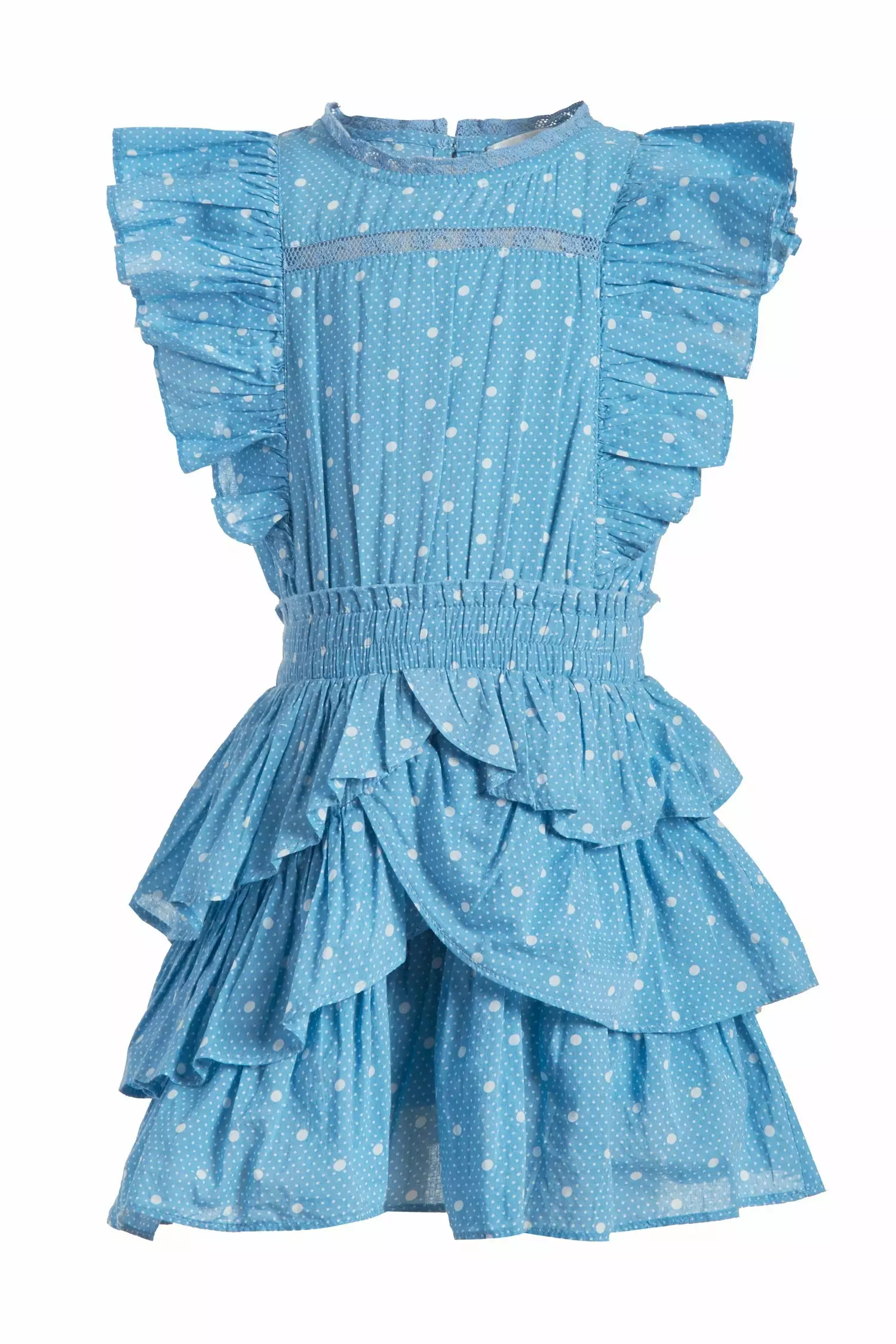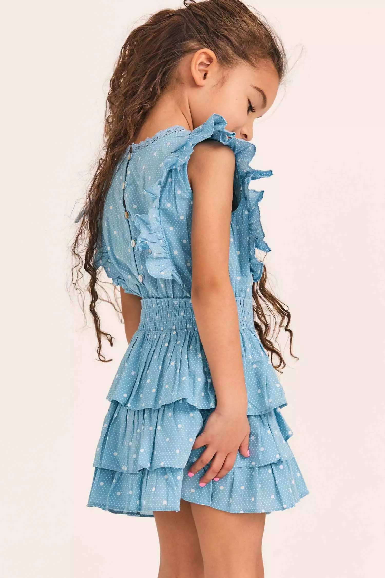 Meet our Decker Dress for girls in 100% cotton with a scaled polkadot print and custom lace. This easy frock has a ruffle-trimmed collar, buttons down center front, flutter sleeves, an elastic waist and overlapping asymmetrical ruffles at the skirt. Layer it with our Girls Daughtry Pullover.