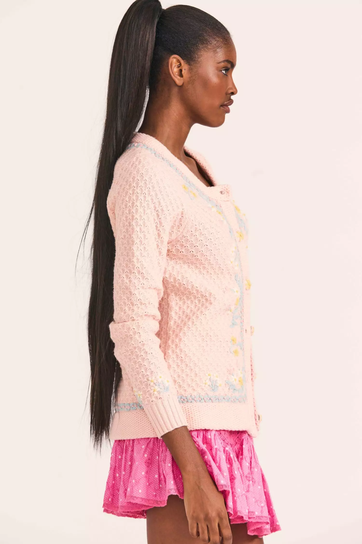 Cozy up to our Naj Cardigan, new in a cotton-wool blend with a stitch mix and hand-embroidered contrast florals. This layering sweater has an easy boyfriend feel with a scoop neck, ribbed cuffs at sleeve openings and a functional placket down center front with special embroidered flower buttons. Pair it with our Felice Mini Skirt. Shown here in Pearl Blush.