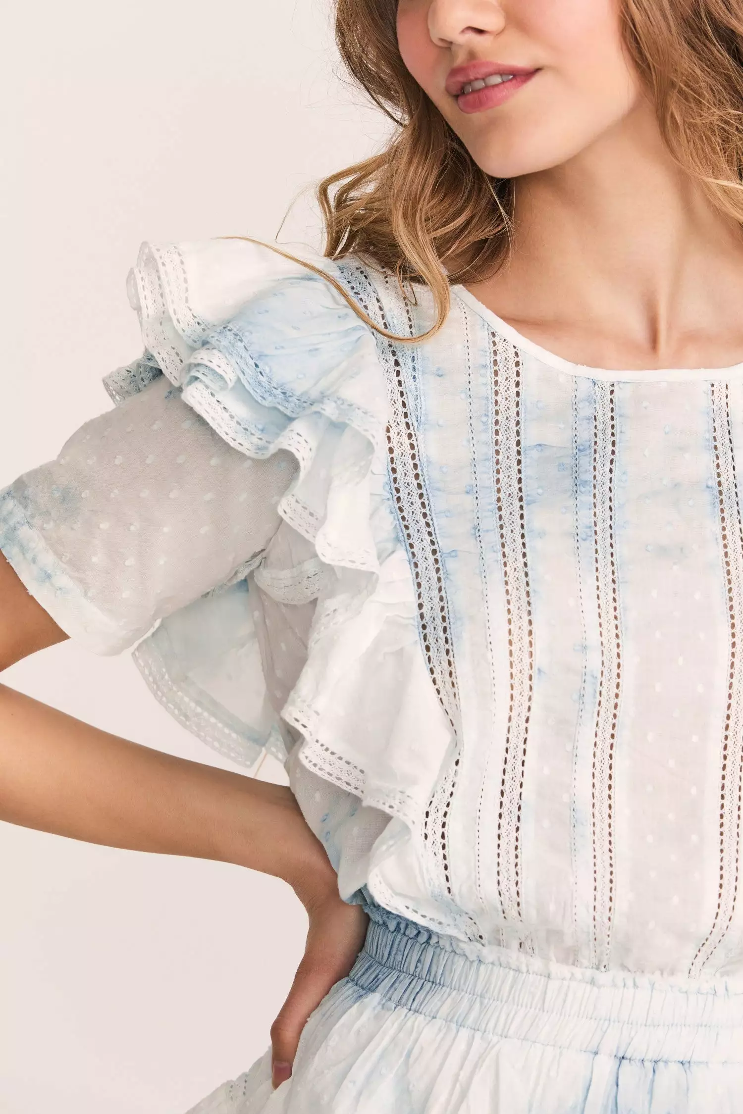 Our signature Natasha Dress returns in 100% polkadot dobby cotton. This easy frock features double ruffled flutter sleeves, which cascade down the front and back of the body to highlight the elasticated waist. Intricate custom lace panels are inset and trim the skirtβs flounces.
