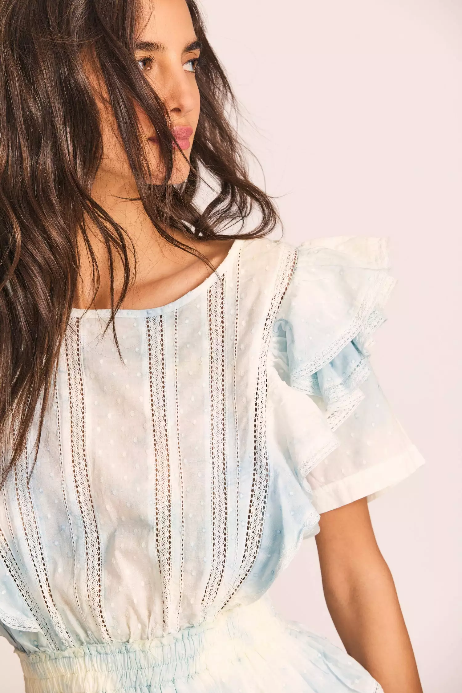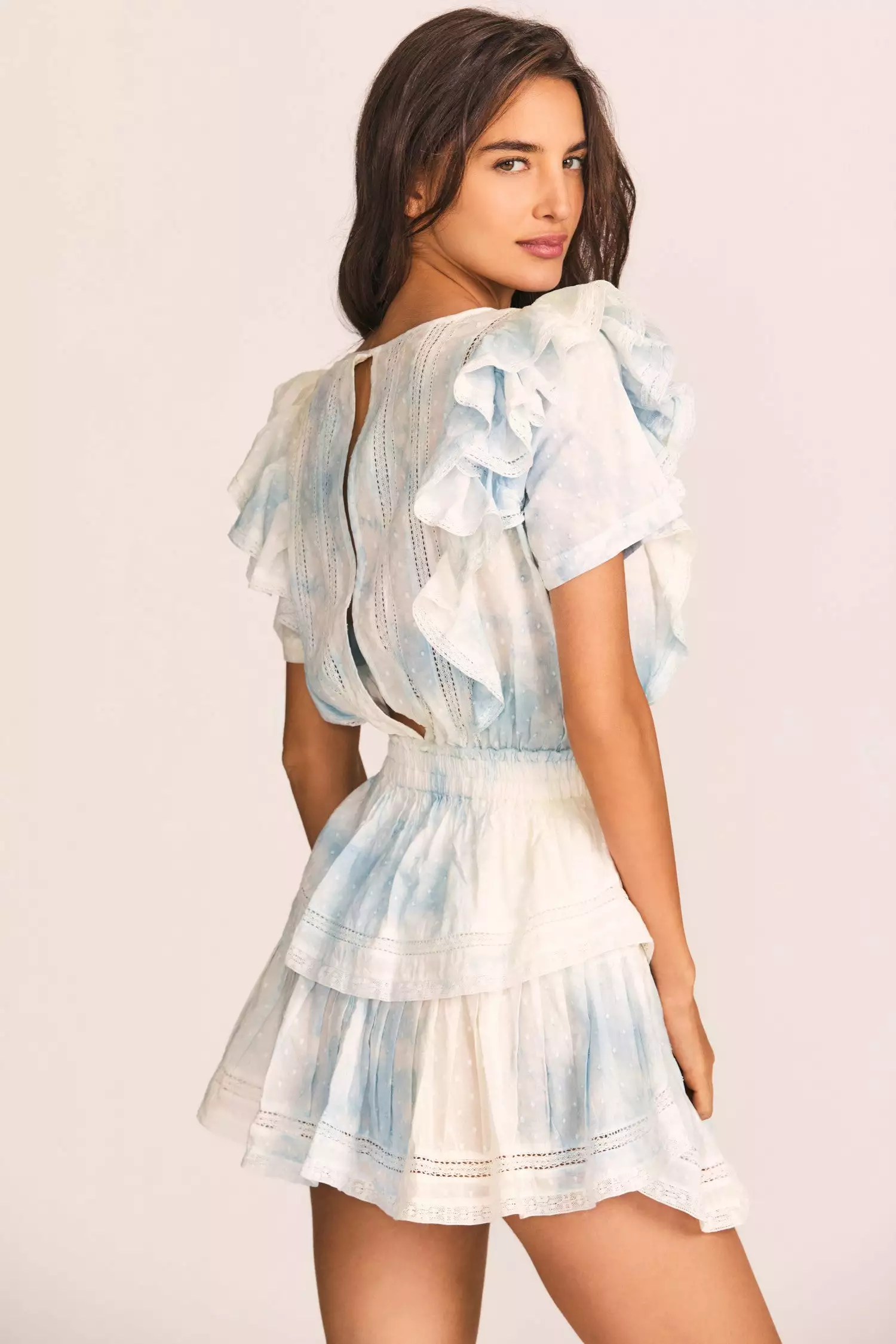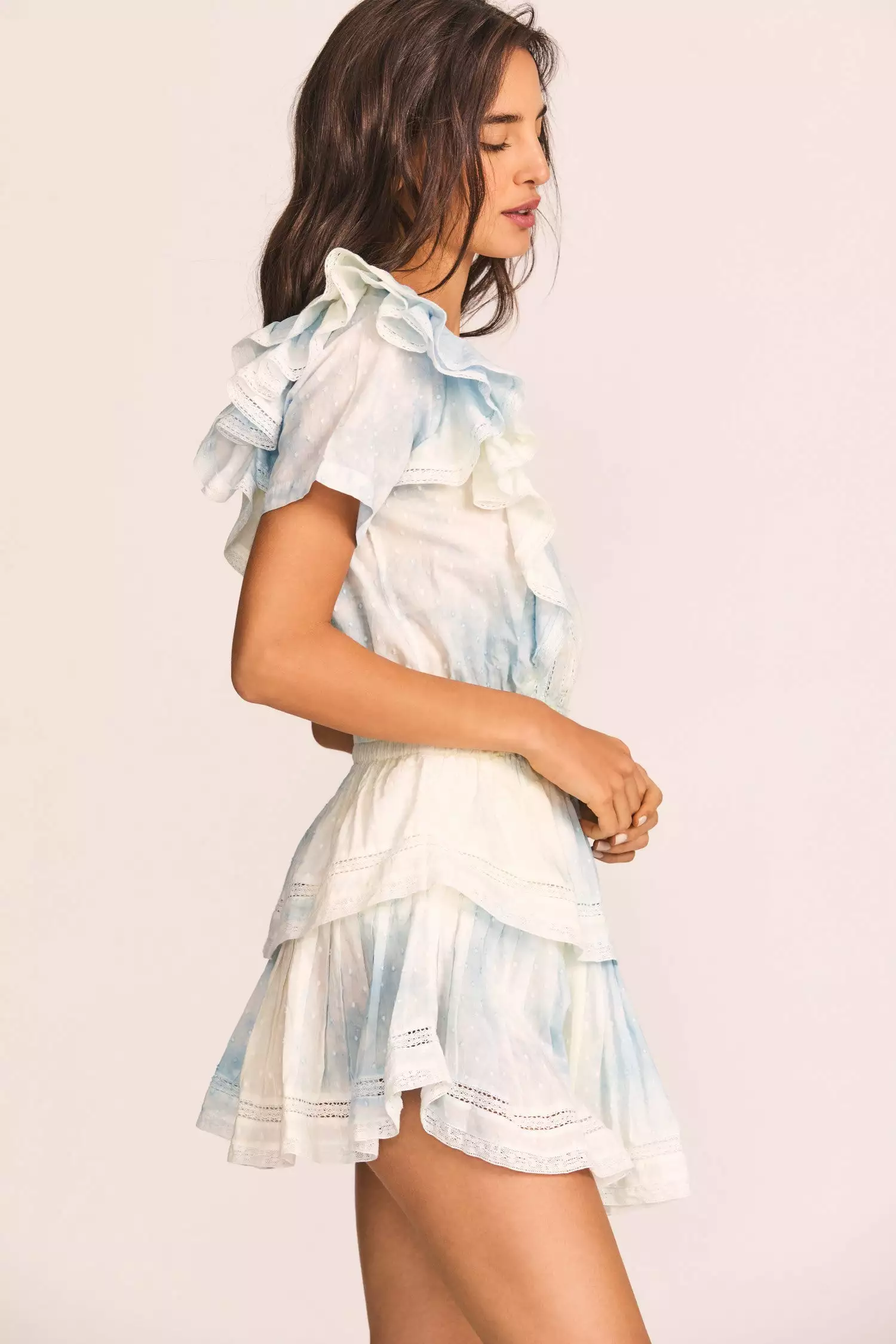Our signature Natasha Dress is back in hand tie-dyed dotted cotton. Beneath a demure crewneck, this minidress features a double ruffle trim cascading along the princess seams and collapsing over short sleeves. Below an elasticated waist, the skirt flares to two flounces at bottom. Accessorize this with our Karelia Bag. Shown here in Lily Pond Hand Dye.