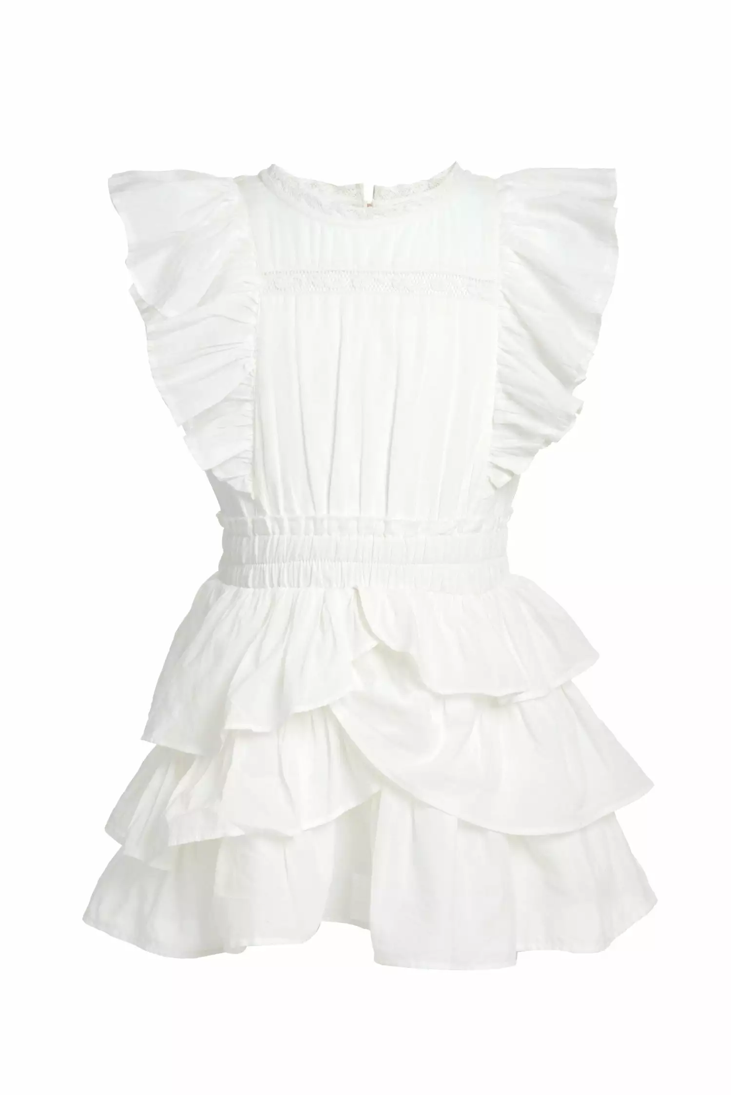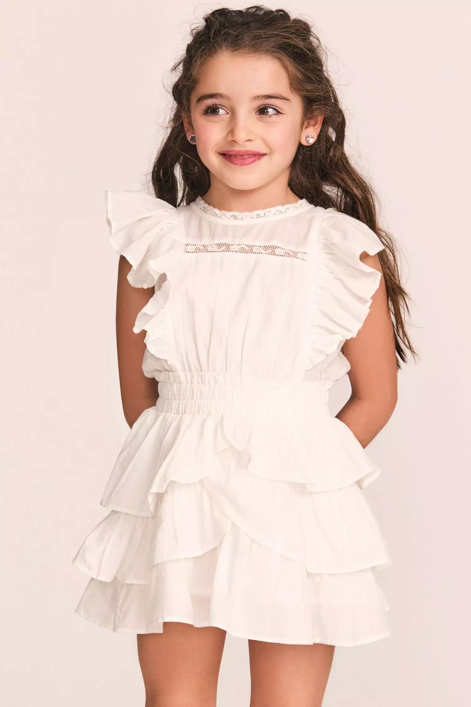 Meet our Decker Dress for girls in 100% cotton with custom lace. This easy frock has a ruffle-trimmed collar, buttons down center front, flutter sleeves, an elastic waist and overlapping asymmetrical ruffles at the skirt. Shown here in True White.