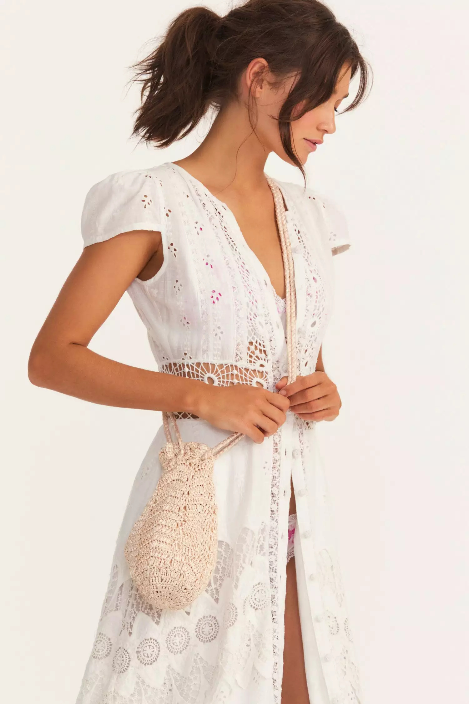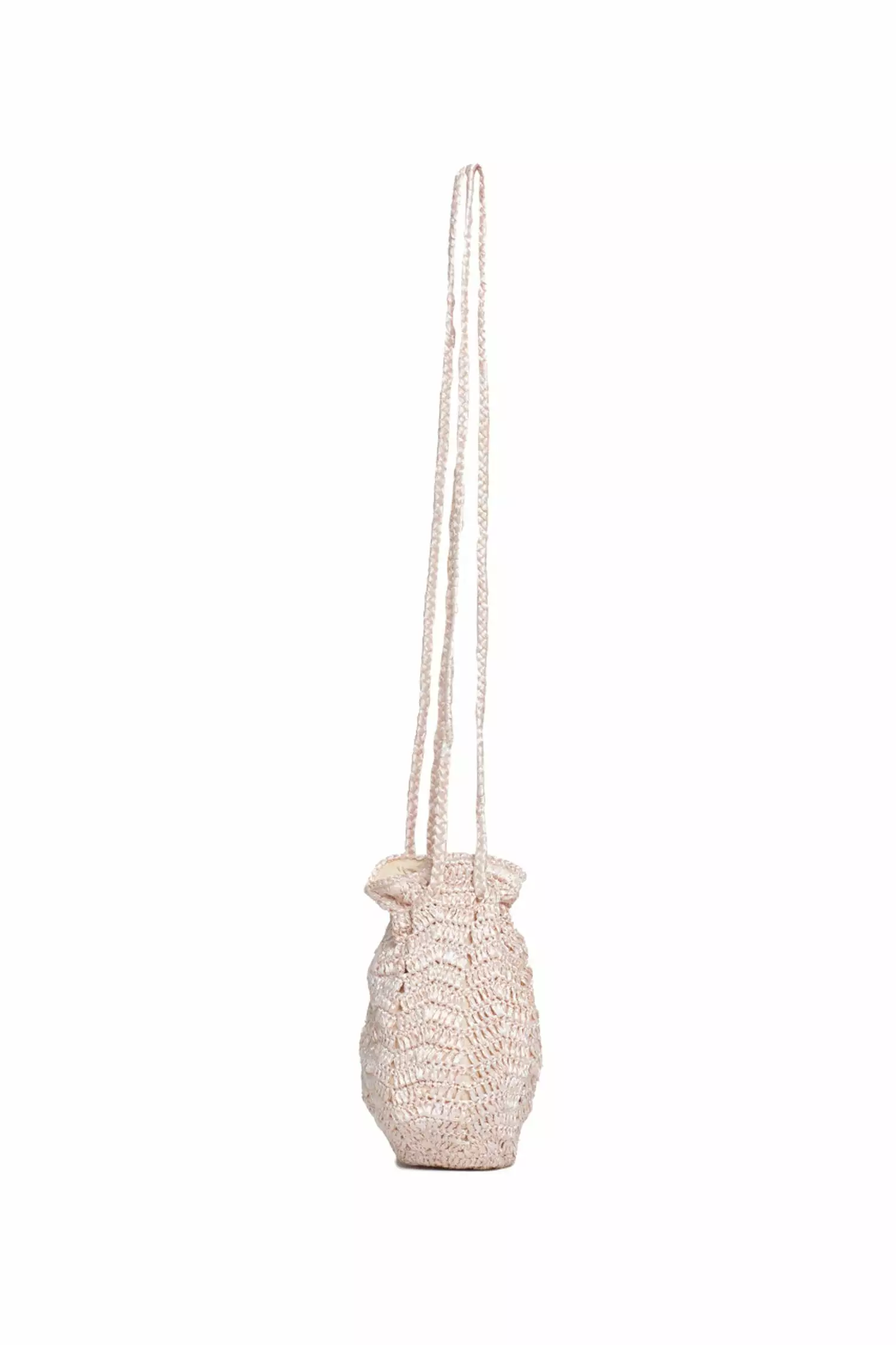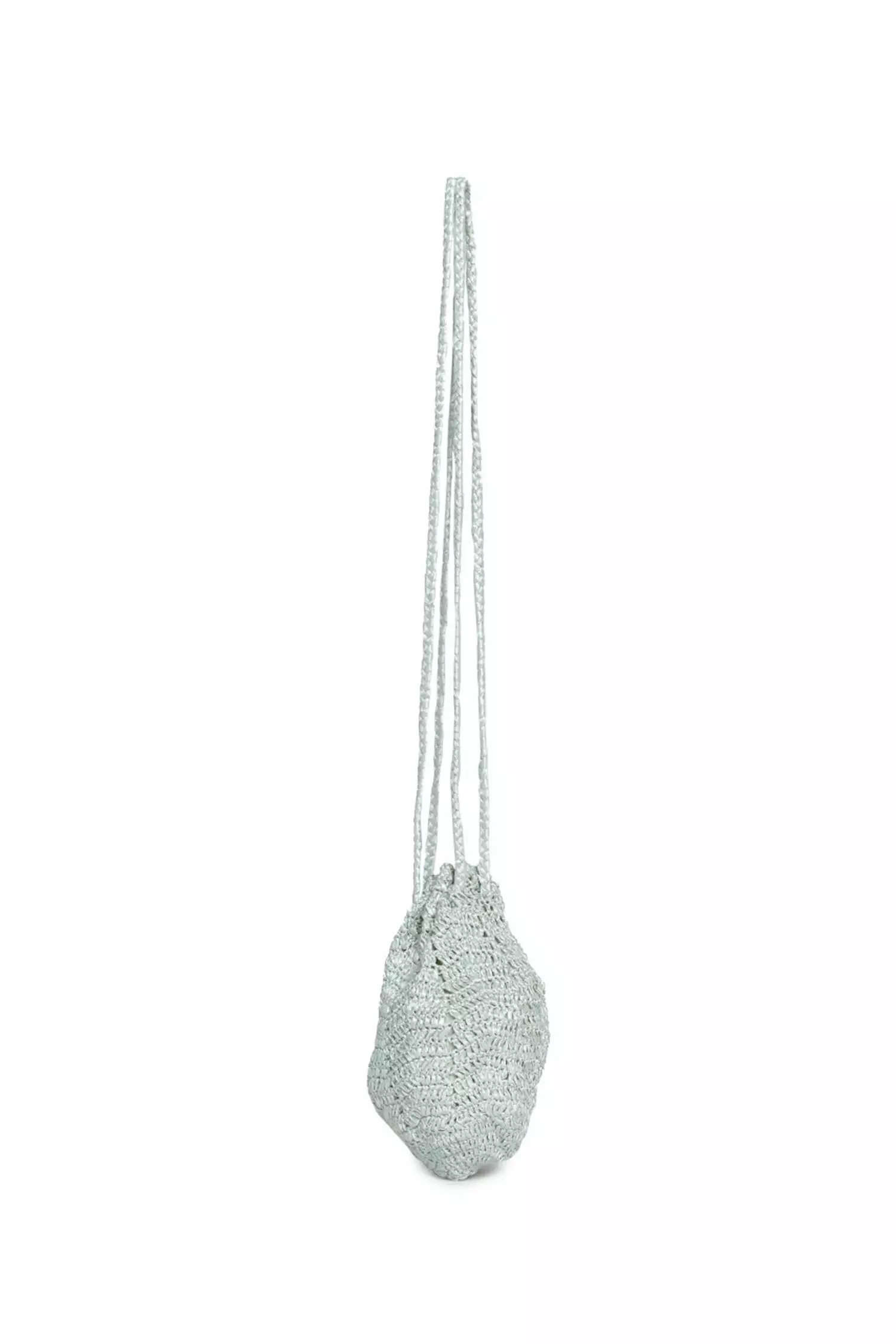 Our Karelia Bag is brand new in delicate hand macramΓ©. This simple drawstring bag, perfect for everyday, has a double strand strap that cinches the sack purse and an interior pocket.