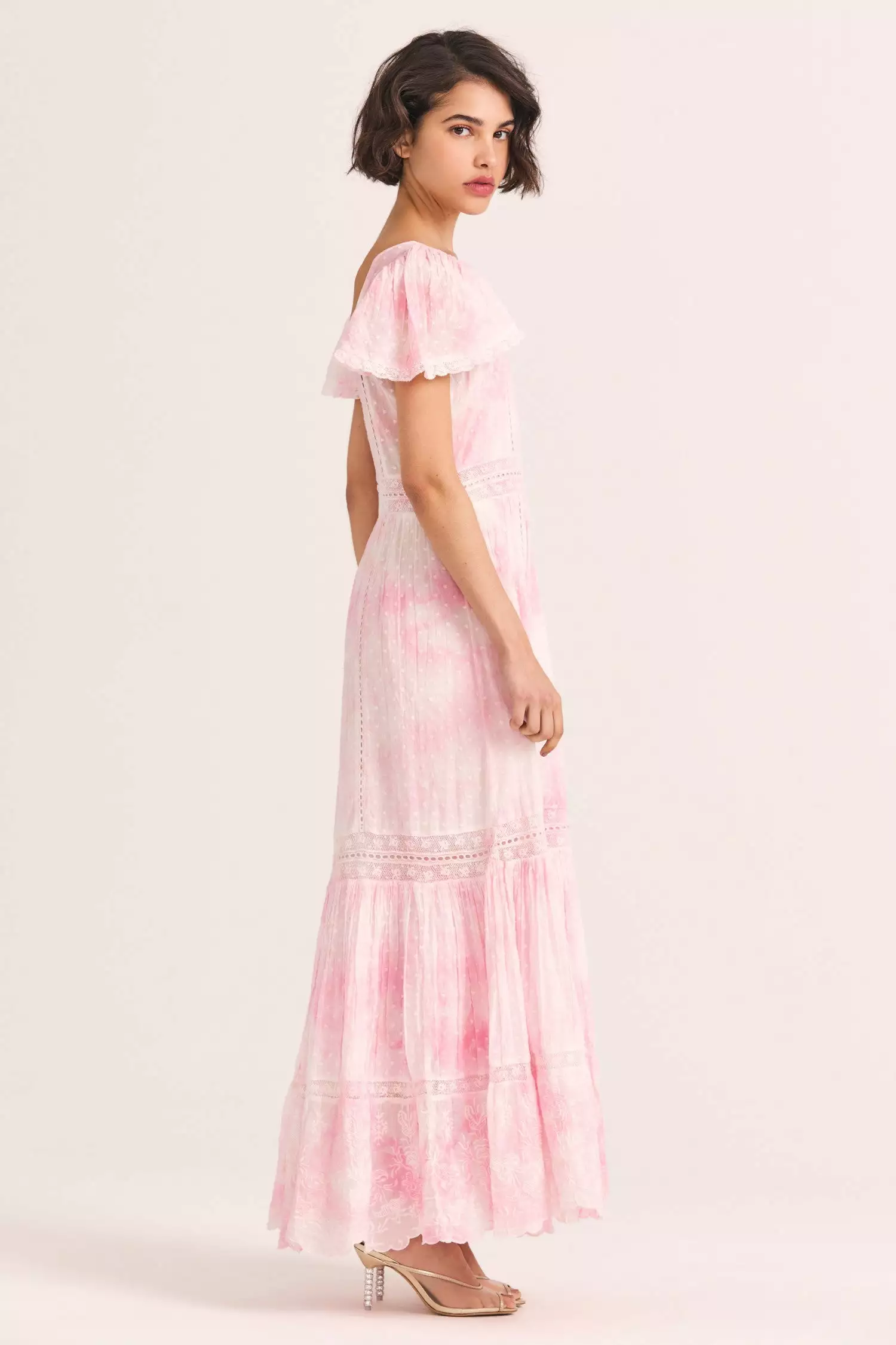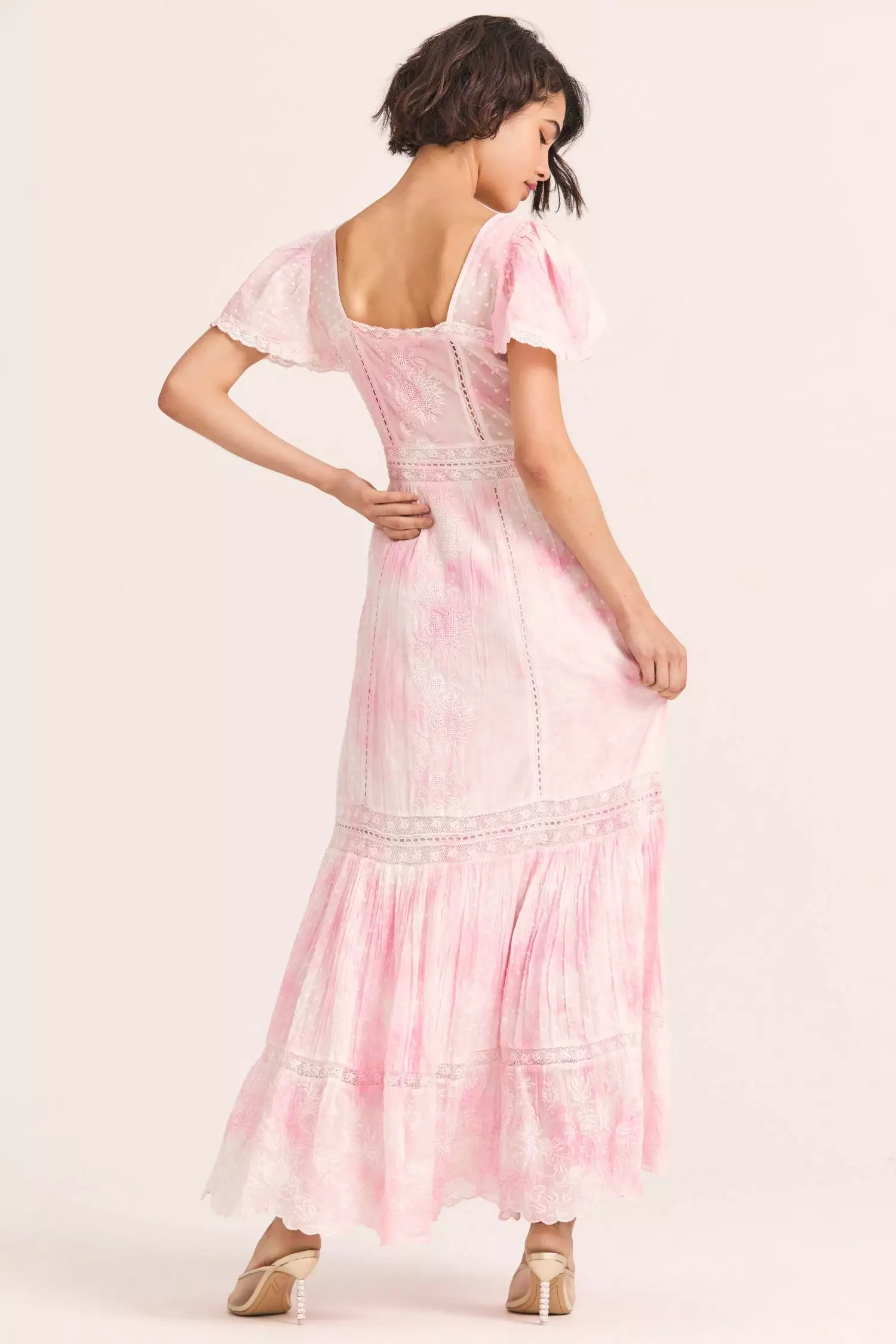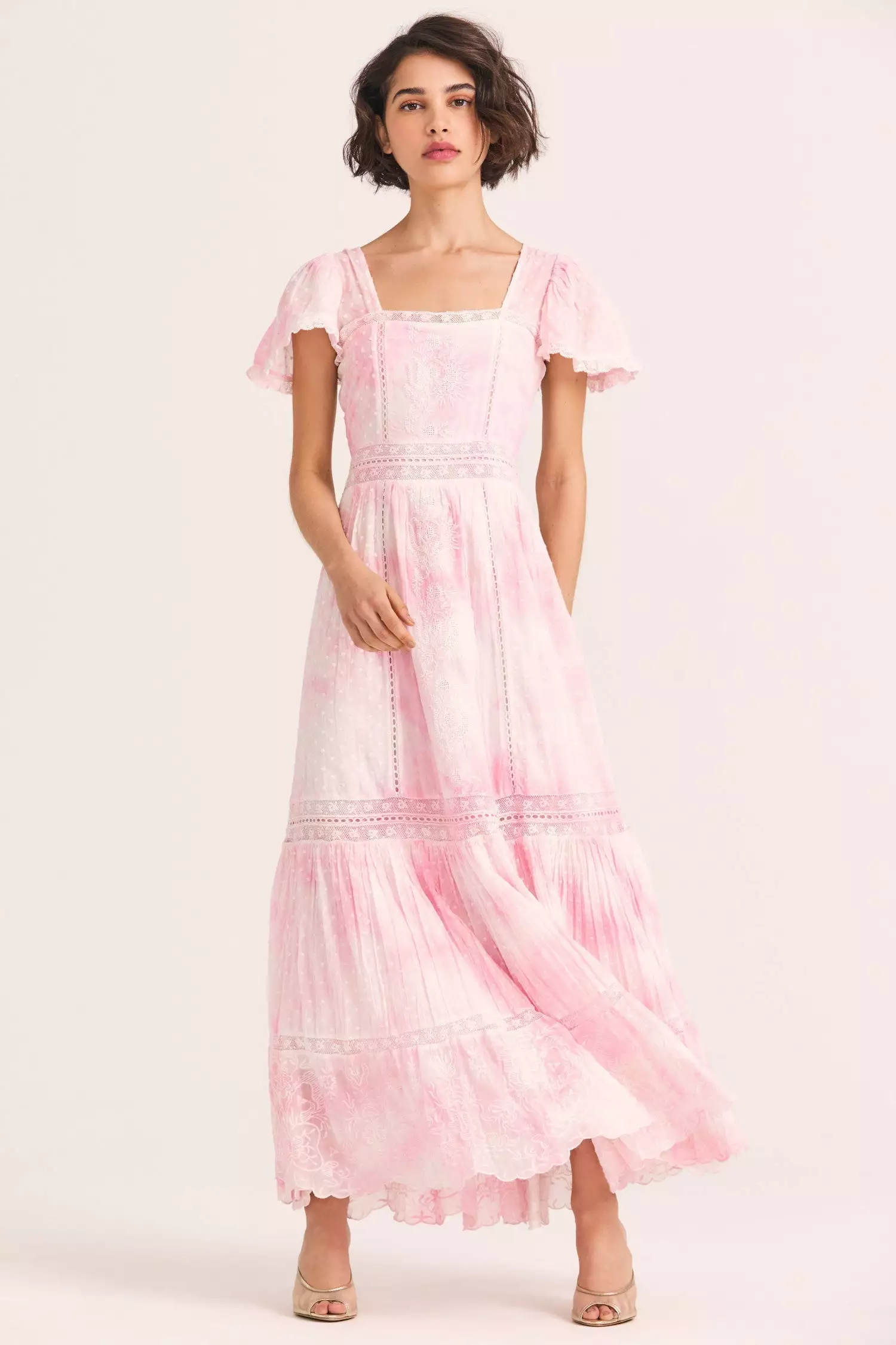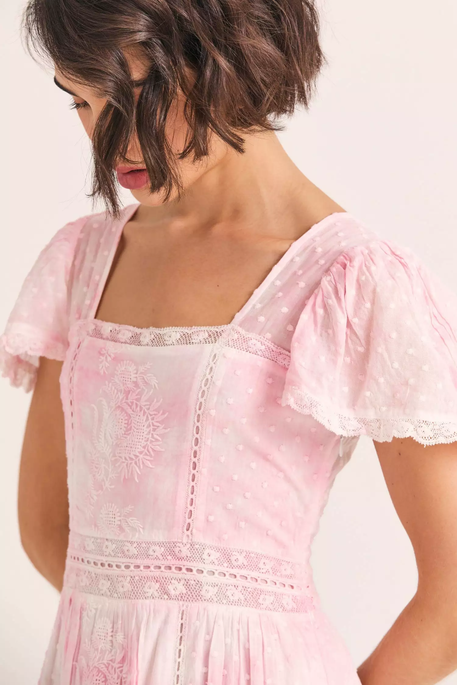 Our Norma Dress romances in hand-dyed cotton with all-over dot and floral embroidery. Lace trims the square neckline and flutter sleeves. At center front are panels of lofty sunflower embroidery. The princess seams and waist feature inset lace details. The full sweep skirt lets out into a shirred flounce at the bottom with a scalloped edge. Accessorize it with our LSF x Lele Sadoughi Bow Headband.