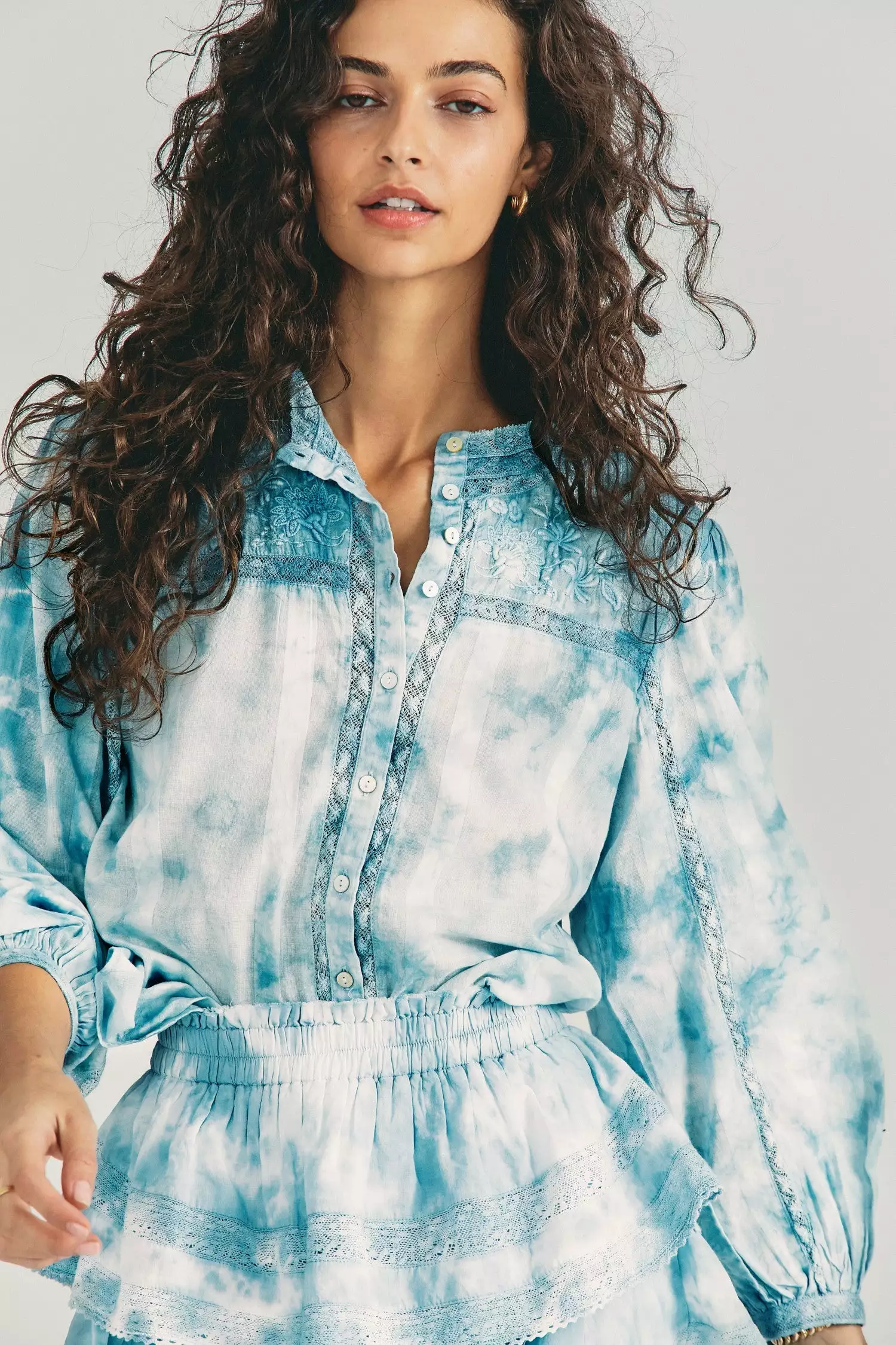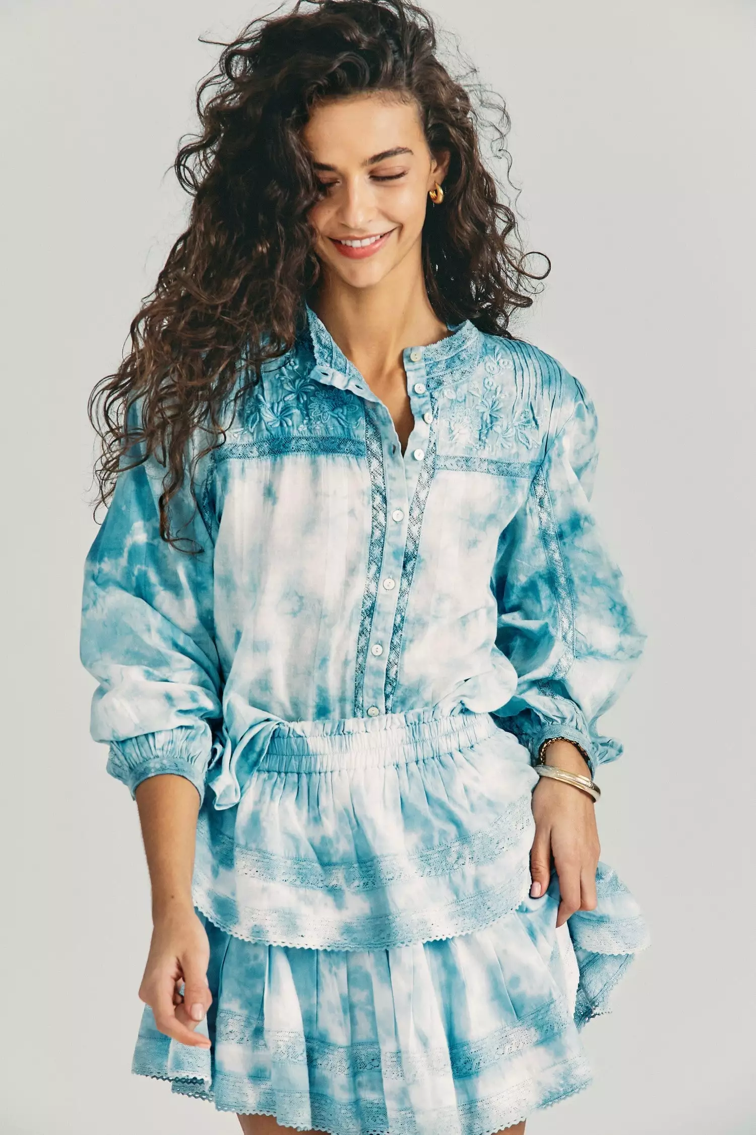 Our Ronda Top returns in naturally hand-dyed cotton with inset floral lace. Our take on the collared shirt features a lofty wildflower embroidered yoke at front and back. Relaxed blouson sleeves have pintucking at the shoulders and let down to small functional cuffs. Center buttons run the length of the front. Wear it as a pair with our Ruffle Mini Skirt.