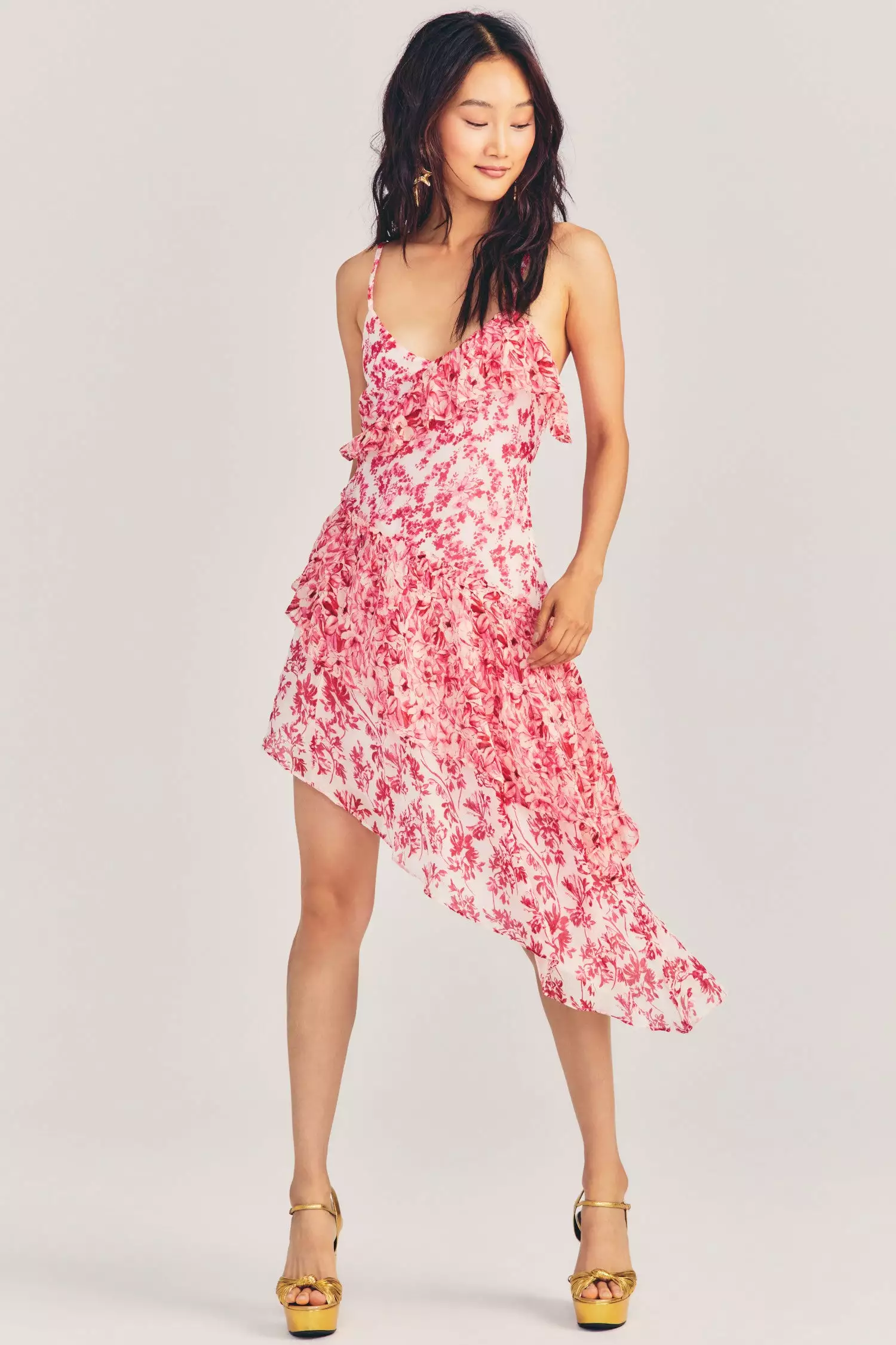 Our Newport Dress is new in 100% silk with a mix of monochromatic custom floral prints. This angled sundress has adjustable spaghetti straps, a v neckline and a faux wrap with a diagonal ruffle detail at front bodice. That motif is mirrored at the skirt with a second ruffle that trails down from the right hip above a final asymmetrical shirred flounce at bottom. Shown here in Campfire Breeze.