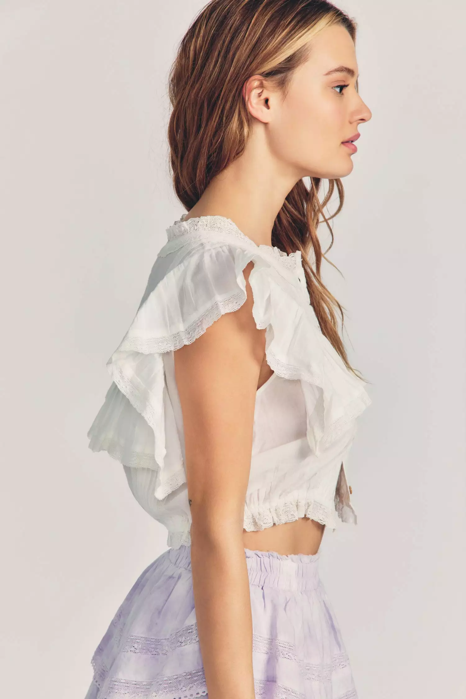 Our vintage inspired wild field Victorian features intricate inset lace trims and allover pintuck details for timelessly romantic pieces. The Nora top is an easy, everyday to be worn buttoned down the front or open as a layer. A little yoke ruffle continues down the sleeve of this cropped style. Shown in Antique White.