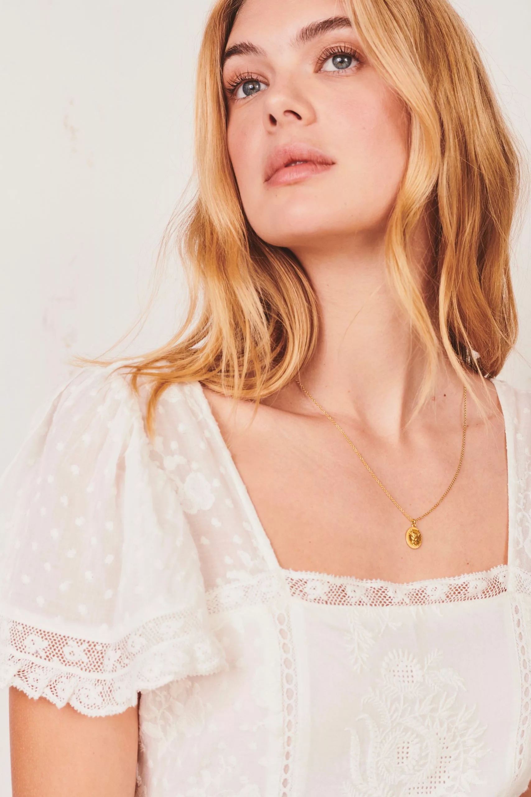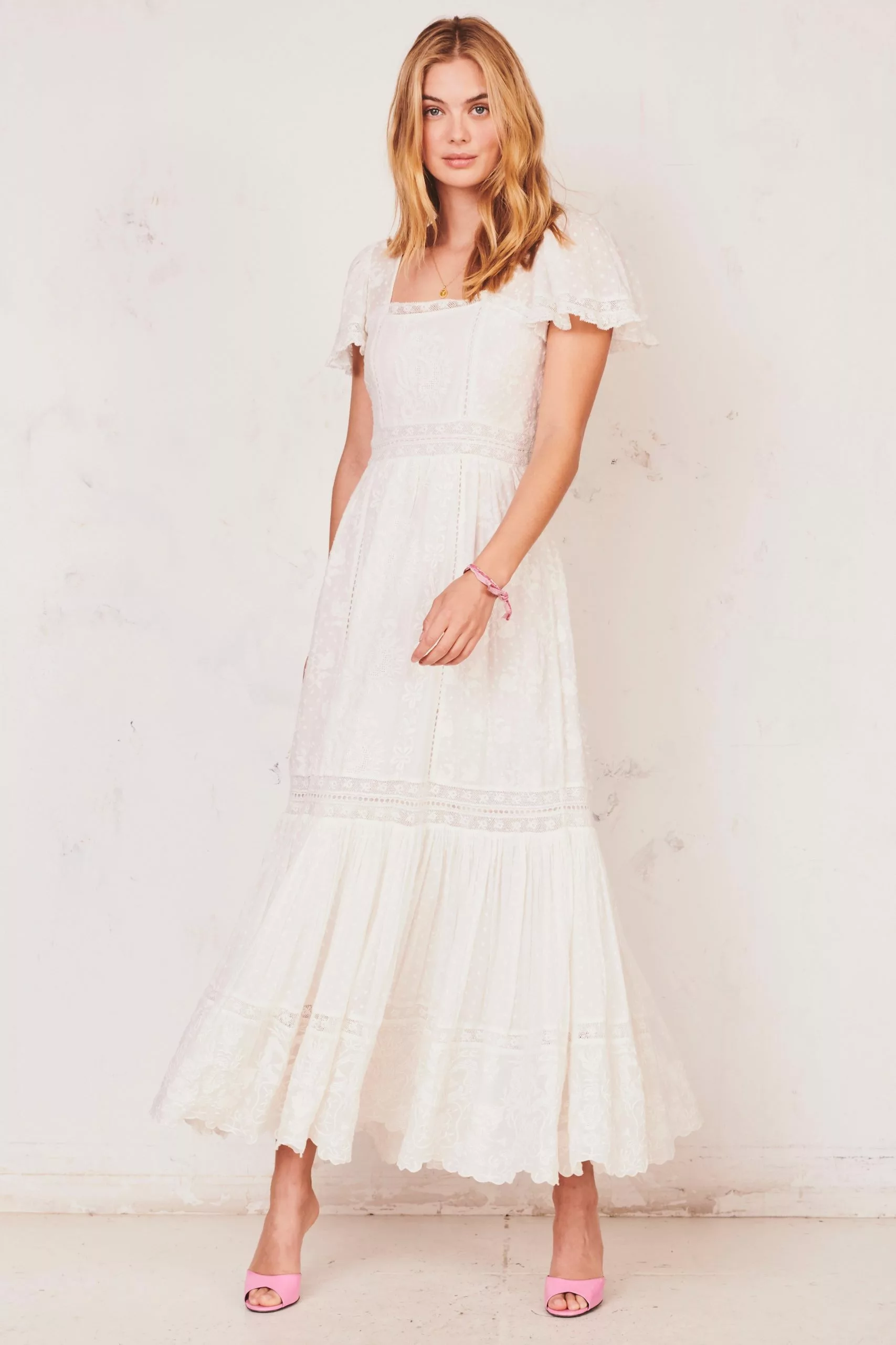 New this season, our Norma Dress romances in cotton with all-over dot and floral embroidery. Lace trims the square neckline and flutter sleeves. At center front, on the bodice and skirt, are panels of lofty sunflower embroidery. The princess seams and waist feature inset lace details. The full sweep skirt lets out into a shirred flounce at bottom with a scalloped edge. Invisible zipper at wearer’s left. Shown here in White.