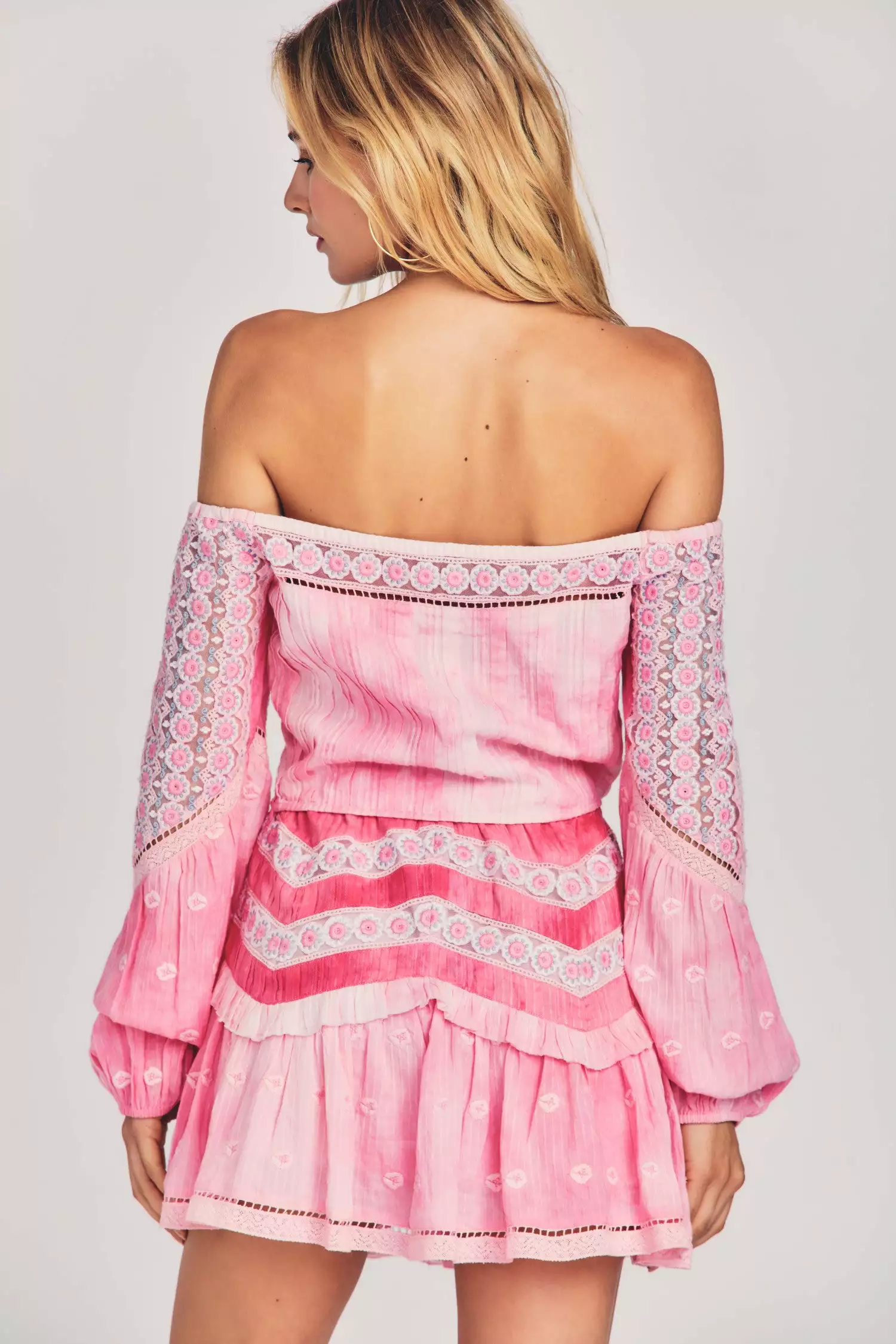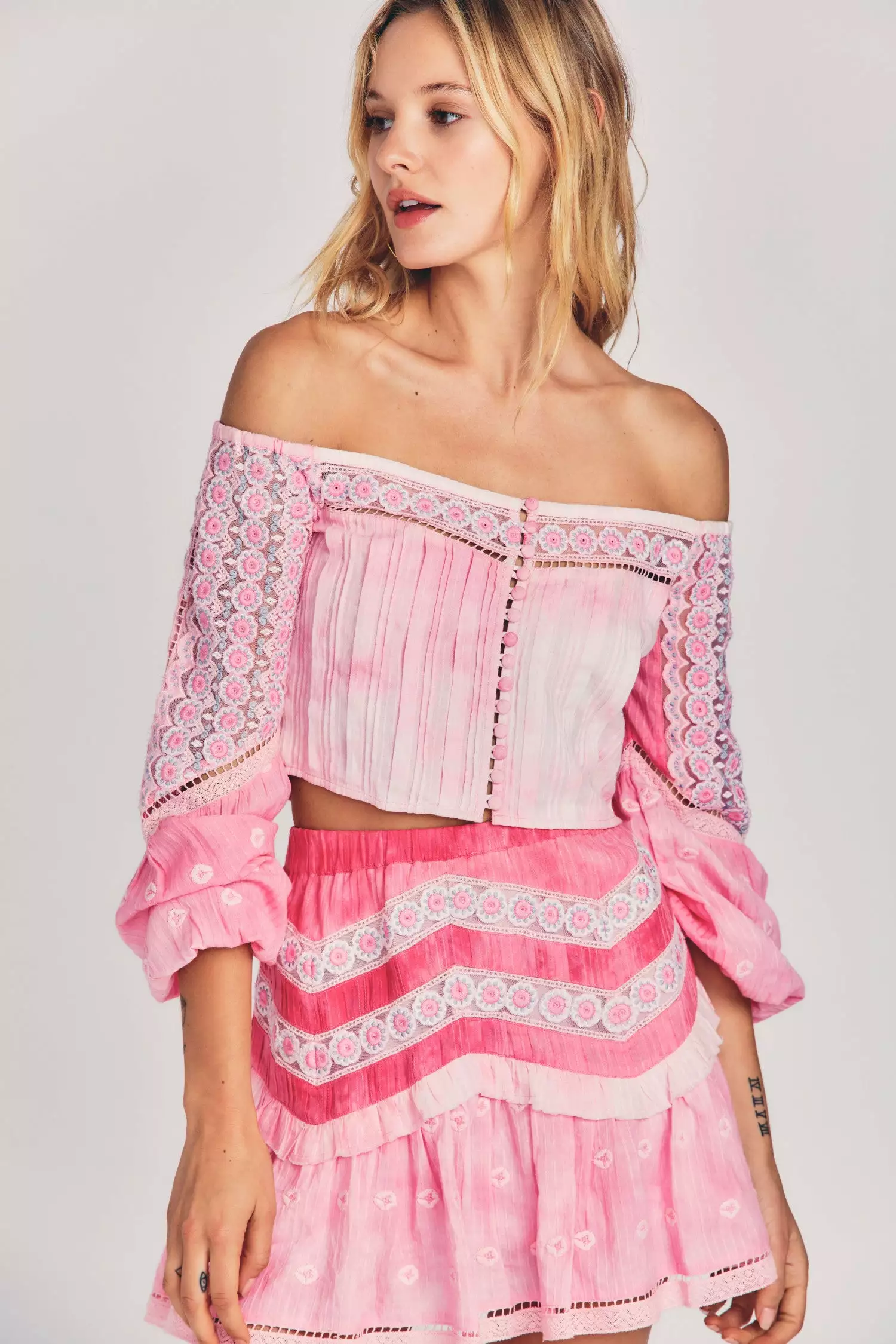 Our Perris Cropped Top harkens to another era in 100% hand tie-dyed cotton with pintucking and lace, combined with panels of contrast multicolored floral embroidery on tulle. This elaborate, cropped, off-the-shoulder blouse features buttons and loops down center front and encased elastic at the shoulders and sleeve openings. Wear it as a set with our Felice Mini Skirt. Shown here in Pink Zinnia.