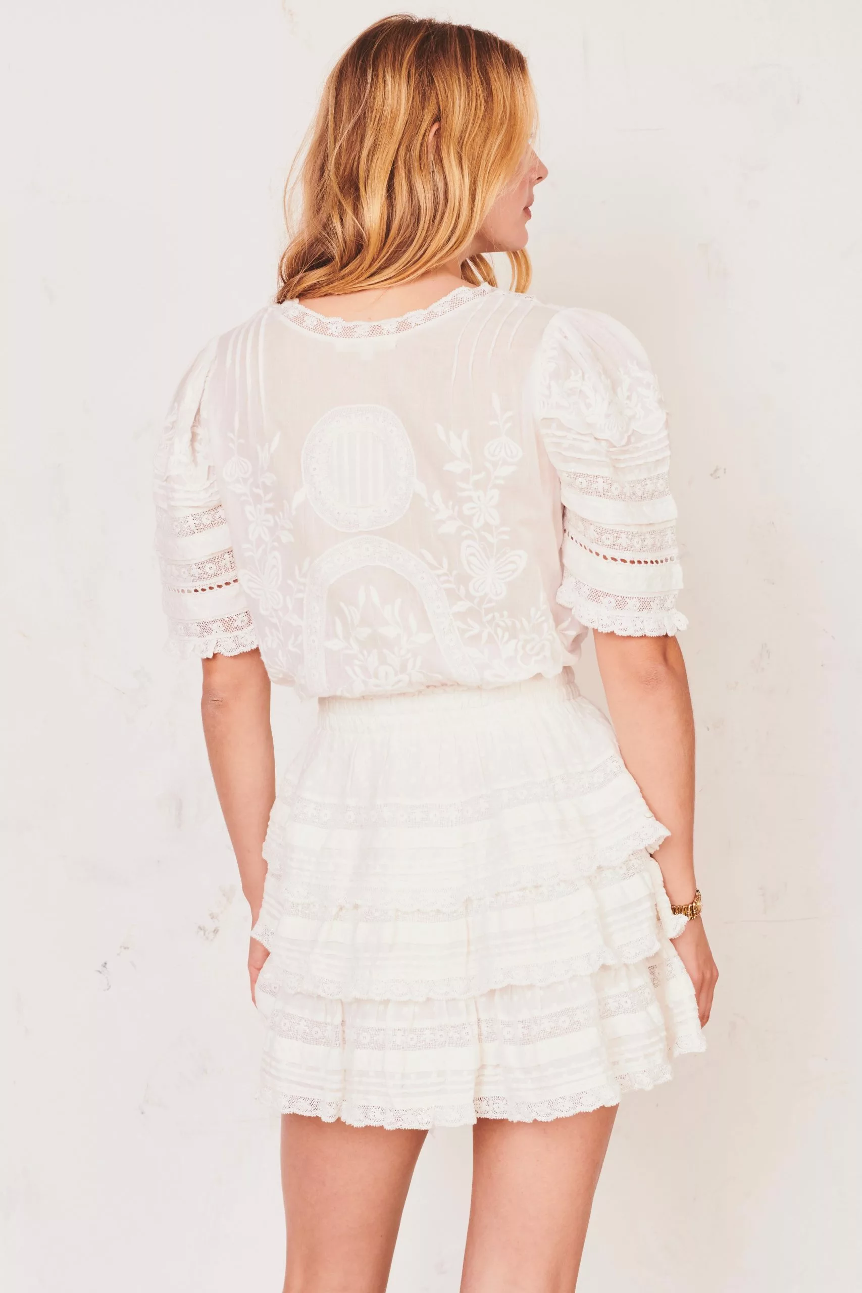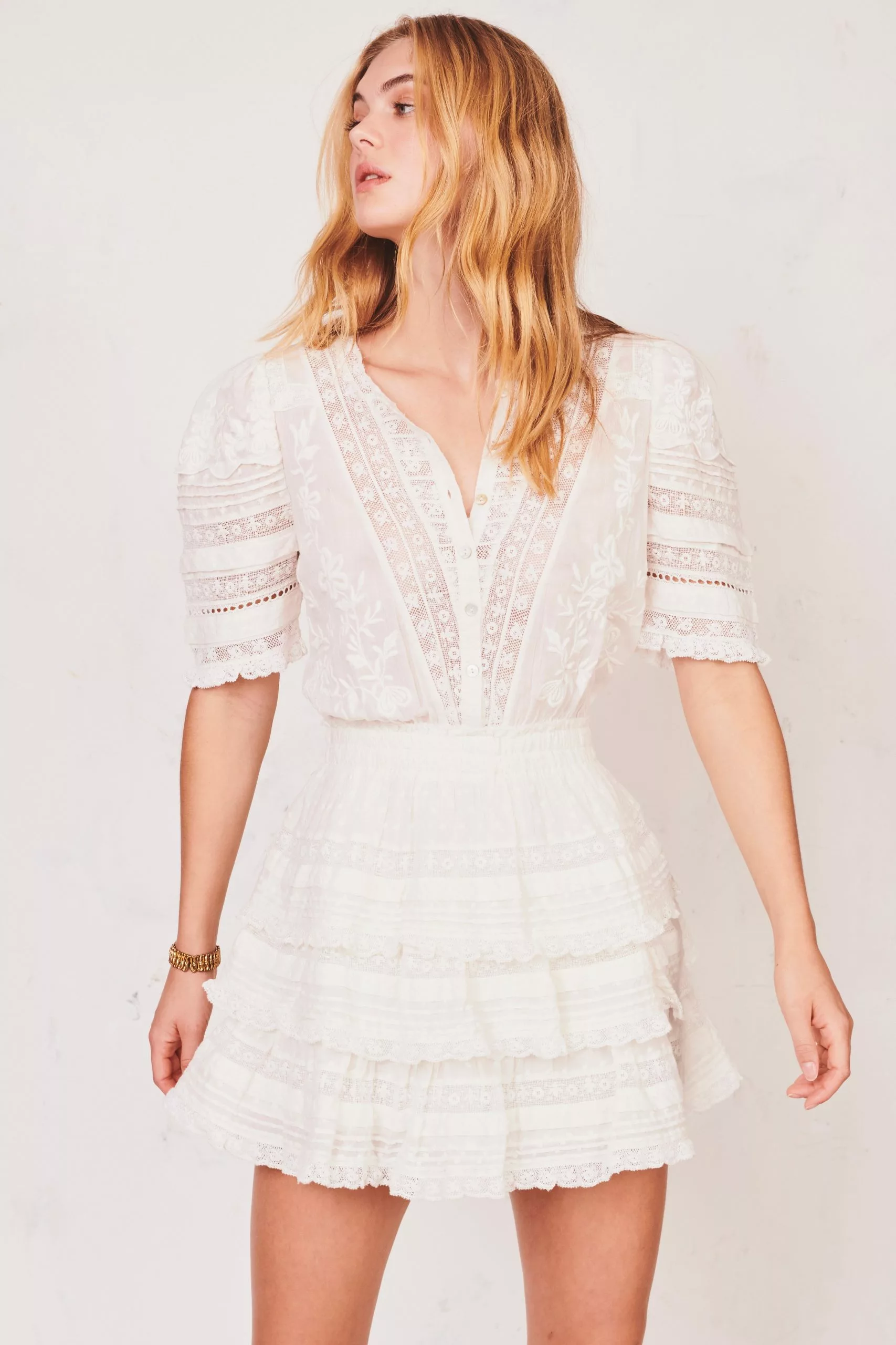 Our classic Quincy Dress is an instant staple in cotton with lofty floral sunflower embroidery and panels of inset embroidered lace. This mini frock has an inset lace yoke and functional pearlescent buttons at the center front. The sleevesβpuffed at the cap, but tapered down the armβfeature bud embroidery panels and a threaded satin ribbon detail. Under a shirred elastic waistband, the skirt lets out into three pin-tucked flounces. Shown here in White.