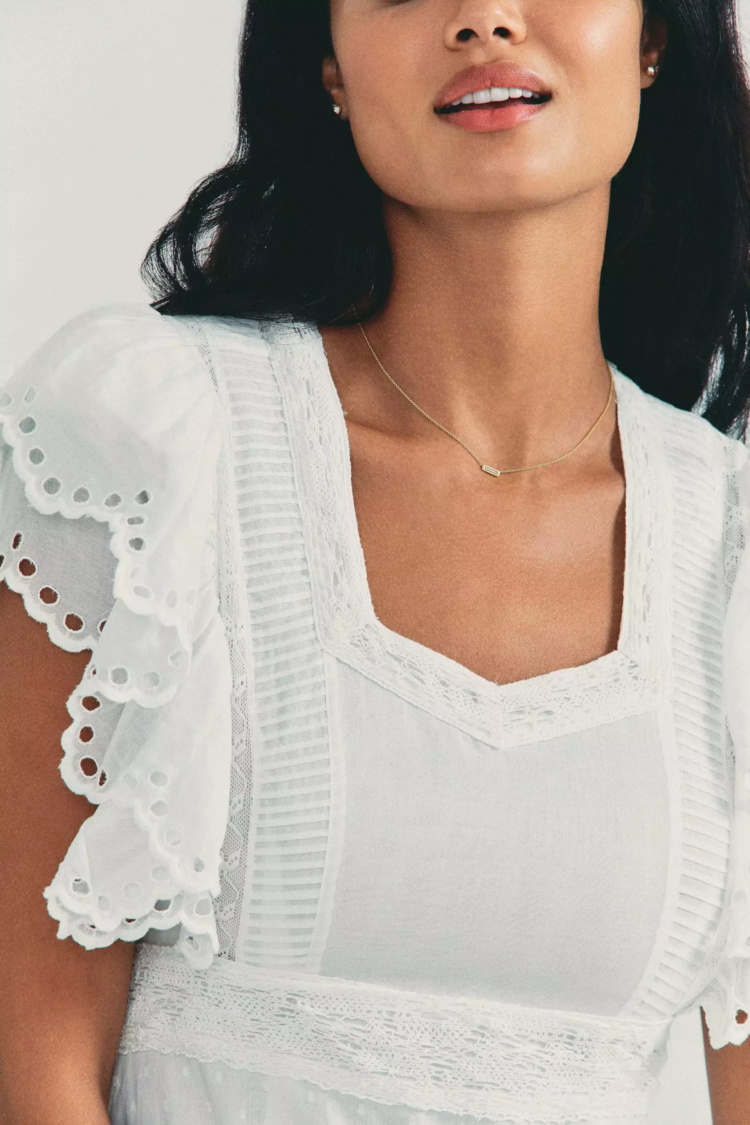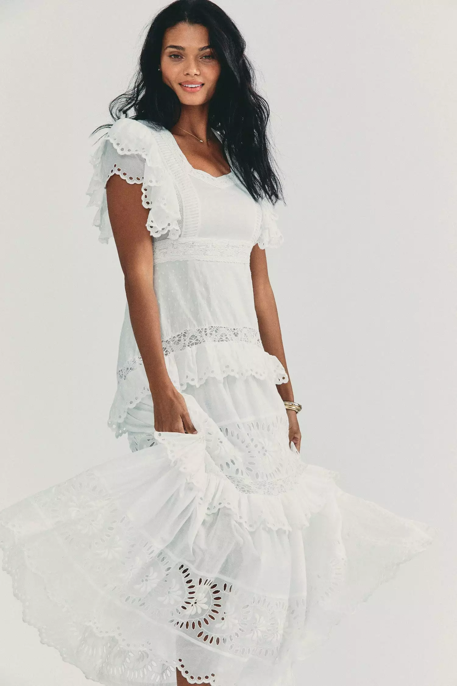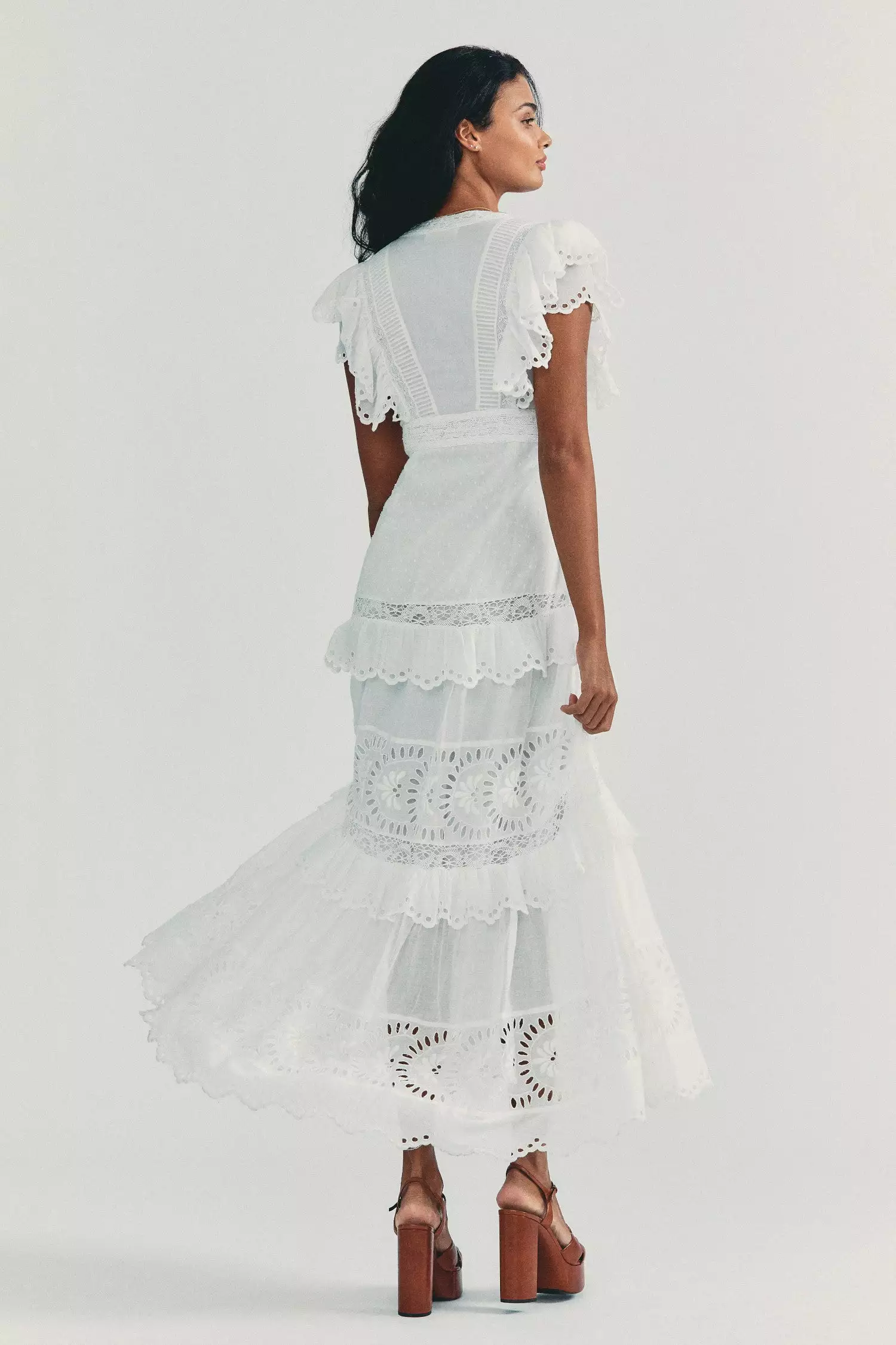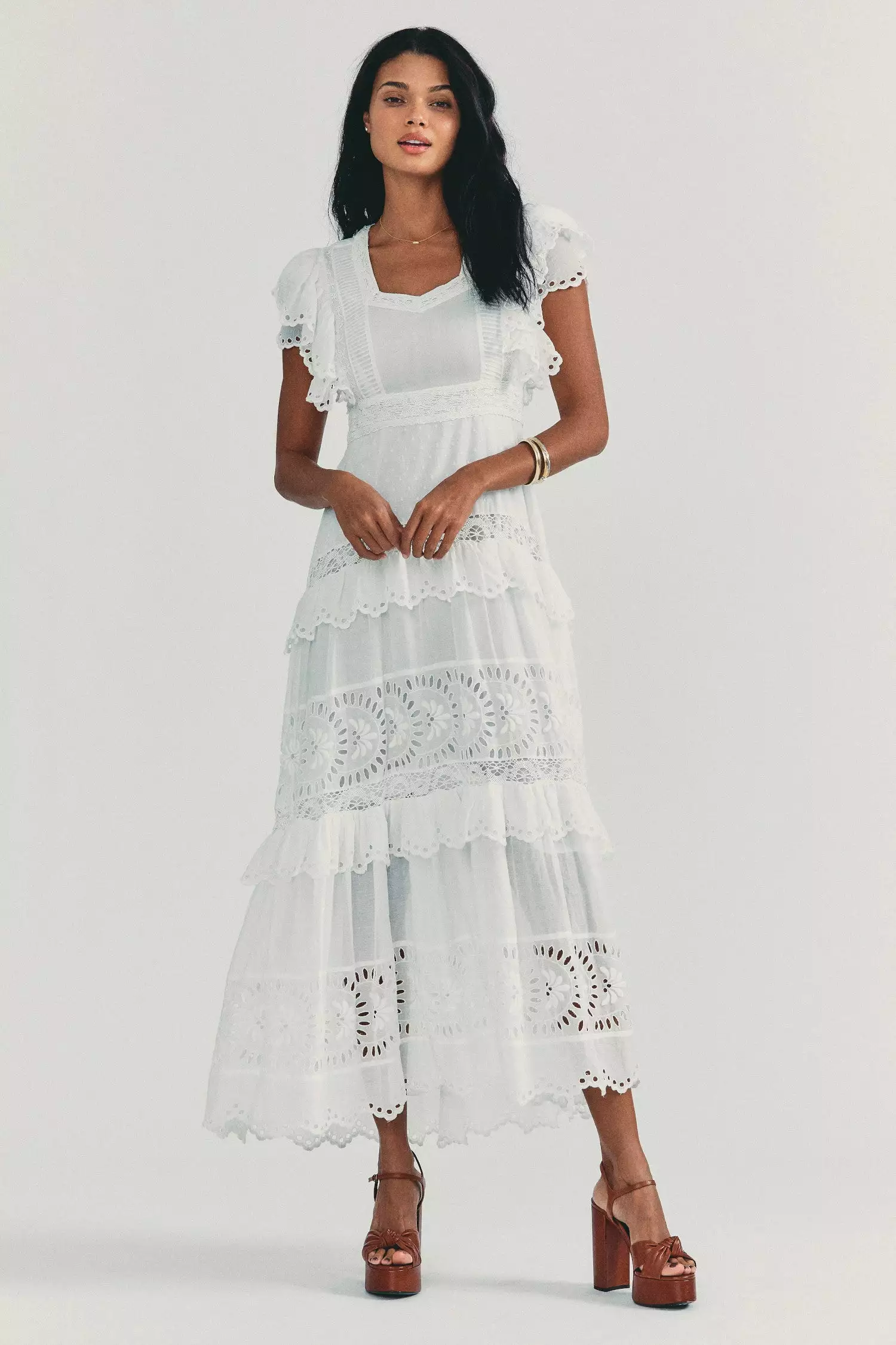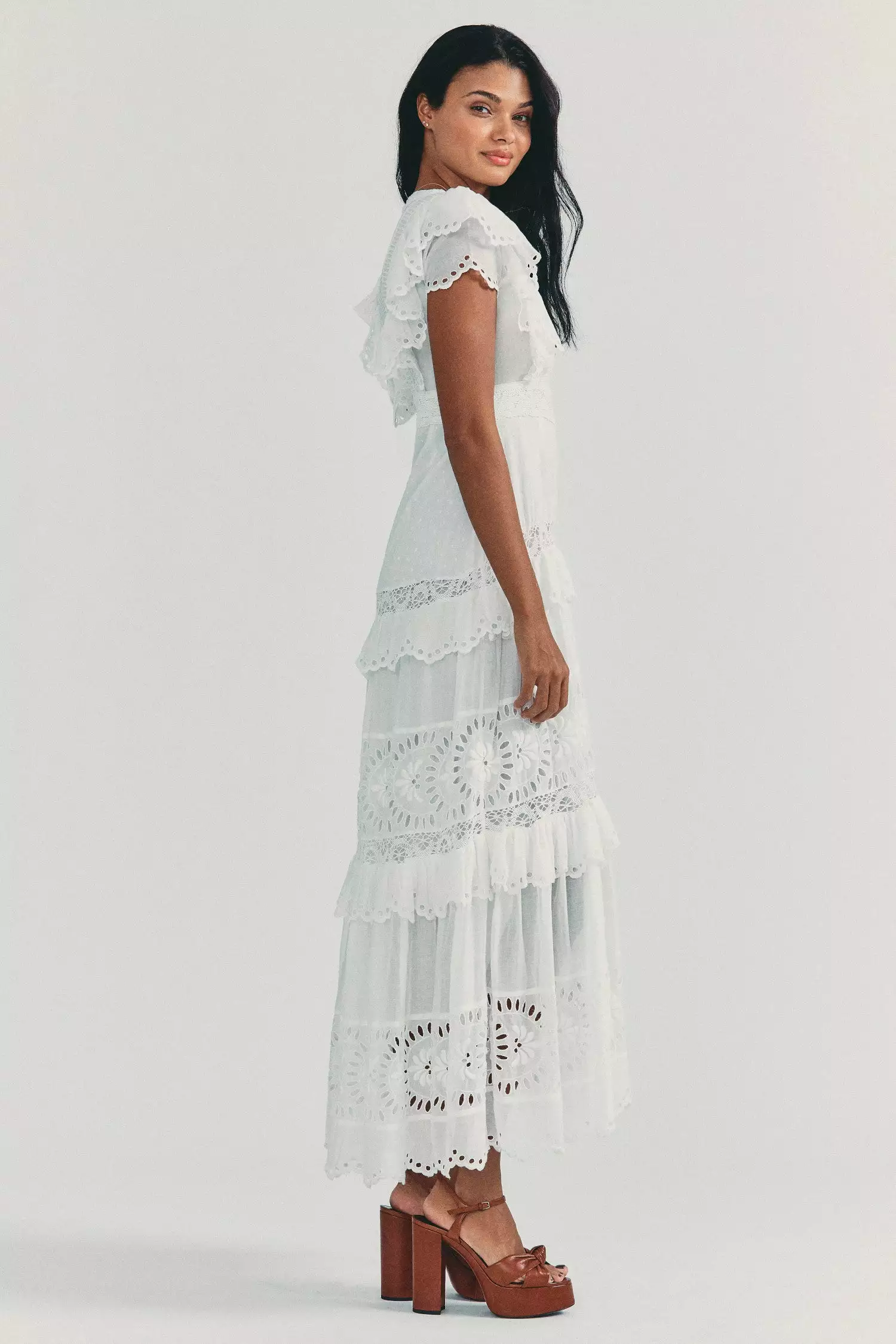 Our Rinny Skirt sweeps in with botanical eyelet embroidery, pintucking and custom lace on Swiss dot cotton. Below a sweetheart neckline, framed by an overlapping ruffle detail atop cap sleeves, the bodice is fitted to a fixed empire waist. Below, the slim skirt falls to repeating panels and, finally, a scalloped high-low hem. Invisible zipper at wearer’s left. Shown here in White.Β ο»Ώ*Please note that this style runs small.