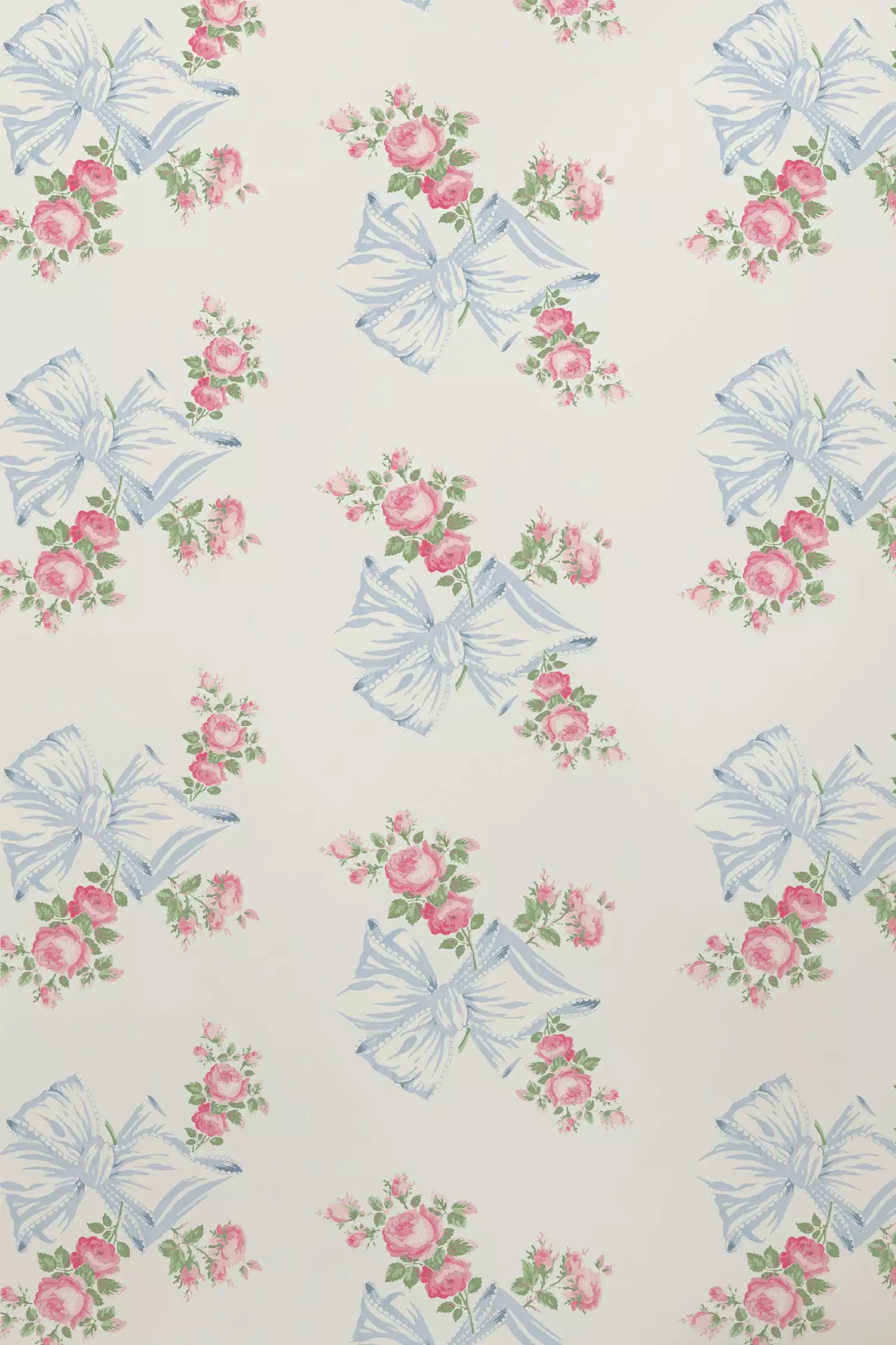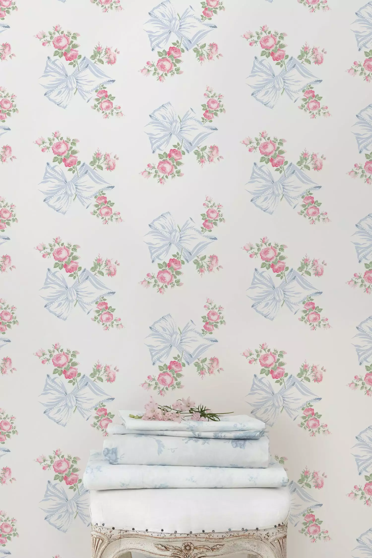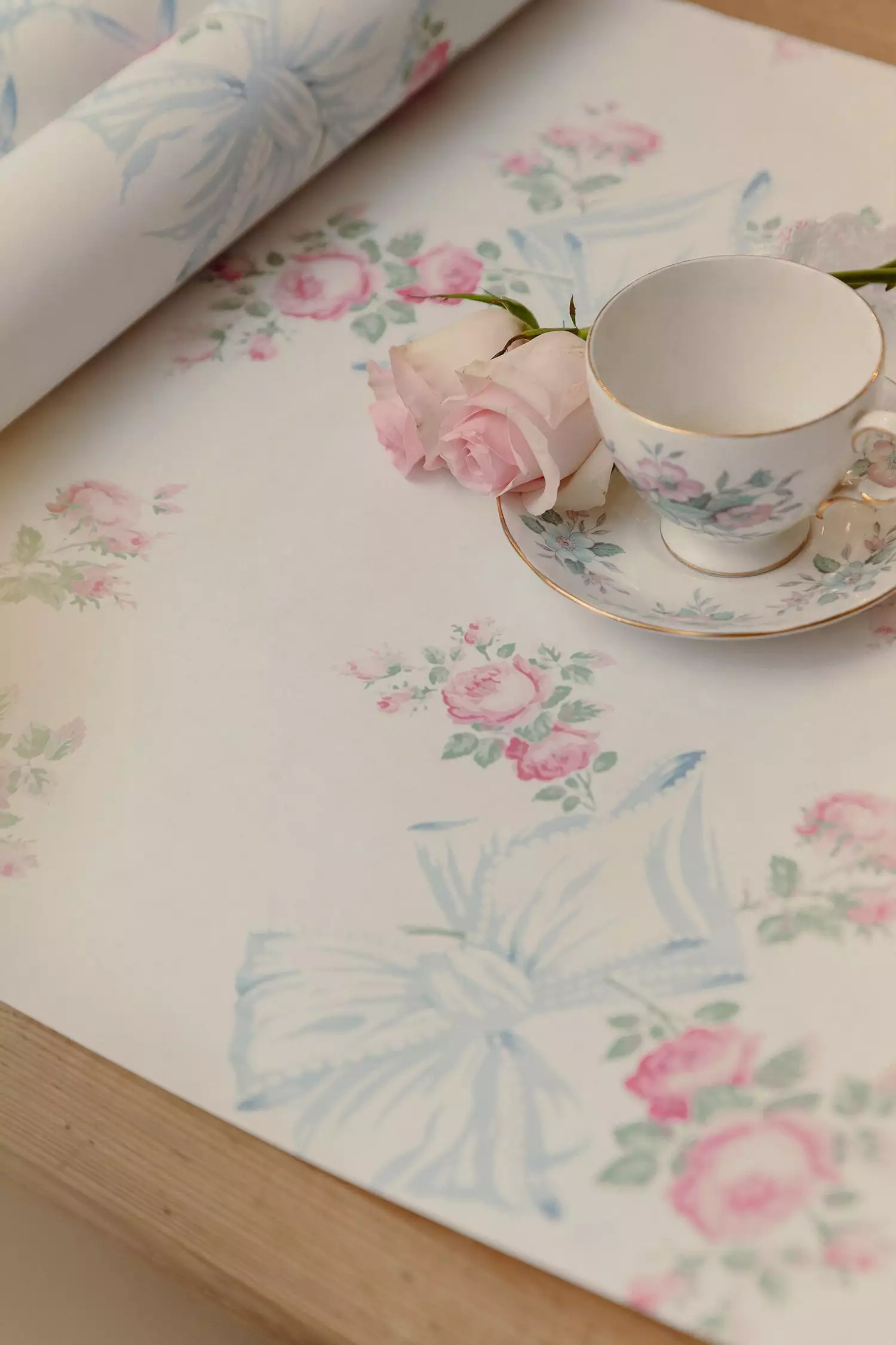 This vintage-inspired design offers both soft femininity and southern charm. Loopy blue bows loosely tie together clusters of pink cabbage roses. Each roll measures 20.5” x 33′. Mix and match with our Rosa Beaux Quilt & Sham Set or our La Vie En Rose Quilted Duvet Cover & Sham Set. Shown here in Pastel Blue.