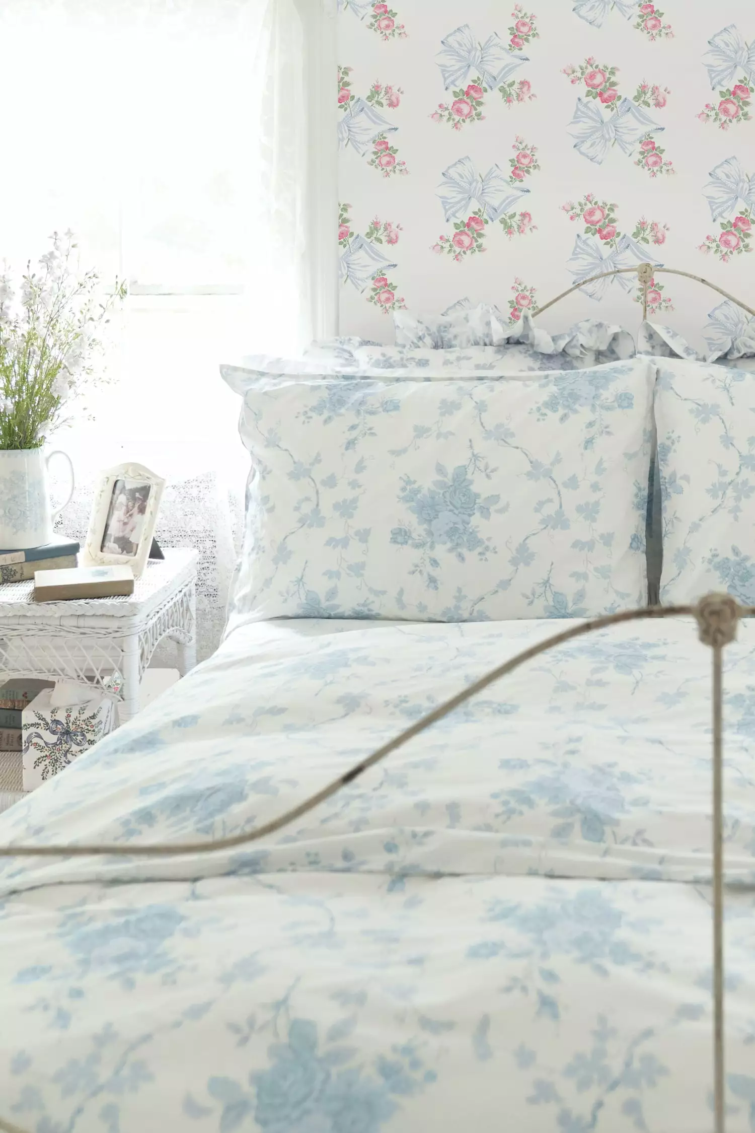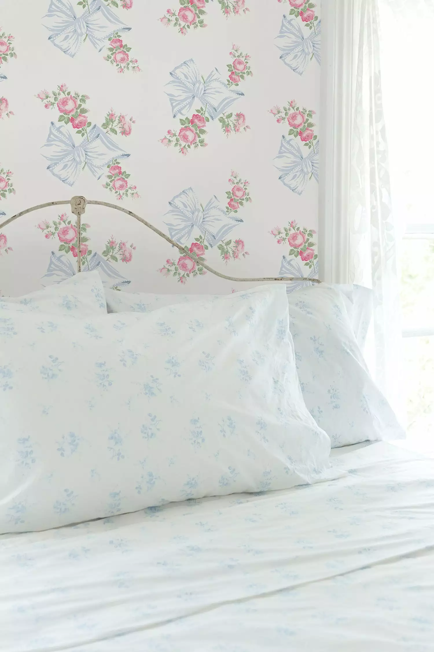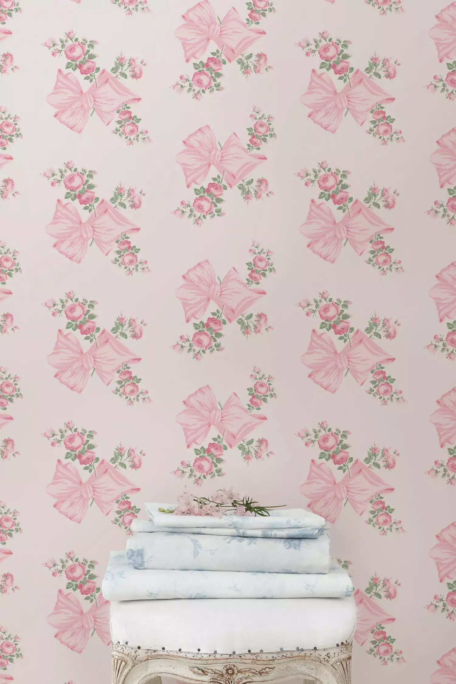 This vintage-inspired design offers both soft femininity and southern charm. Loopy blue bows loosely tie together clusters of pink cabbage roses. Each roll measures 20.5” x 33′. Mix and match with our Rosa Beaux Quilt & Sham Set or our La Vie En Rose Quilted Duvet Cover & Sham Set. Shown here in Pastel Blue.