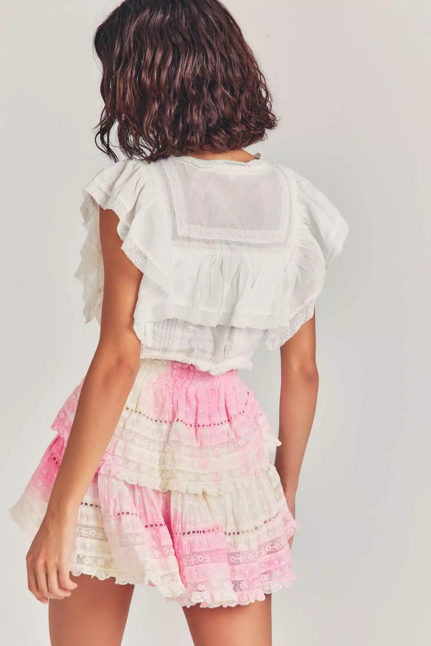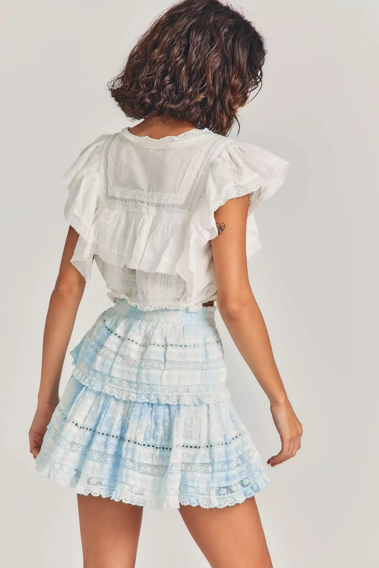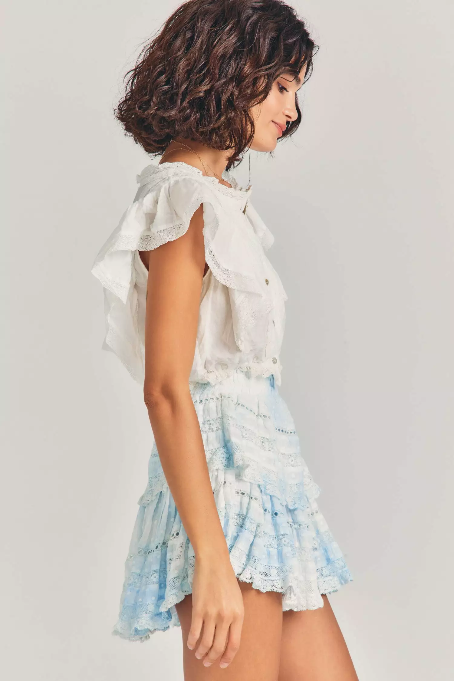 Our signature Ruffle Mini Skirt is back in a sheer hand tie-dye with lining beneath. The two-tiered short skirt, with an elasticated waistband and shirred flounces, dances along with you as you move throughout the world. Pair it with our Nora Top.